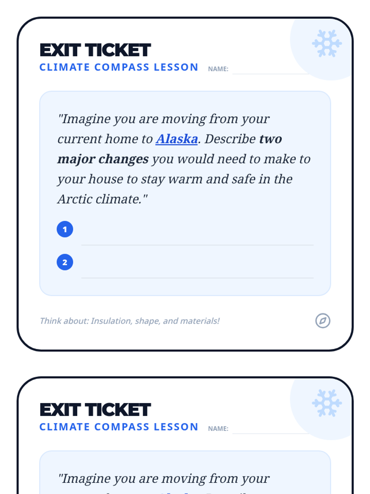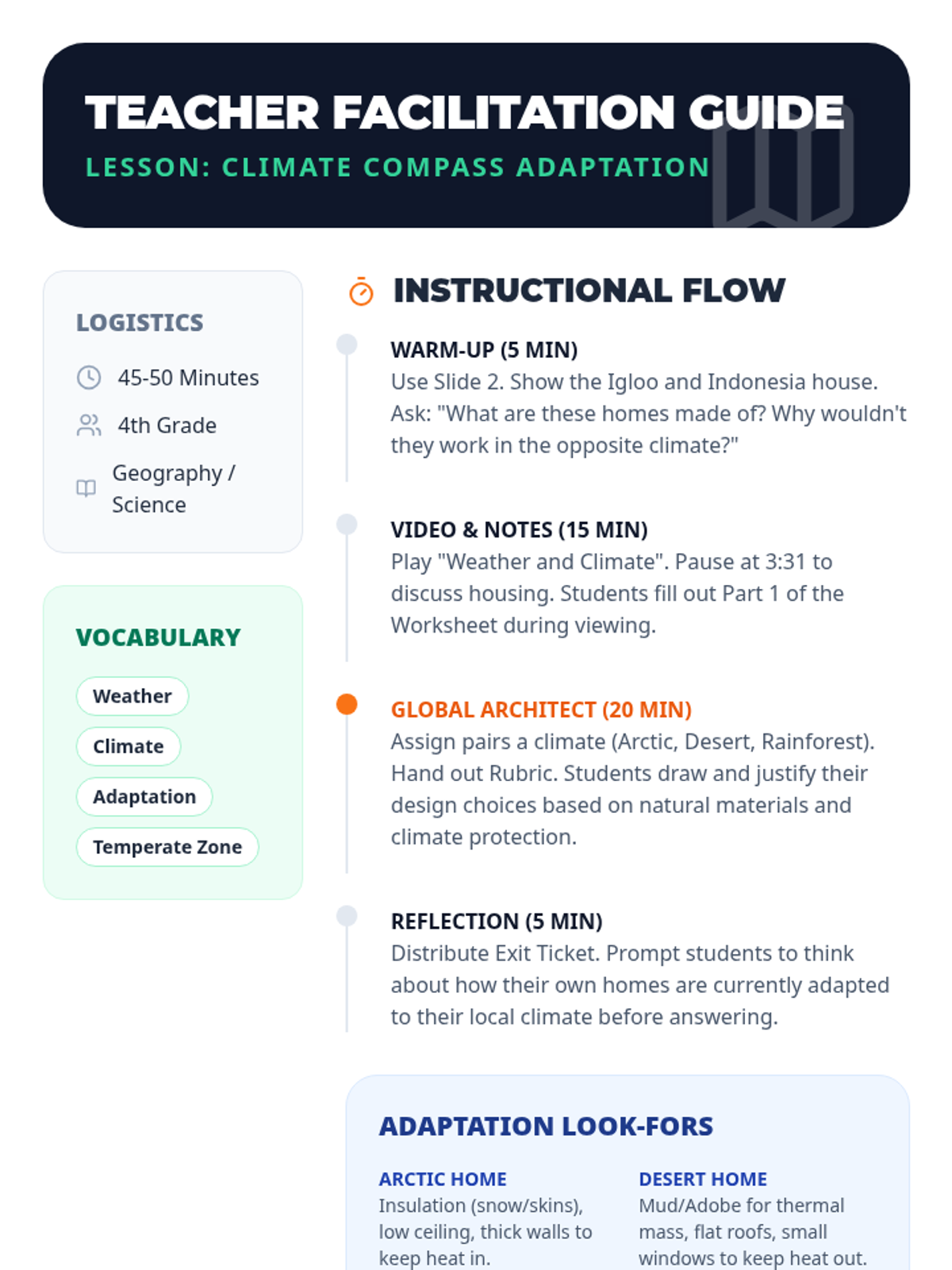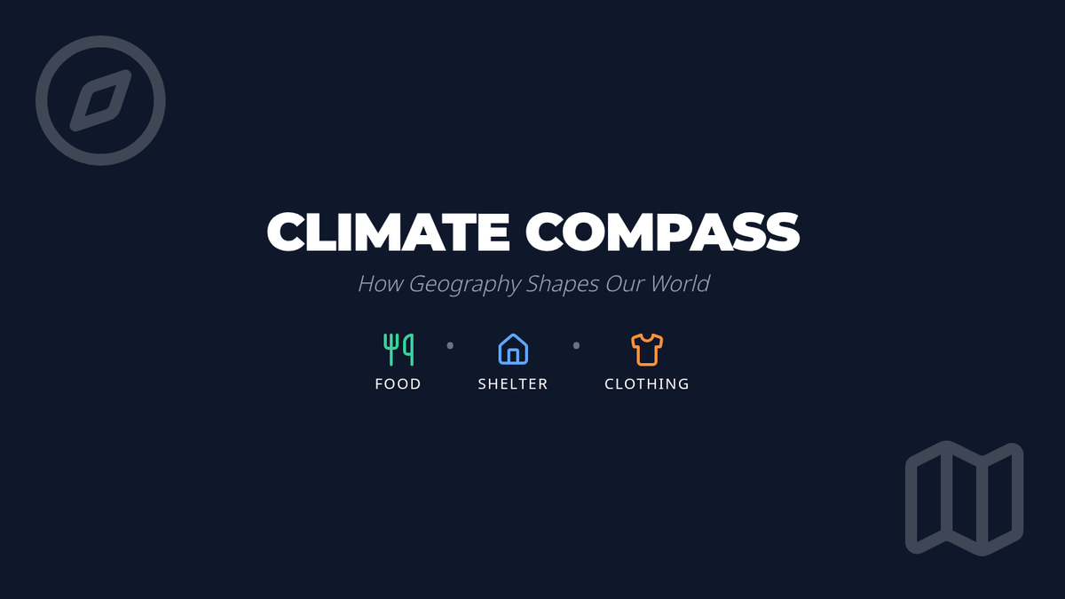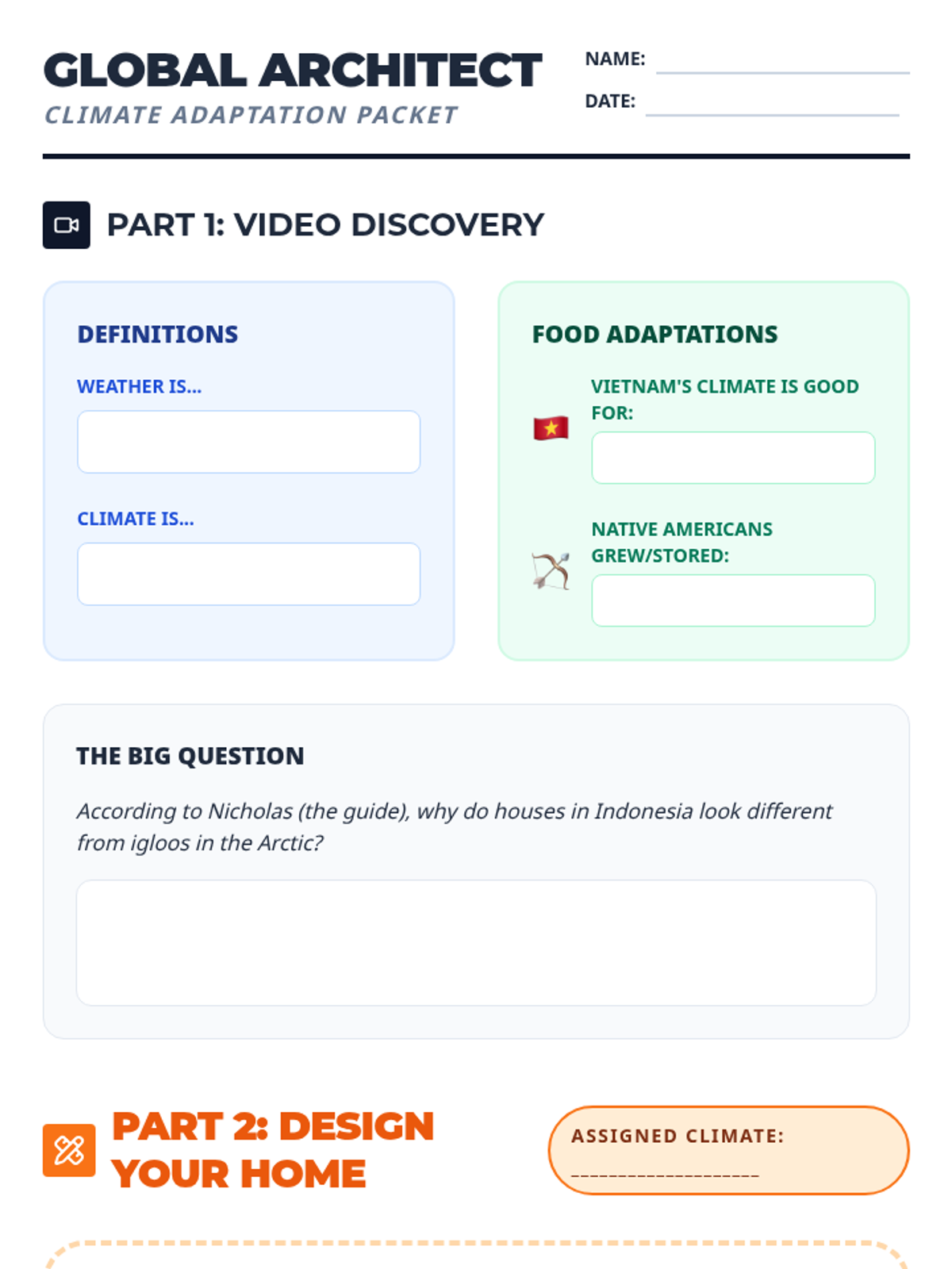 A 4th-grade geography lesson exploring how climate shapes human adaptation through food, clothing, and architecture. Includes a video-based investigation and a creative design project called 'Global Architect'.