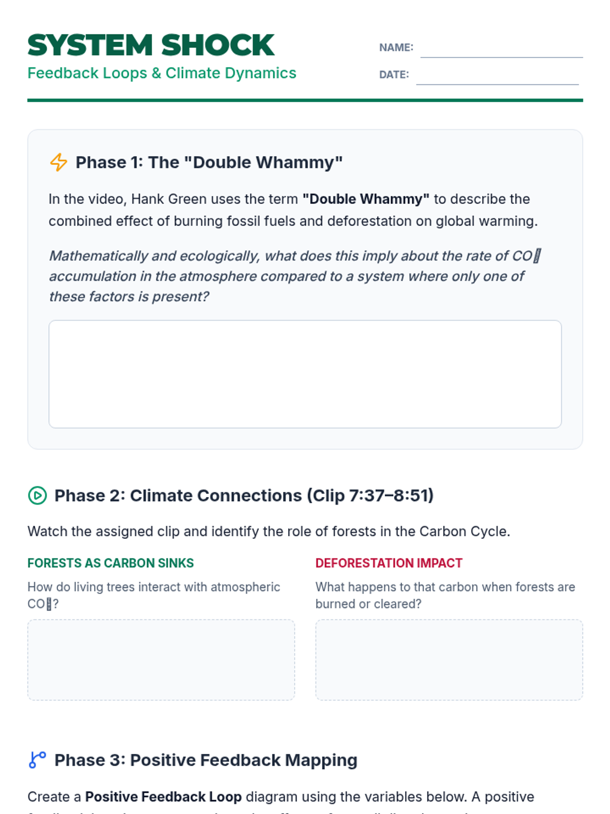 Students investigate the interconnected feedback loops of deforestation and climate change through a Crash Course Ecology video. They will diagram a positive feedback loop involving forest fires and CO2, then brainstorm negative feedback strategies to mitigate environmental impact.