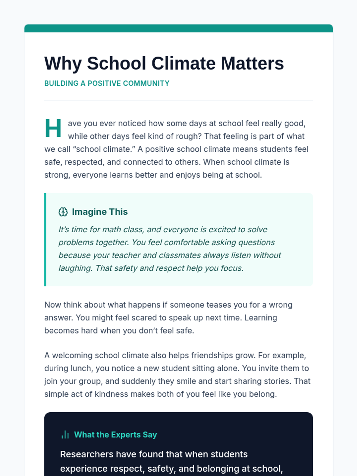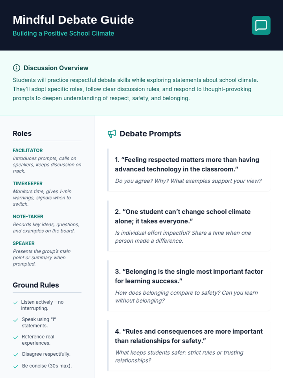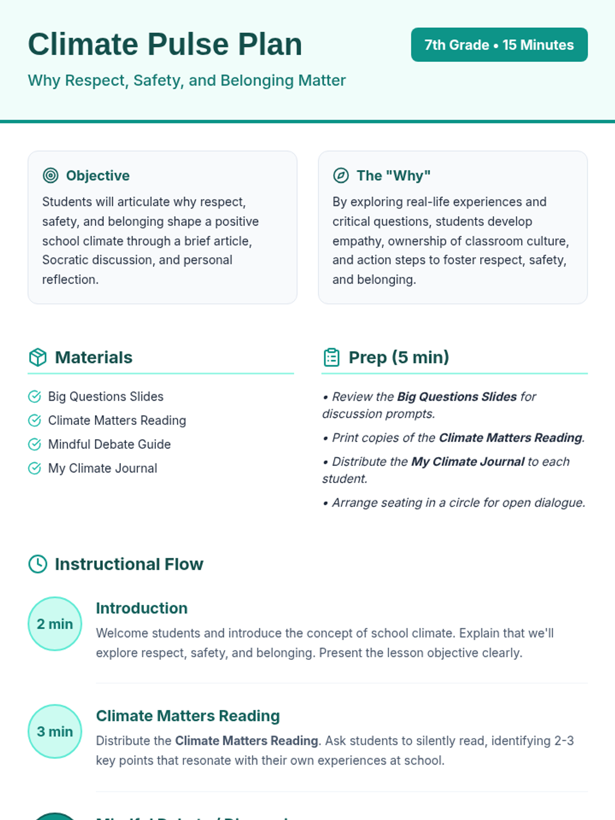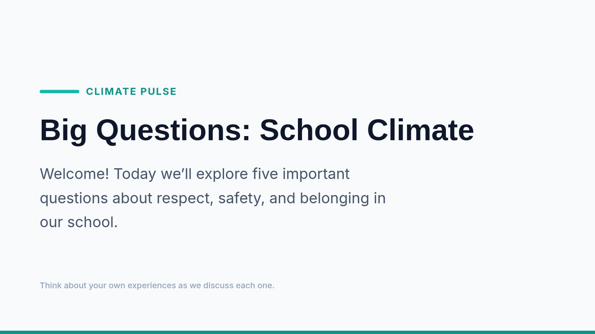 A 15-minute Tier 1 Socratic discussion for 7th graders to explore the importance of respect, safety, and belonging in creating a positive school climate.