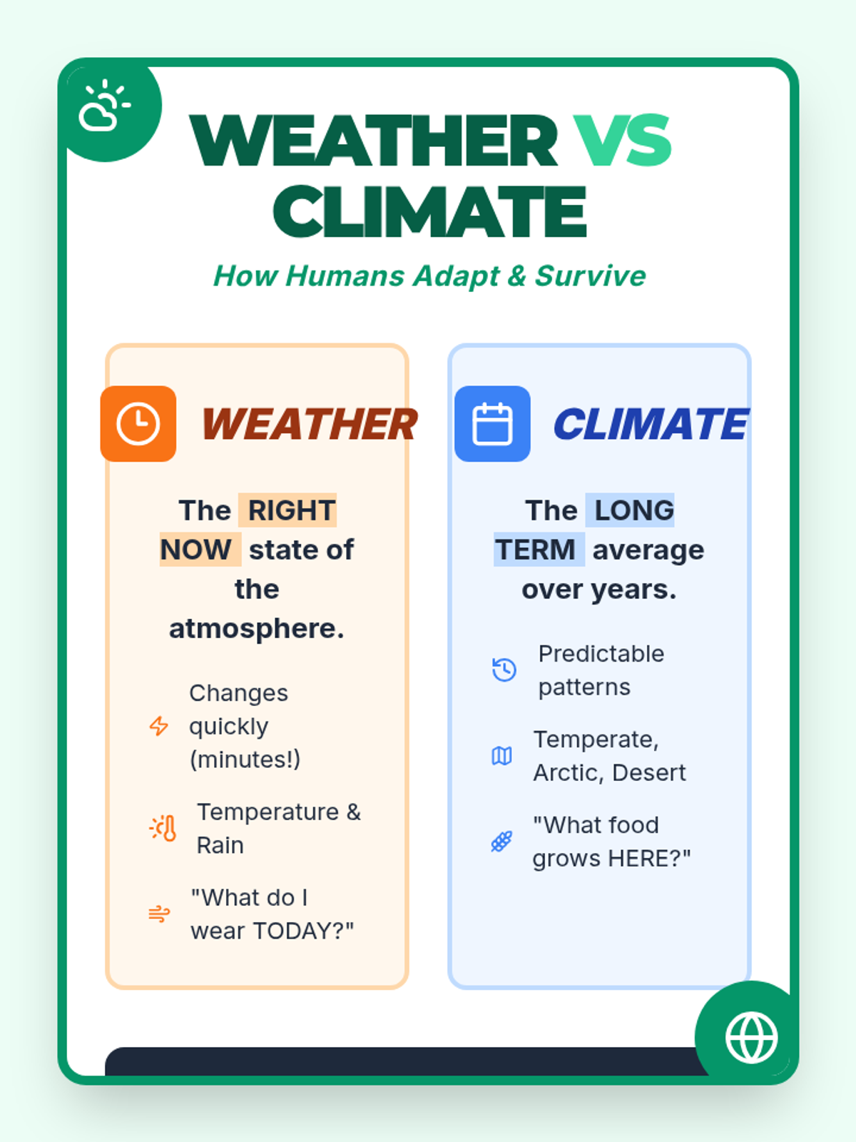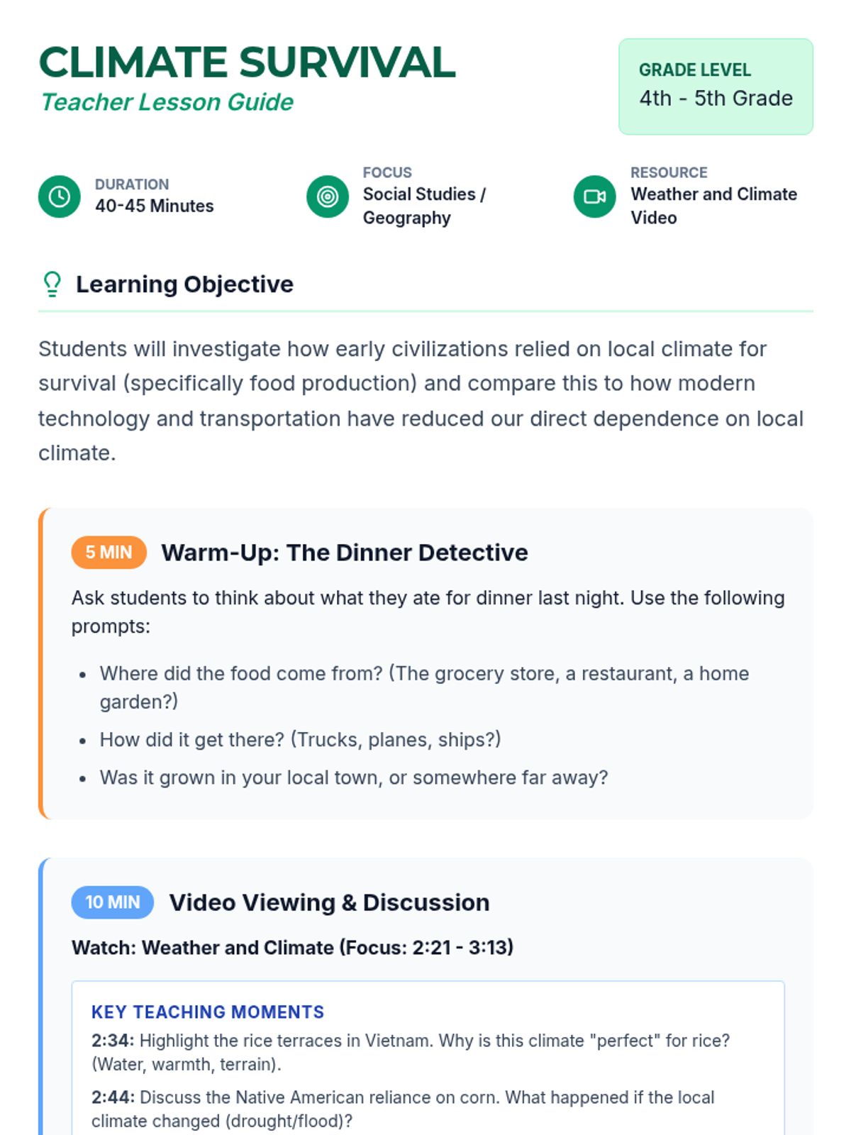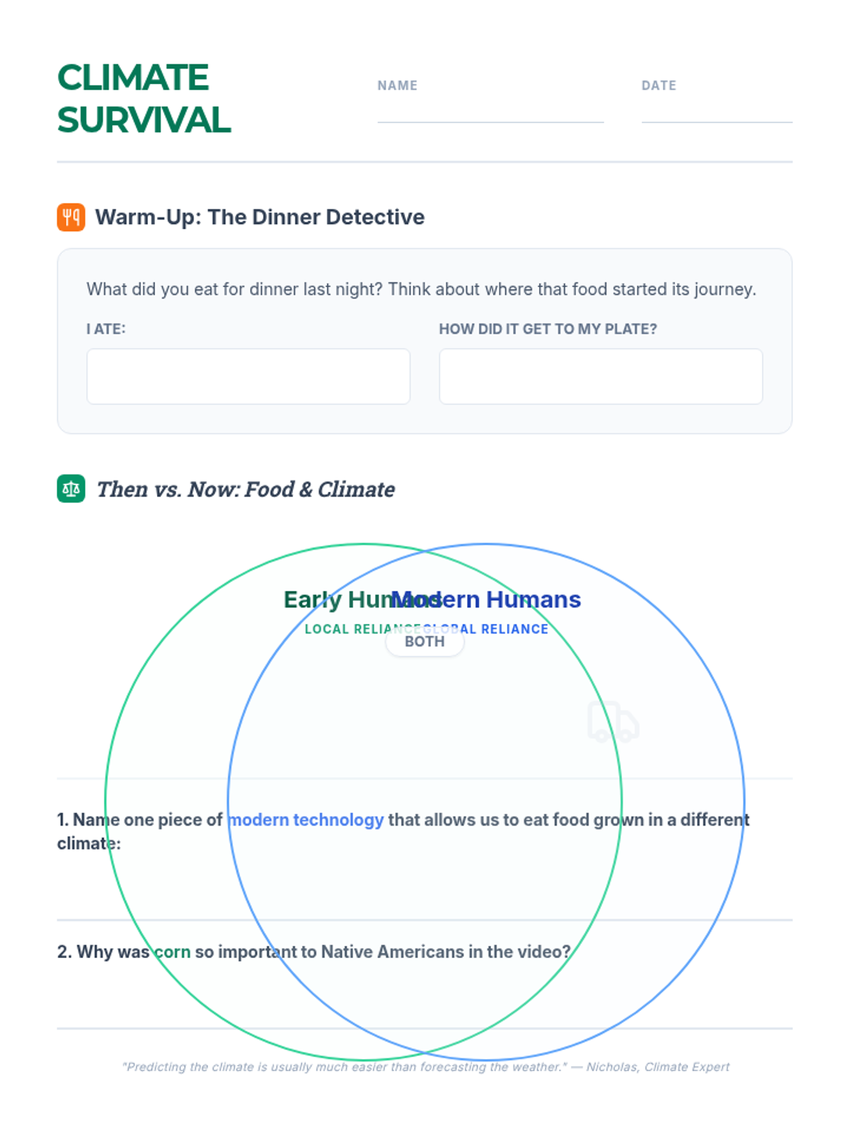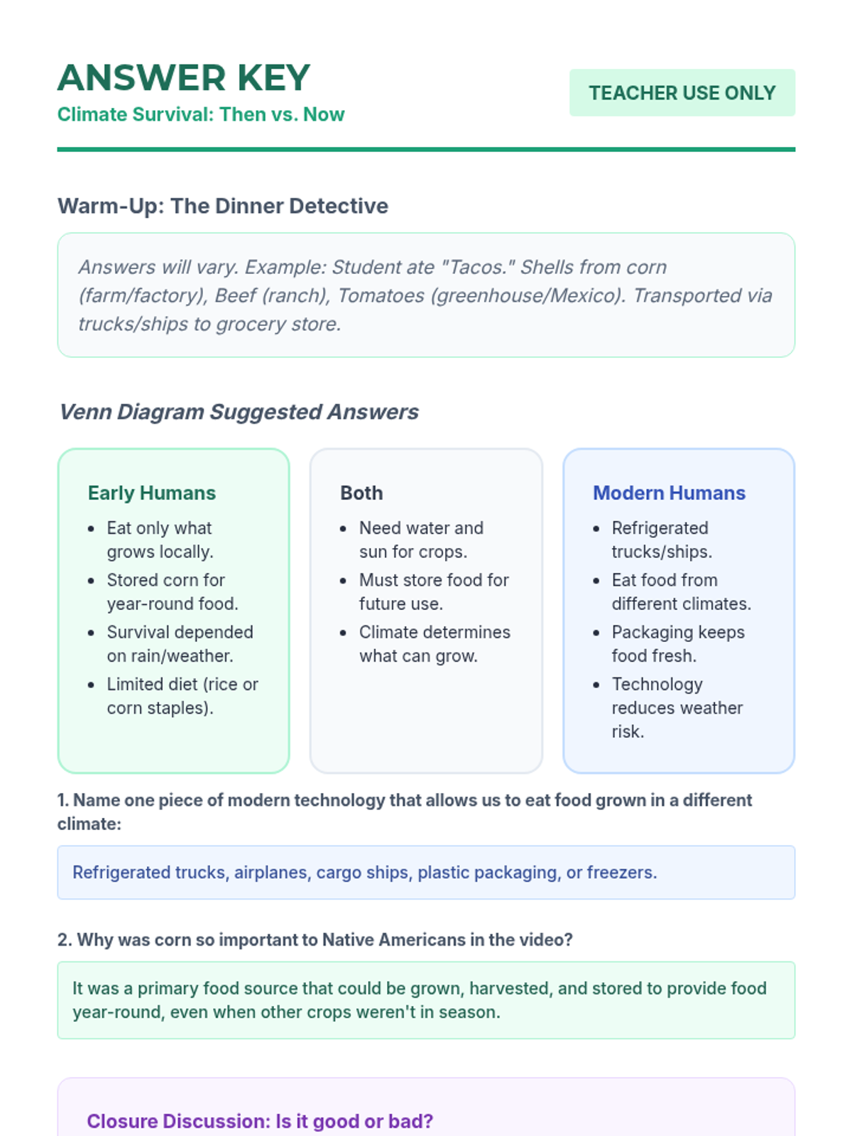 A social studies lesson for 4th-5th graders exploring the relationship between climate and survival, contrasting early civilizations' local food reliance with modern globalized technology.