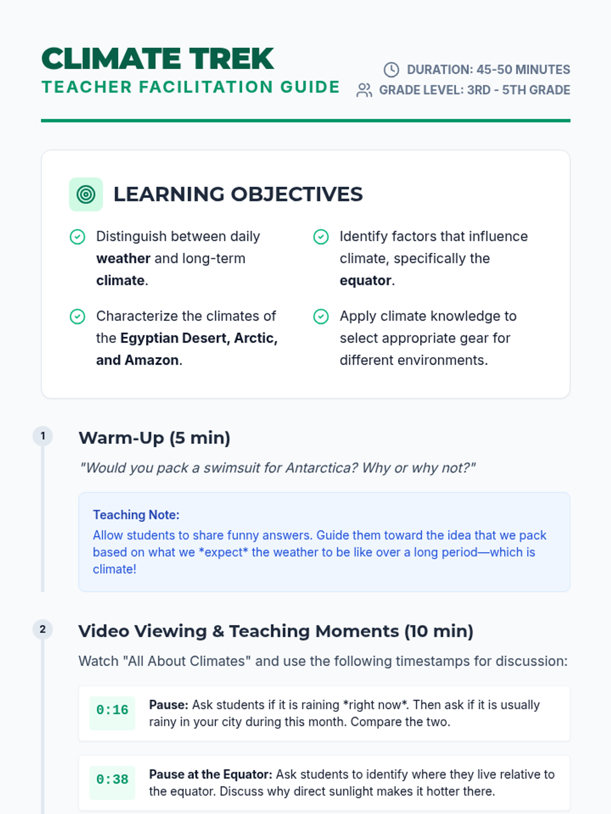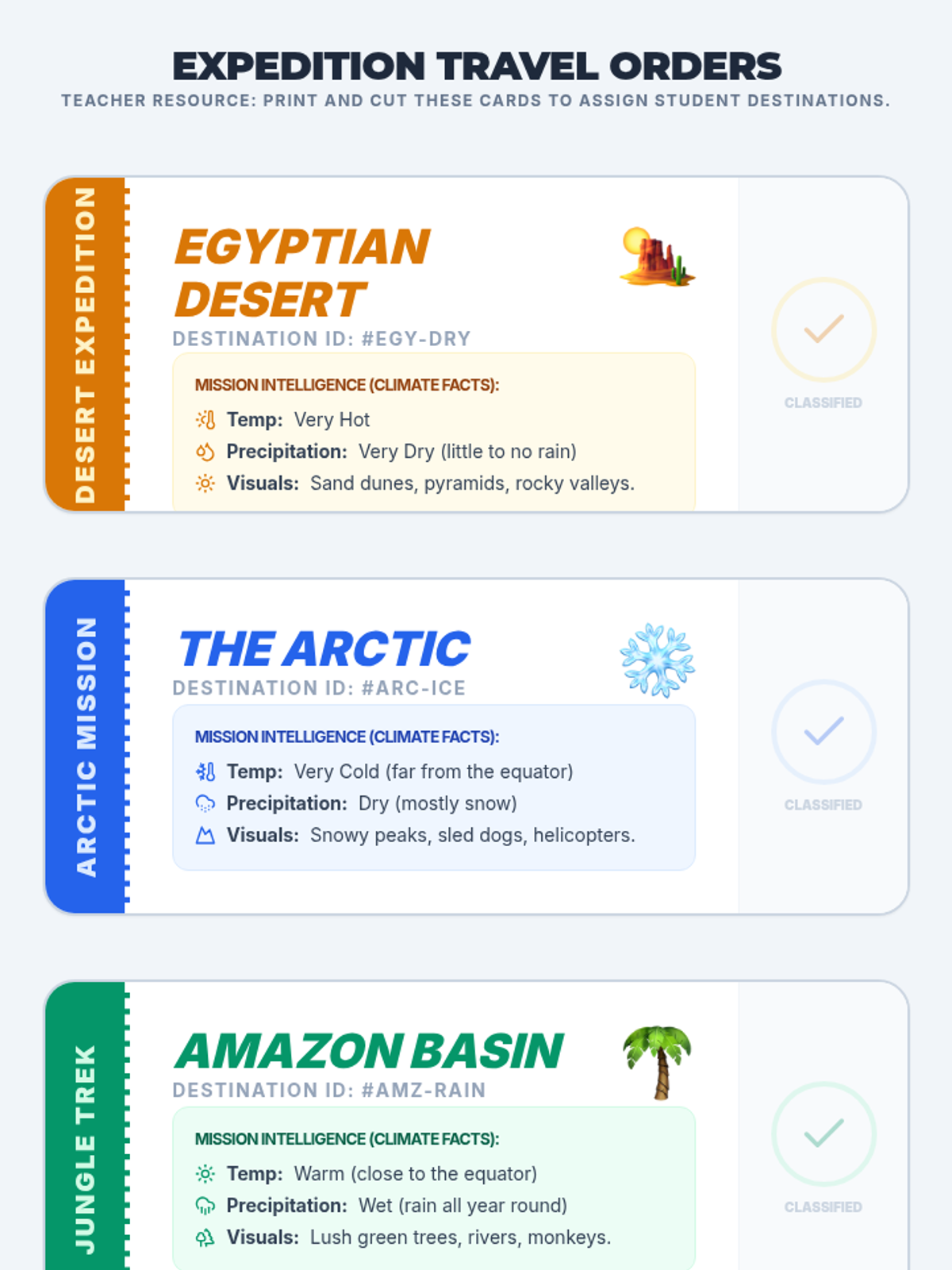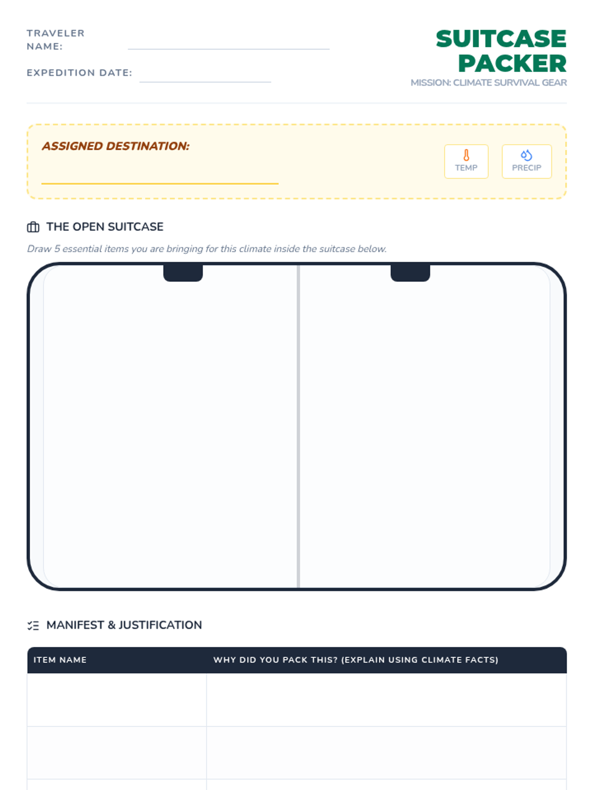 A creative geography and science lesson where students learn the difference between weather and climate and apply their knowledge by packing a suitcase for a specific global destination.