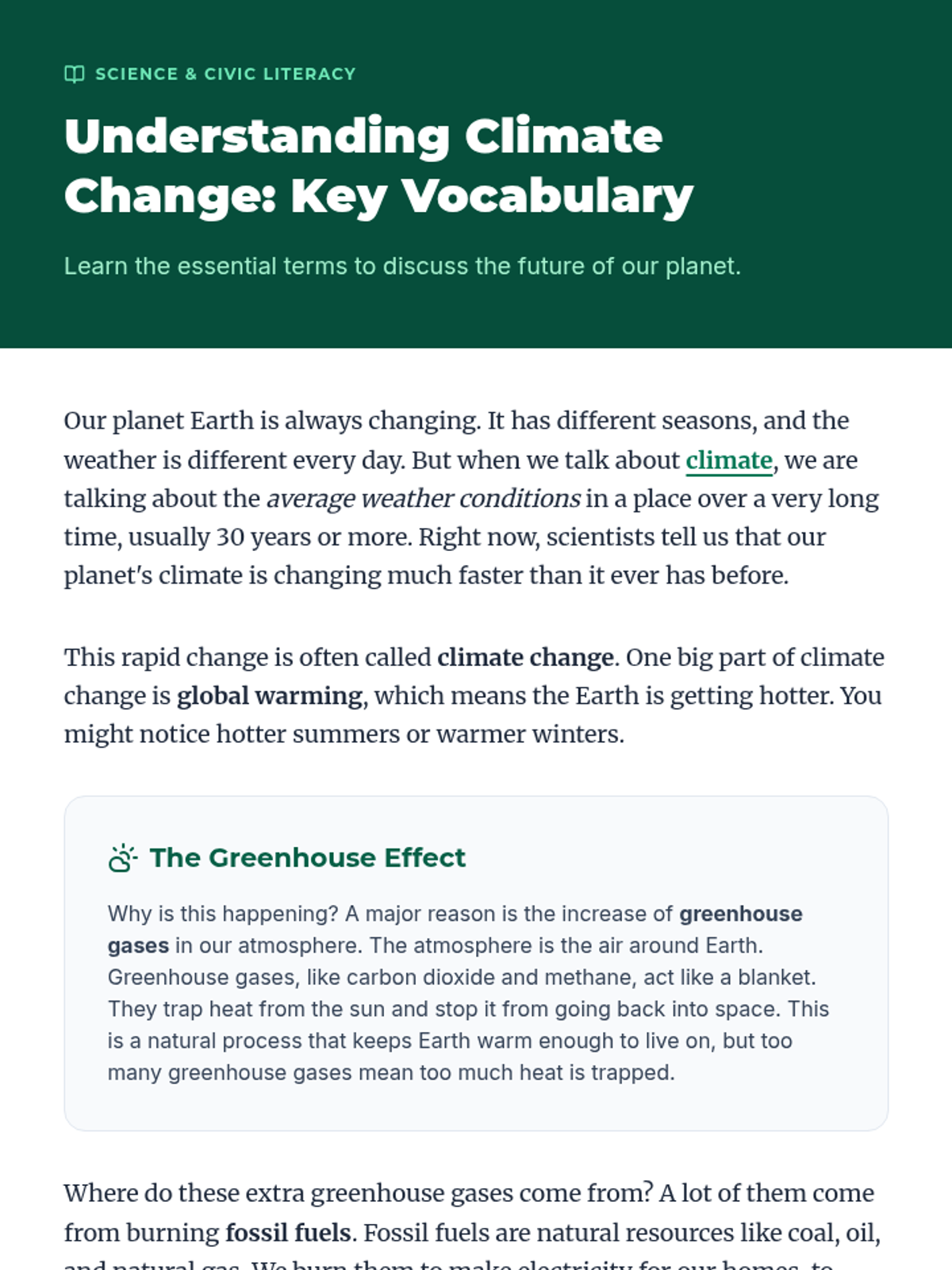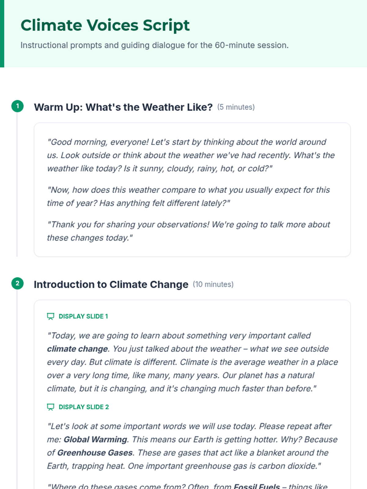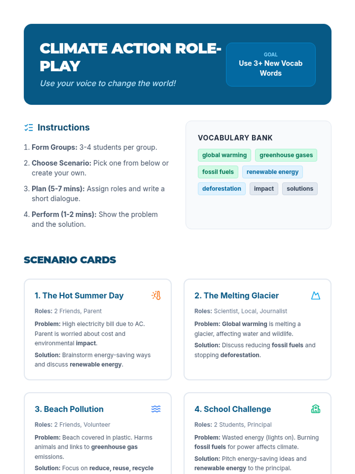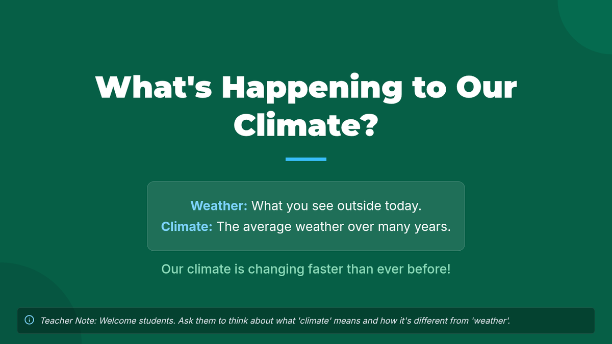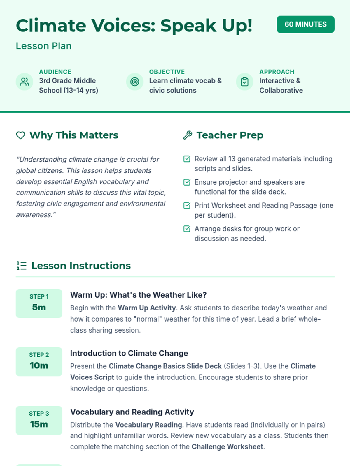 A 60-minute interactive lesson for 13-14 year old English language learners focused on climate change vocabulary, civic engagement, and collaborative problem-solving. Students explore causes, effects, and solutions through reading, role-play, and creative projects.