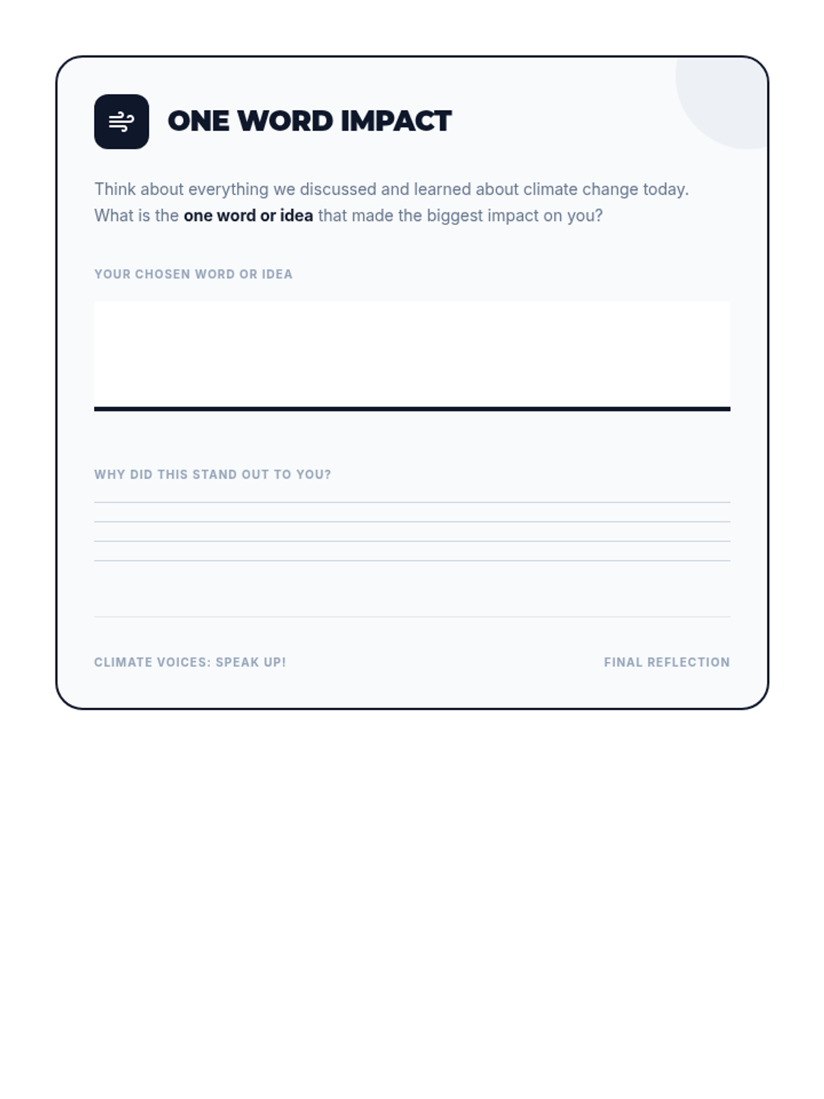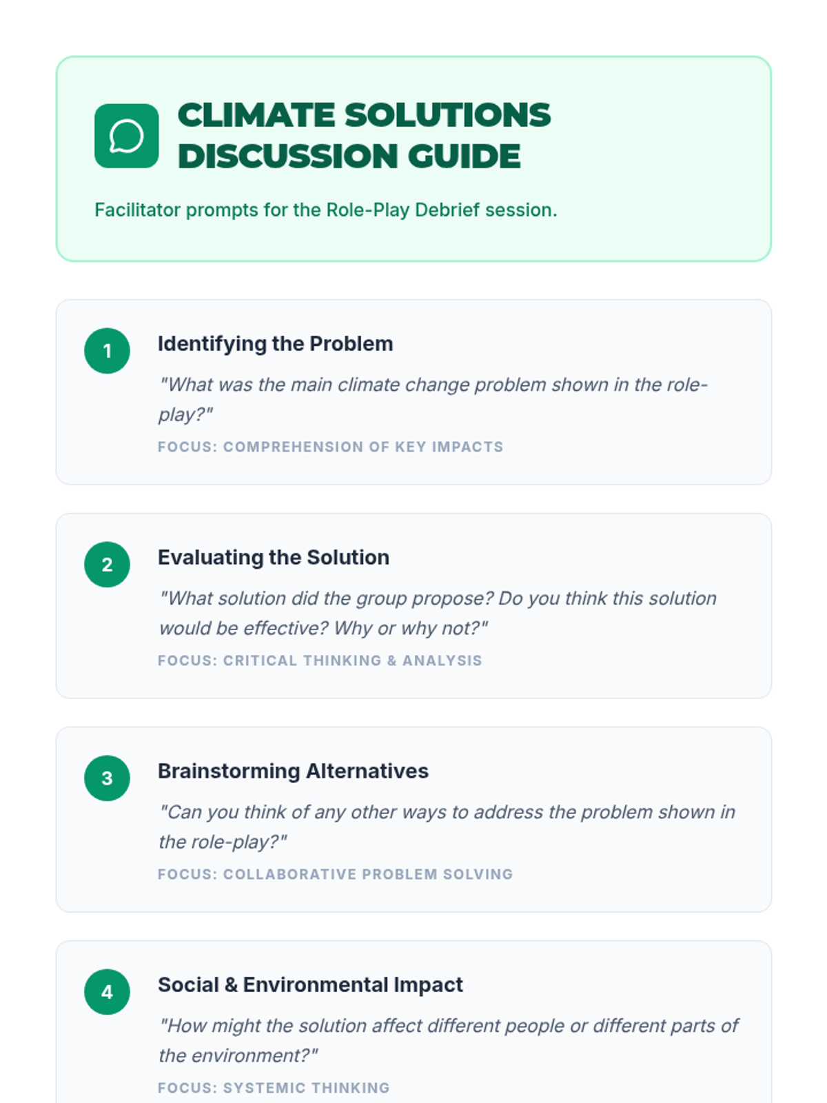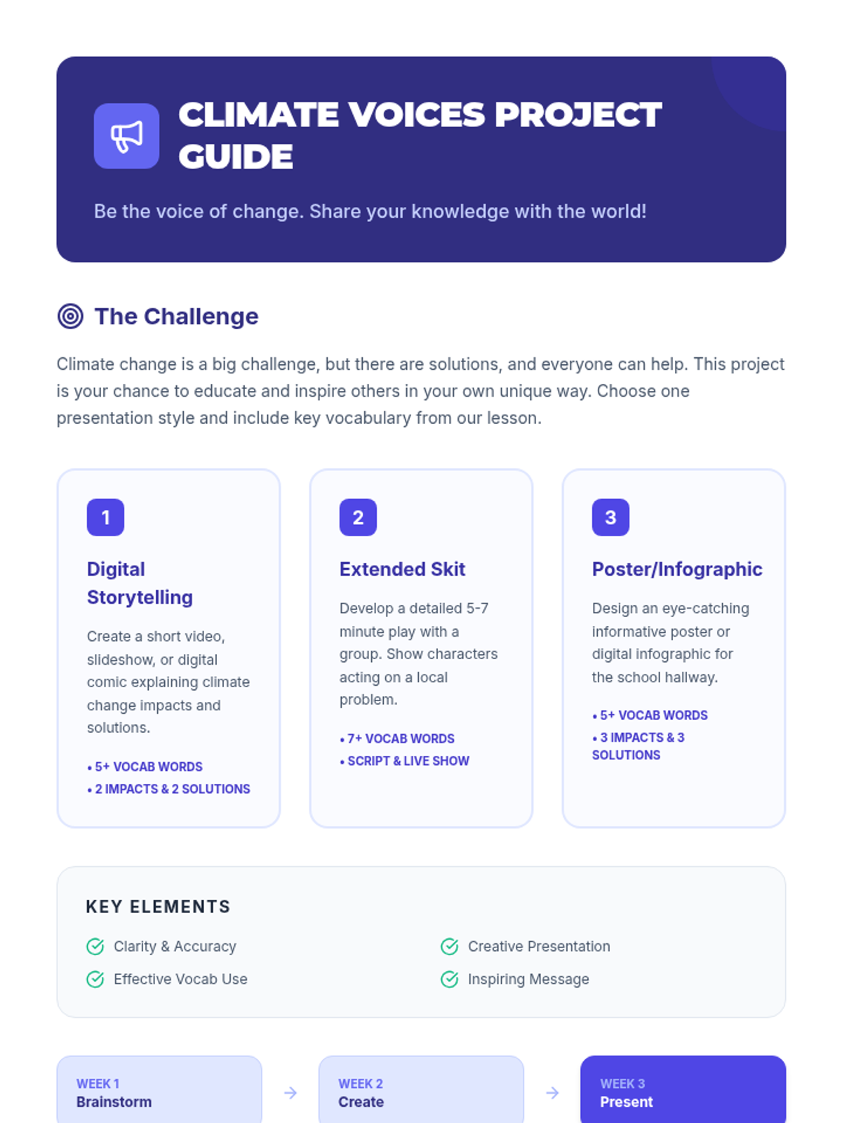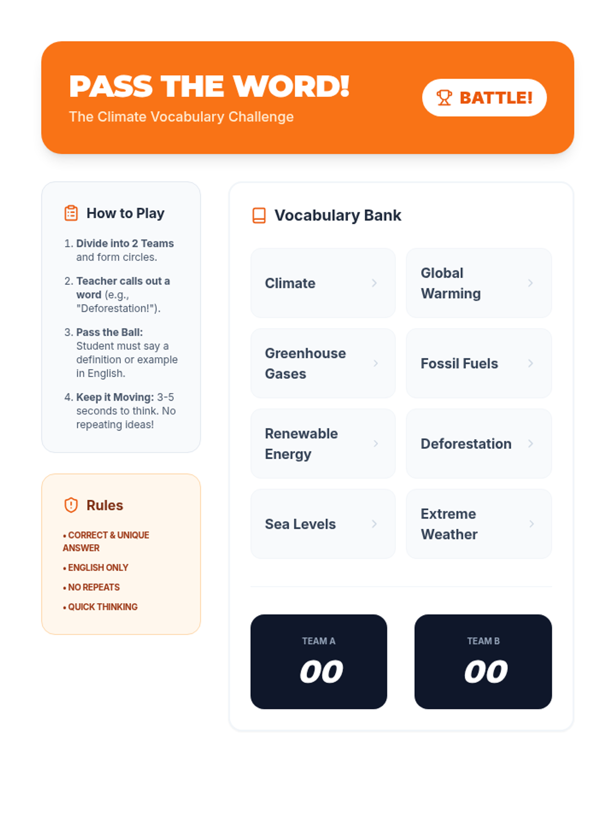A 60-minute interactive lesson for 13-14 year old English language learners focused on climate change vocabulary, civic engagement, and collaborative problem-solving. Students explore causes, effects, and solutions through reading, role-play, and creative projects.