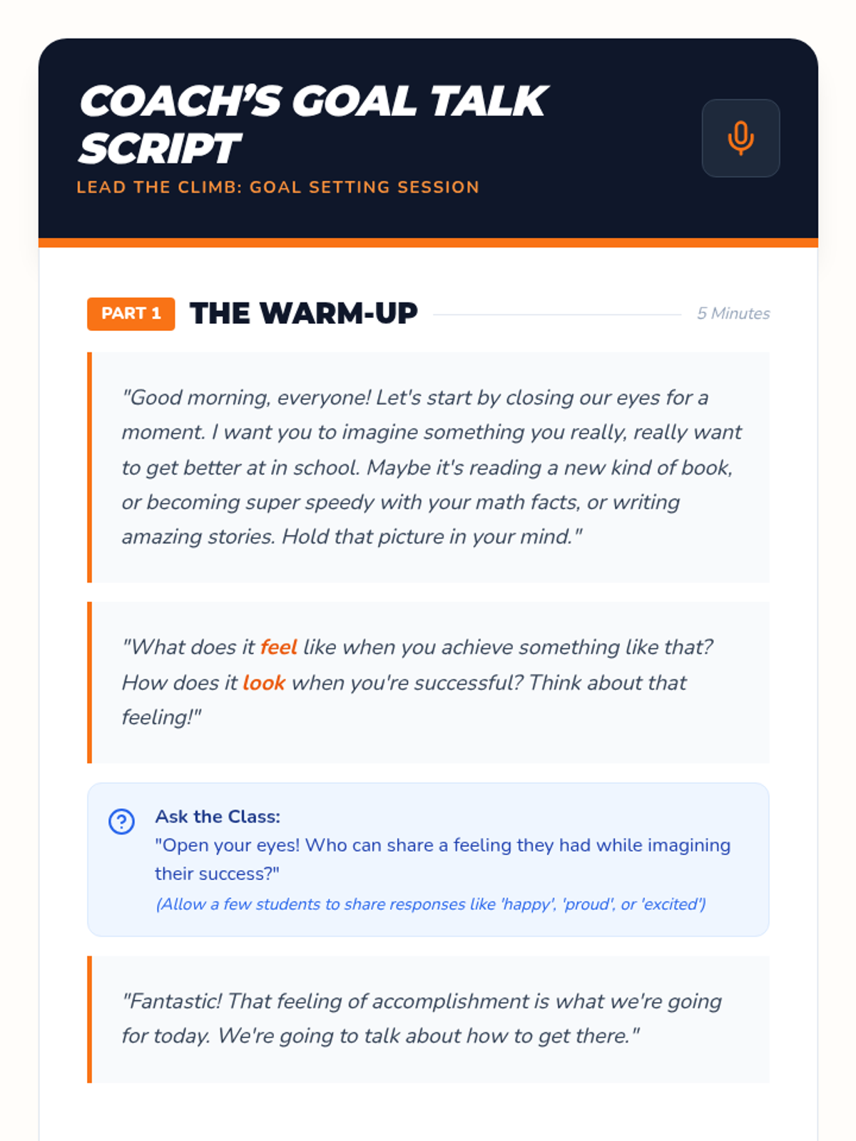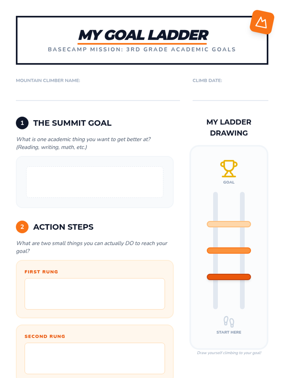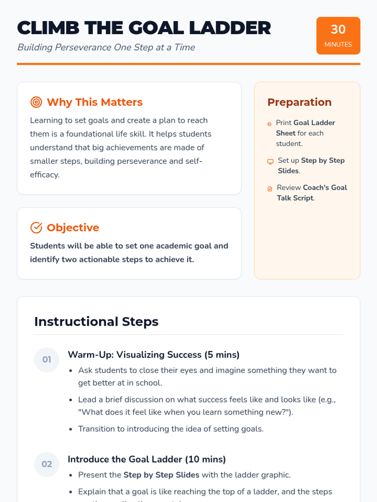 Students will set one academic goal and outline two actionable steps to reach it, fostering perseverance through the analogy of climbing a ladder.