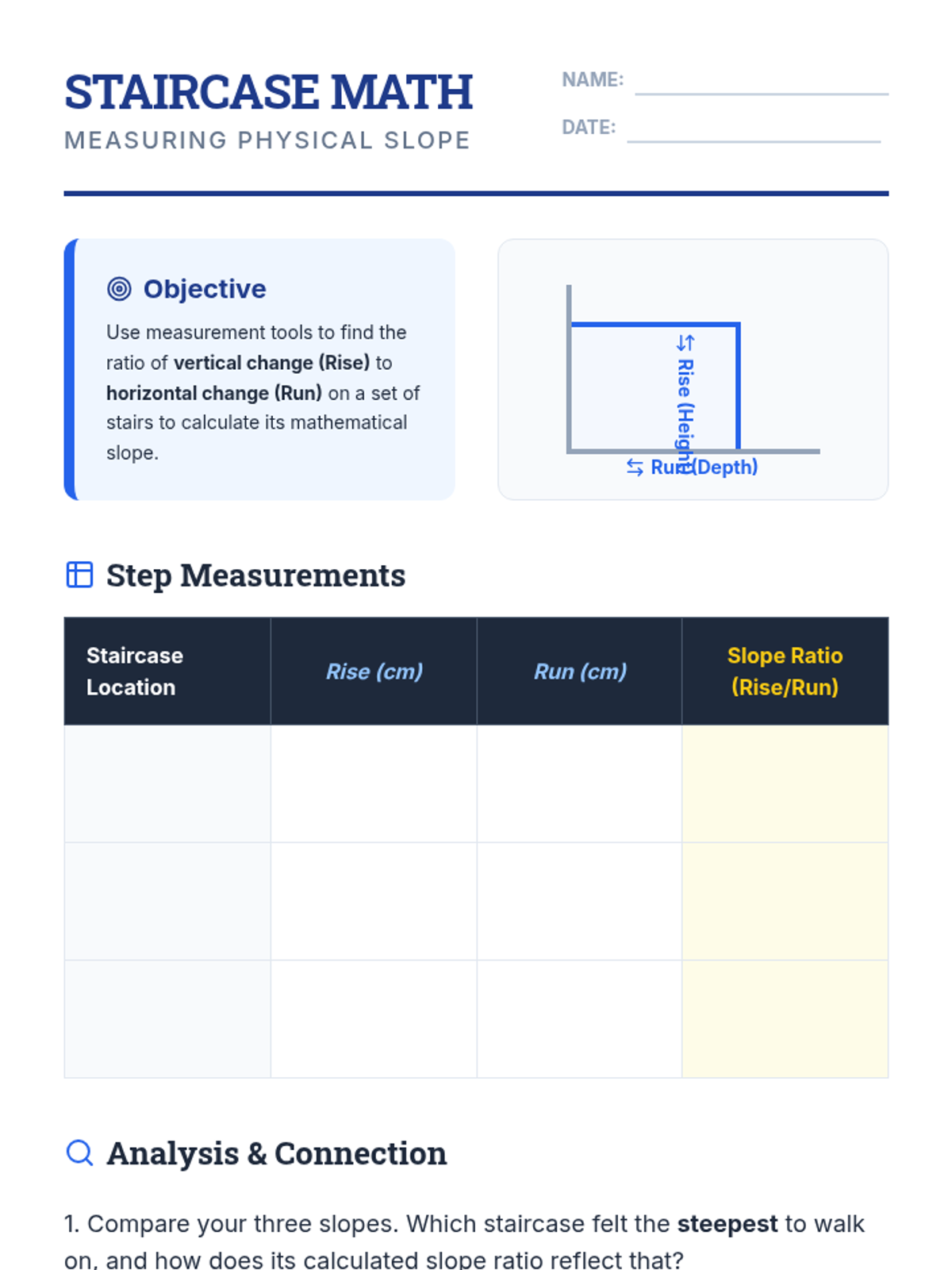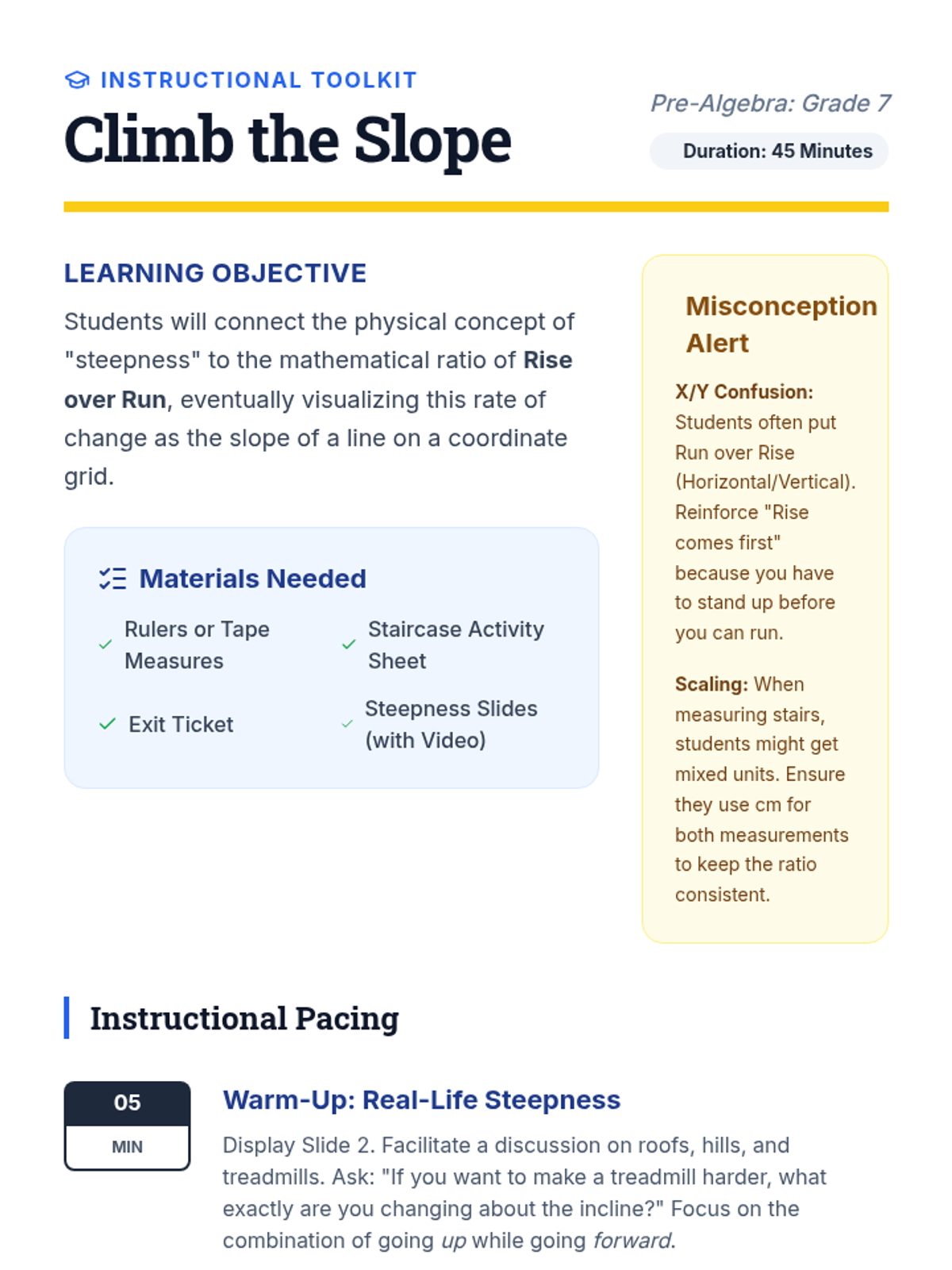 A 7th-grade Pre-Algebra lesson that transitions students from real-world steepness to the mathematical concept of slope using a hands-on staircase activity and visual video analysis.