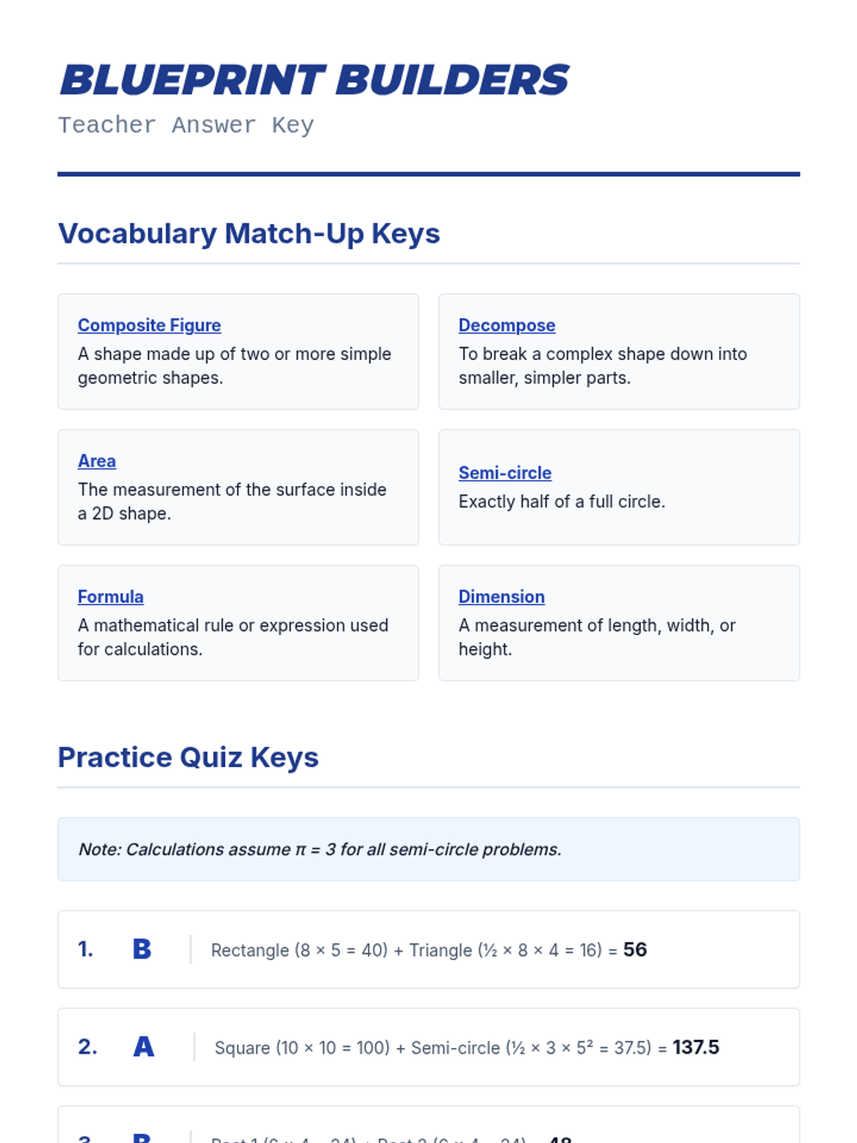 A comprehensive lesson on calculating the area of composite figures by decomposing them into simpler shapes like rectangles, triangles, and semi-circles using integer-based measurements.