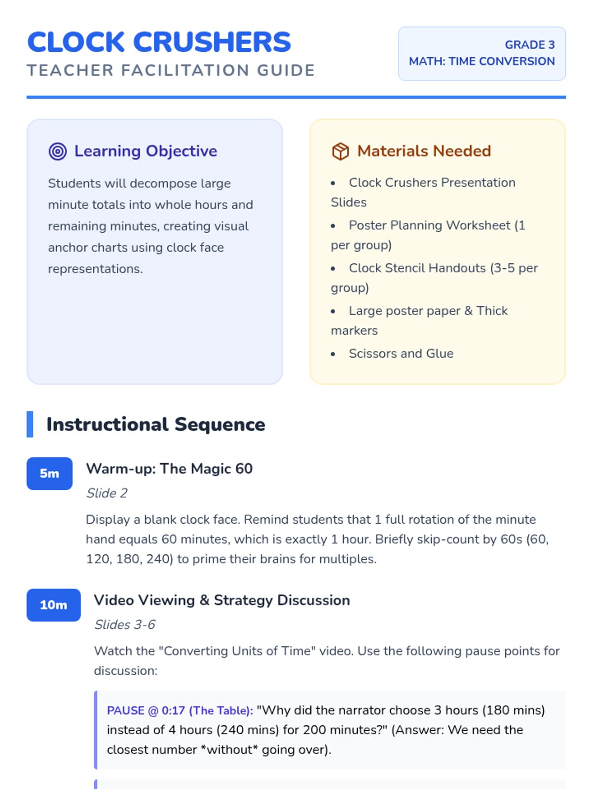 Students learn to convert large quantities of minutes into hours and minutes using a decomposition strategy. They create visual anchor charts using clock faces to represent whole hours and remaining minutes.