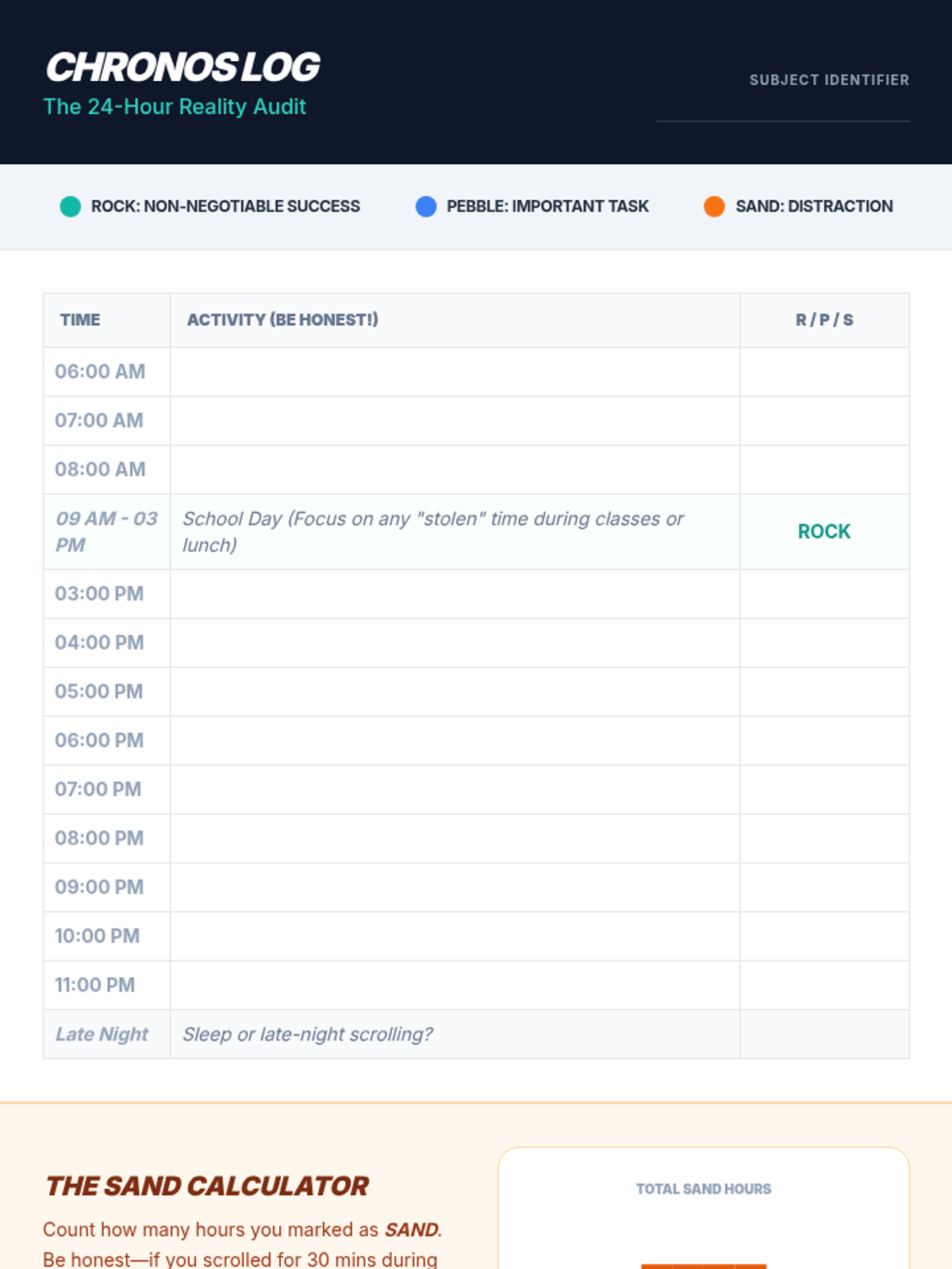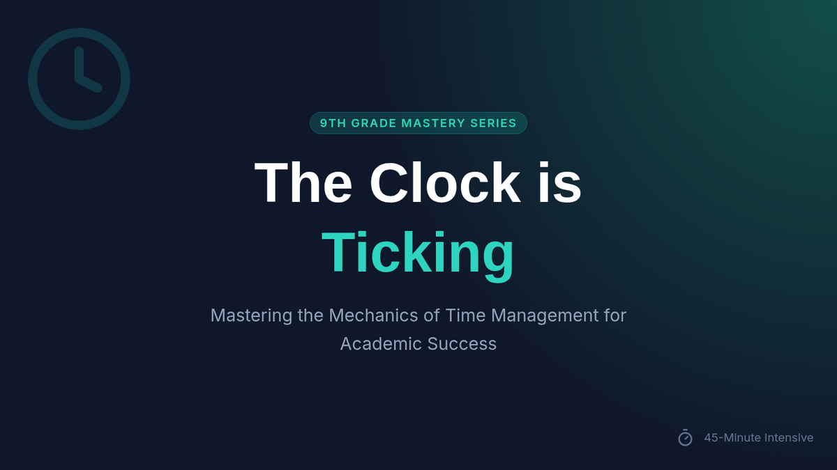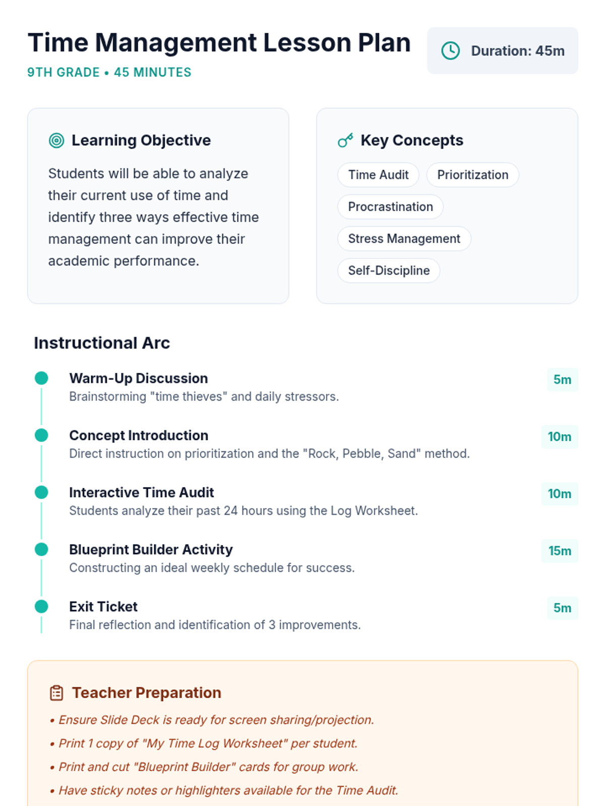 A comprehensive 45-minute lesson for 9th graders focusing on the mechanics of time management, featuring a time audit, prioritization strategies, and personal schedule building.