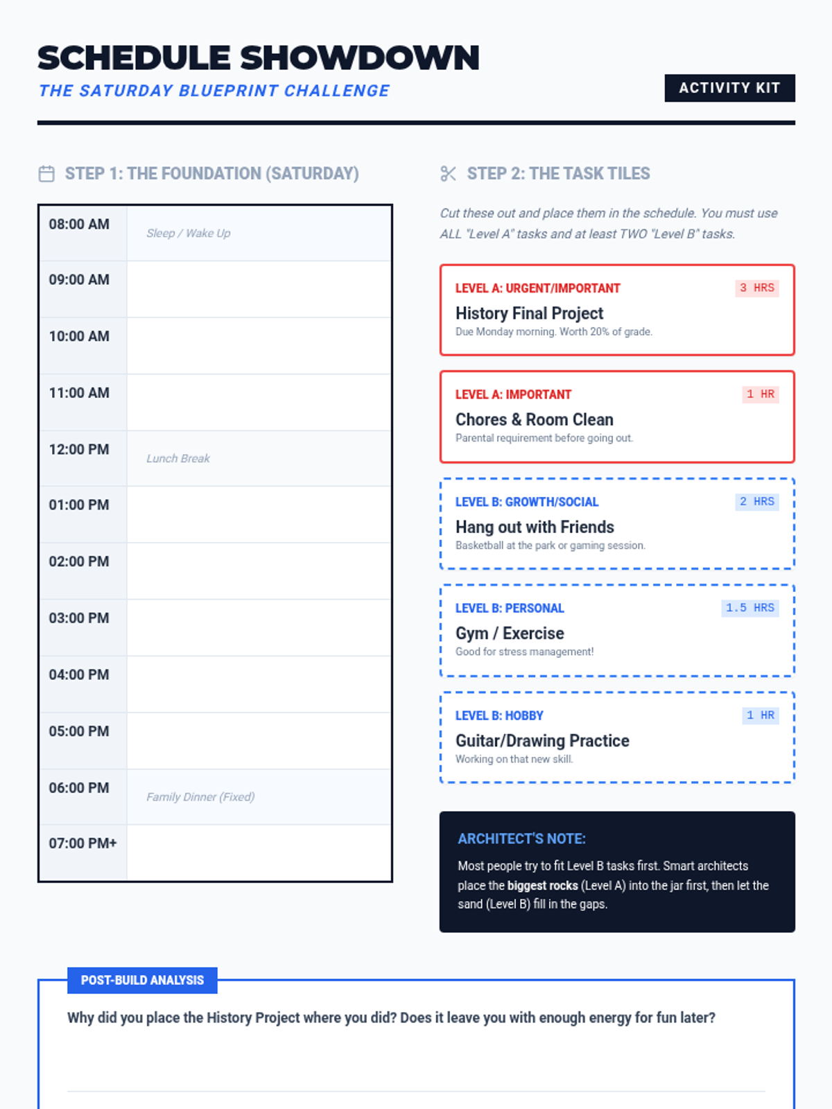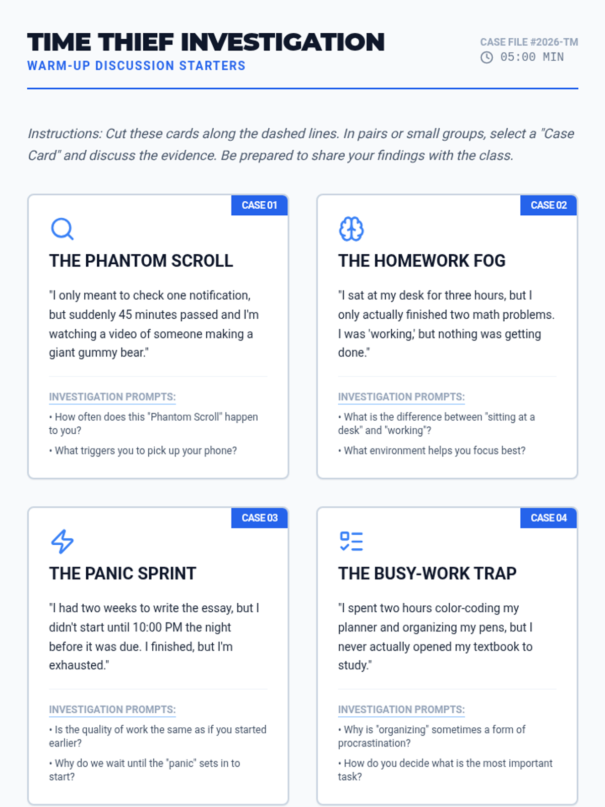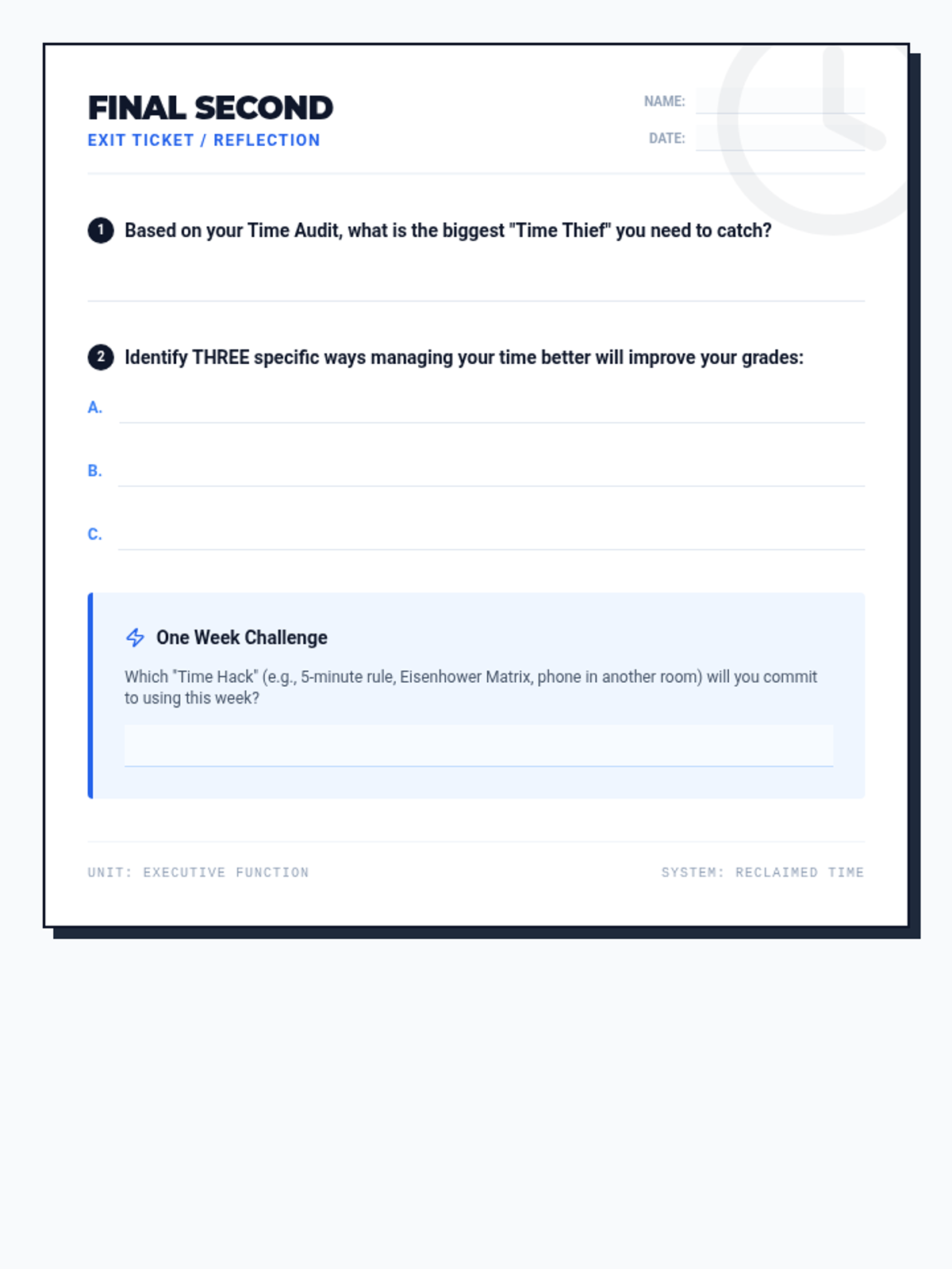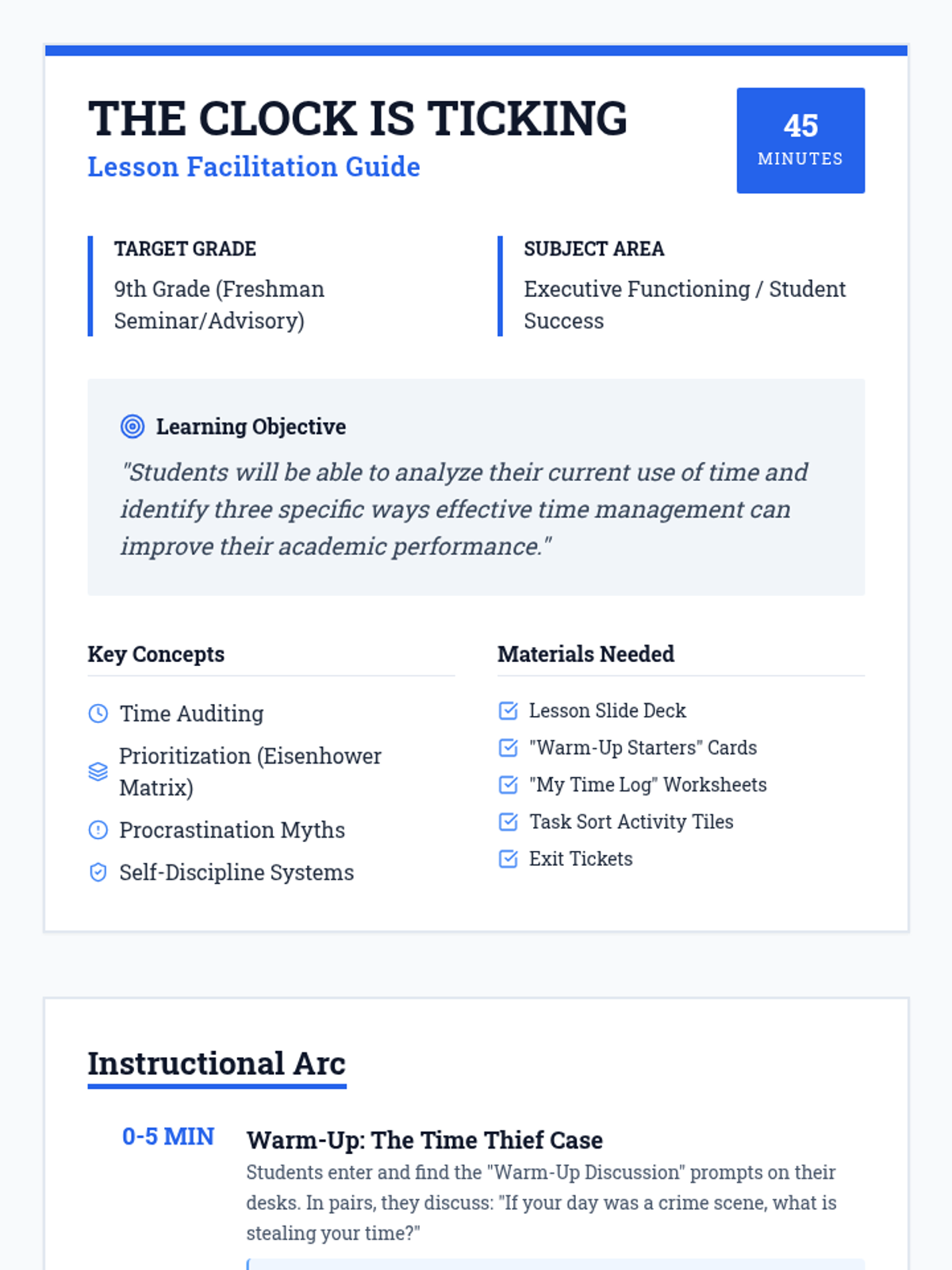 A comprehensive 9th-grade lesson focused on analyzing time usage and implementing management strategies like prioritization and self-discipline to boost academic success.