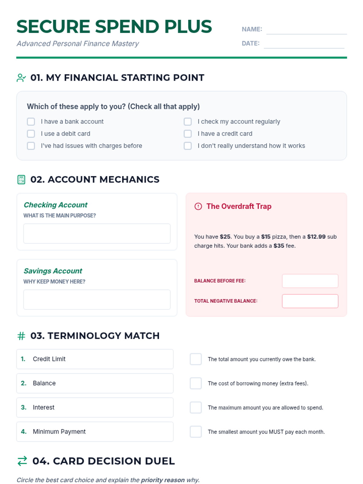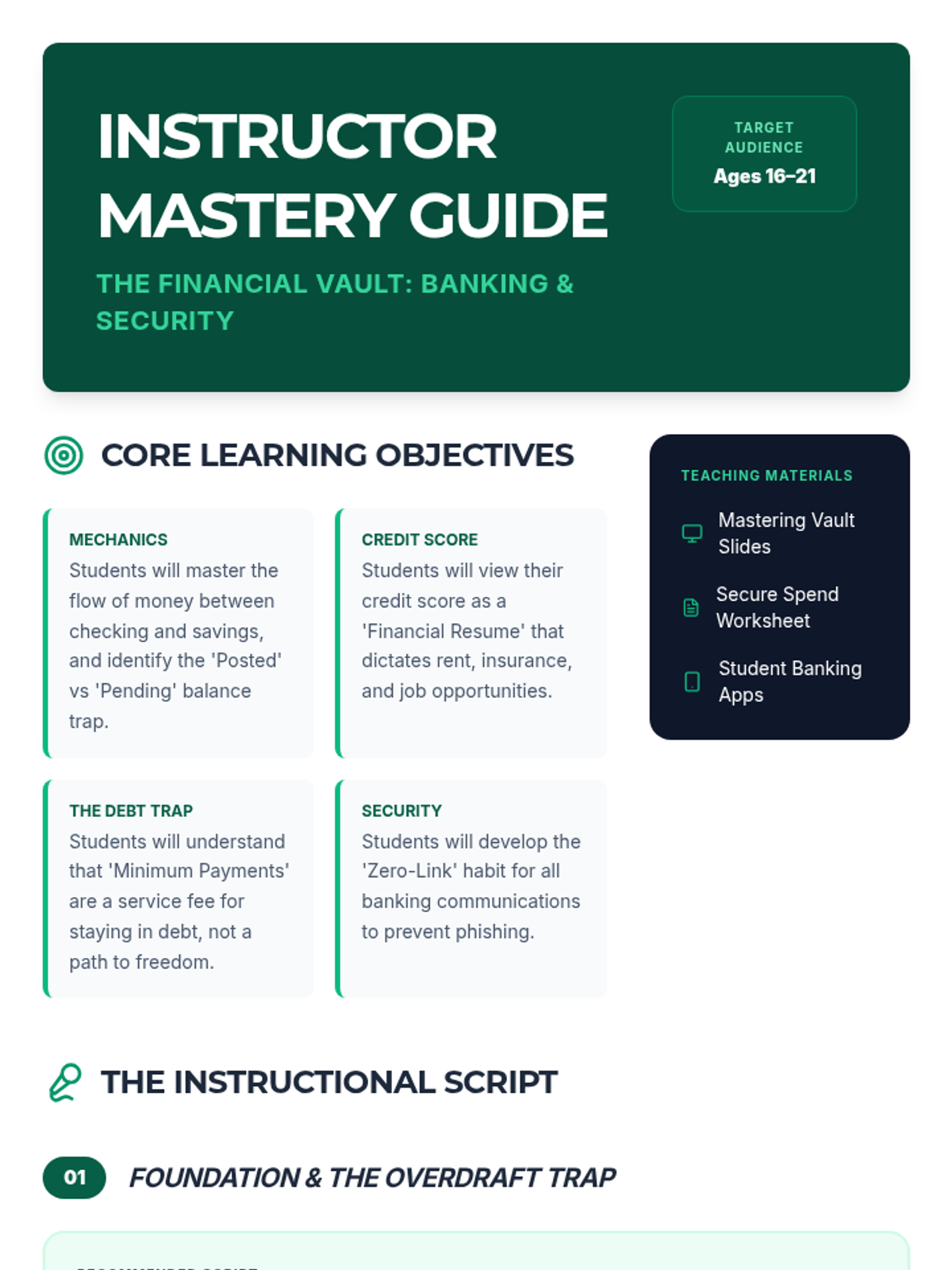 A comprehensive lesson on banking basics, debit vs. credit, and fraud prevention, designed to equip young adults with the knowledge to manage money safely and avoid common financial pitfalls.