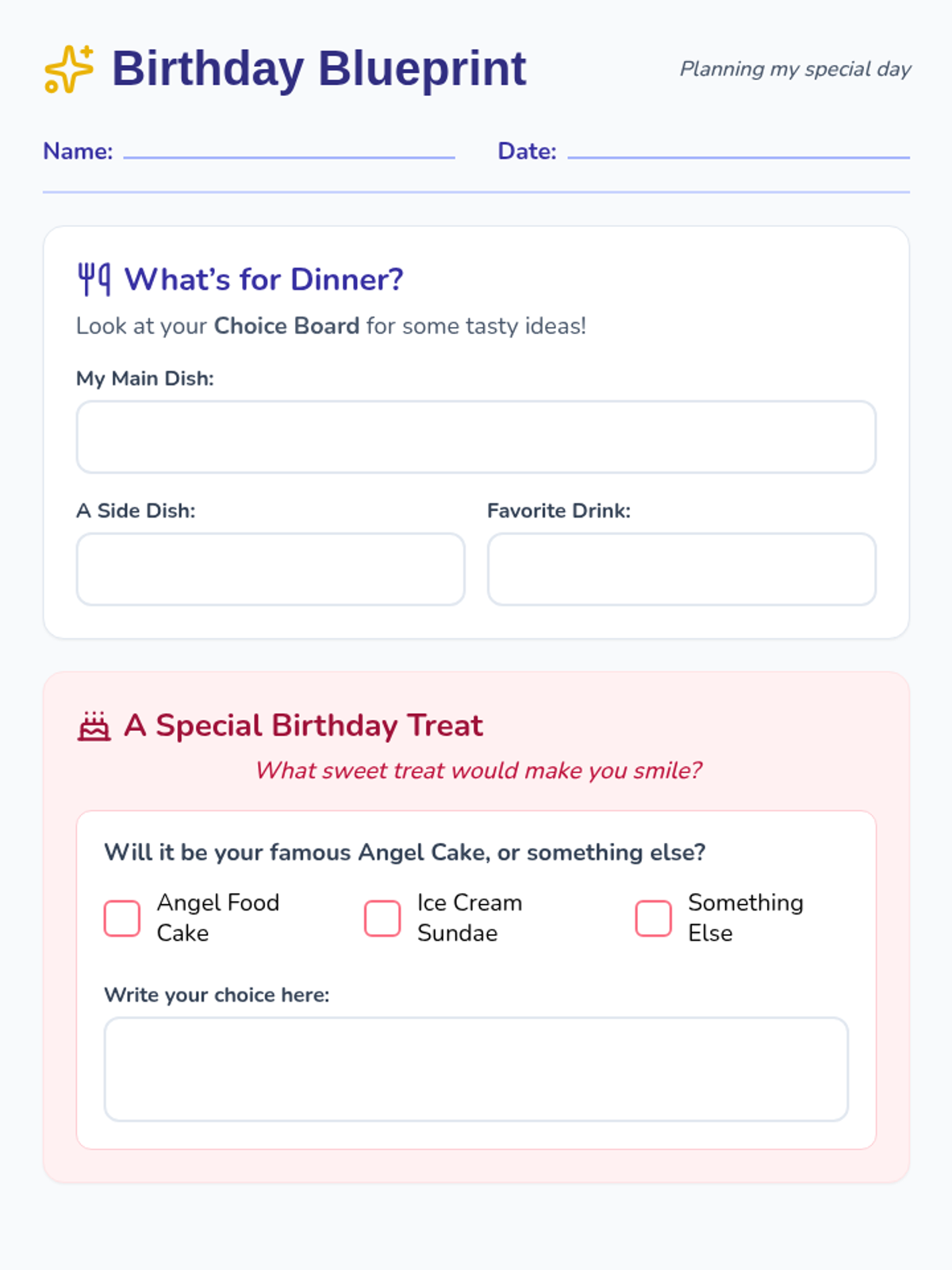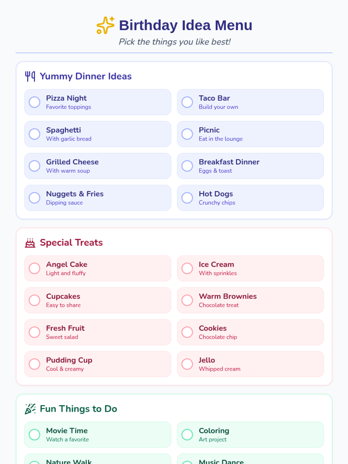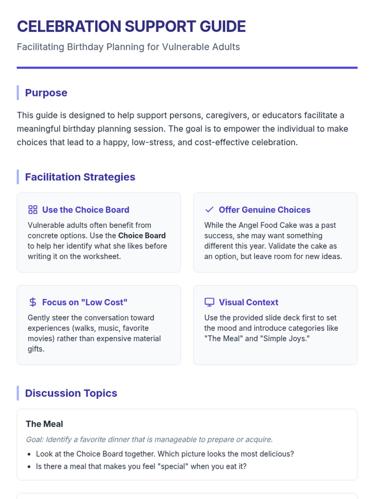 A supportive lesson designed to help a vulnerable adult brainstorm and plan a meaningful, low-cost birthday celebration focused on food, activities, and simple joys.
