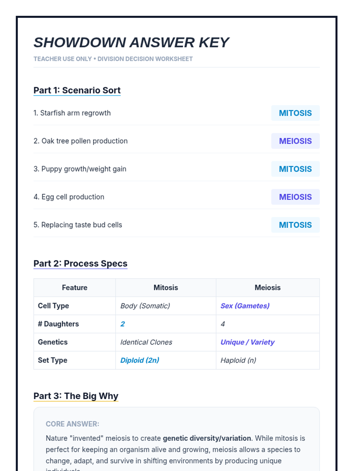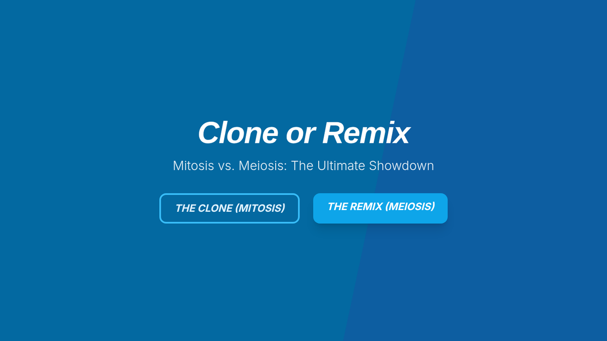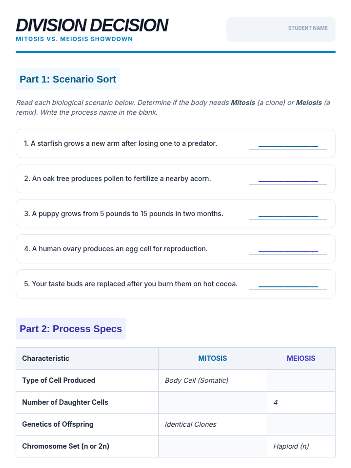 A comparative lesson where students distinguish between mitosis (cloning/growth) and meiosis (remixing/reproduction) using sorting activities and Venn diagrams.