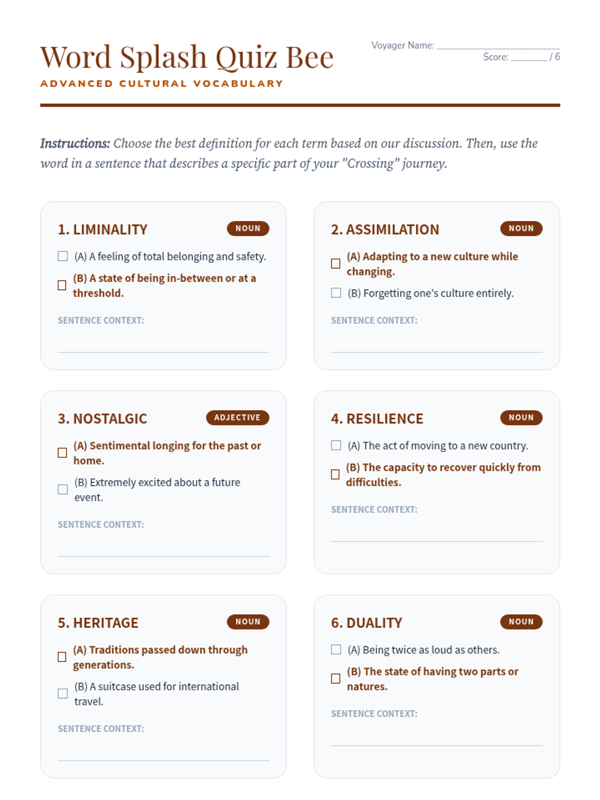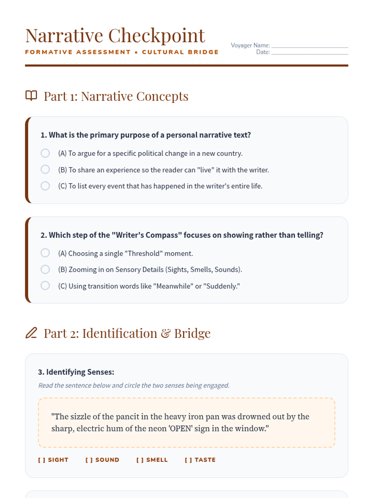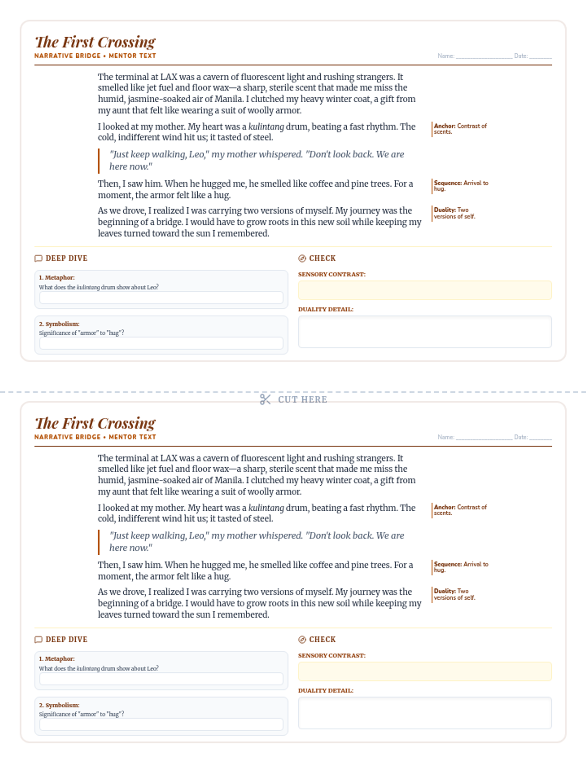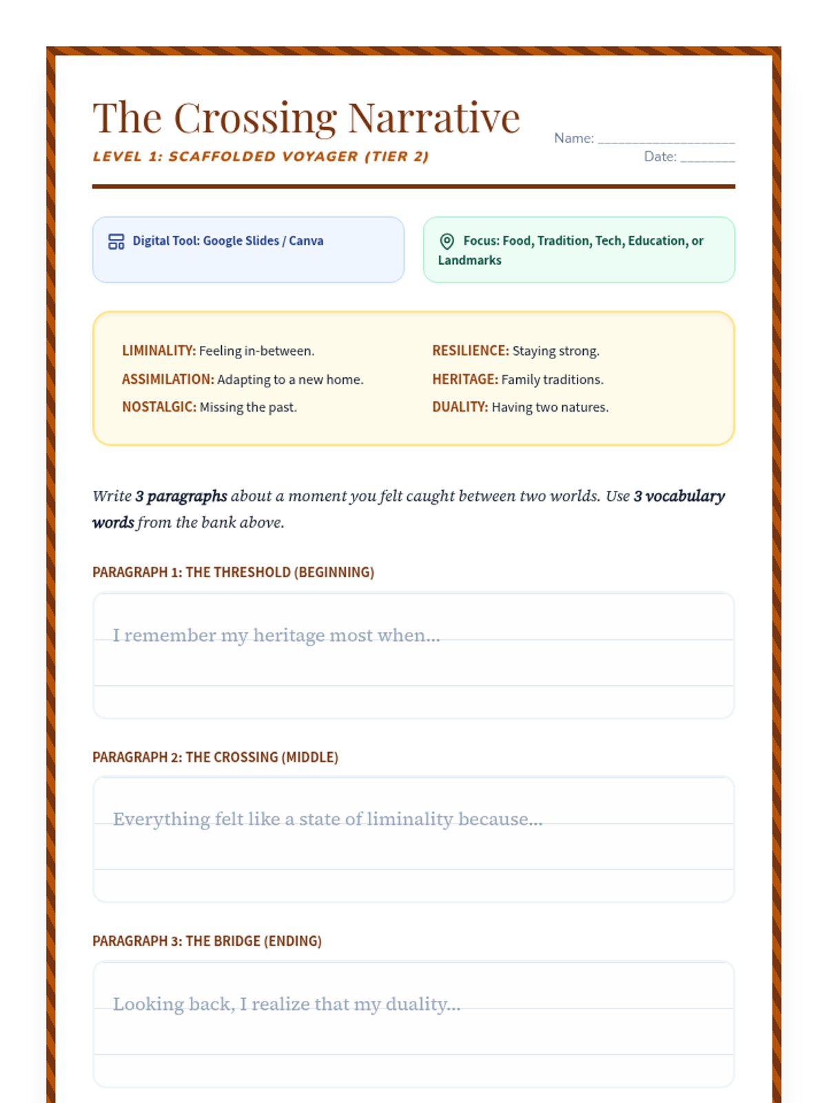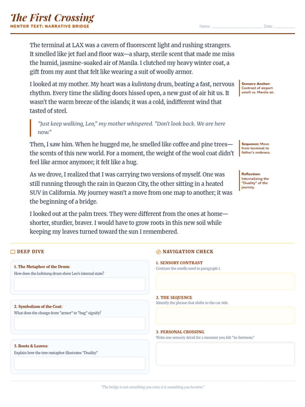 An advanced 8th-grade ELA lesson exploring the intersection of Filipino and American identities through personal narrative. Students analyze the immigrant experience, master advanced vocabulary via a 'Quiz Bee,' and draft narratives that bridge their cultural heritage with their current journey.