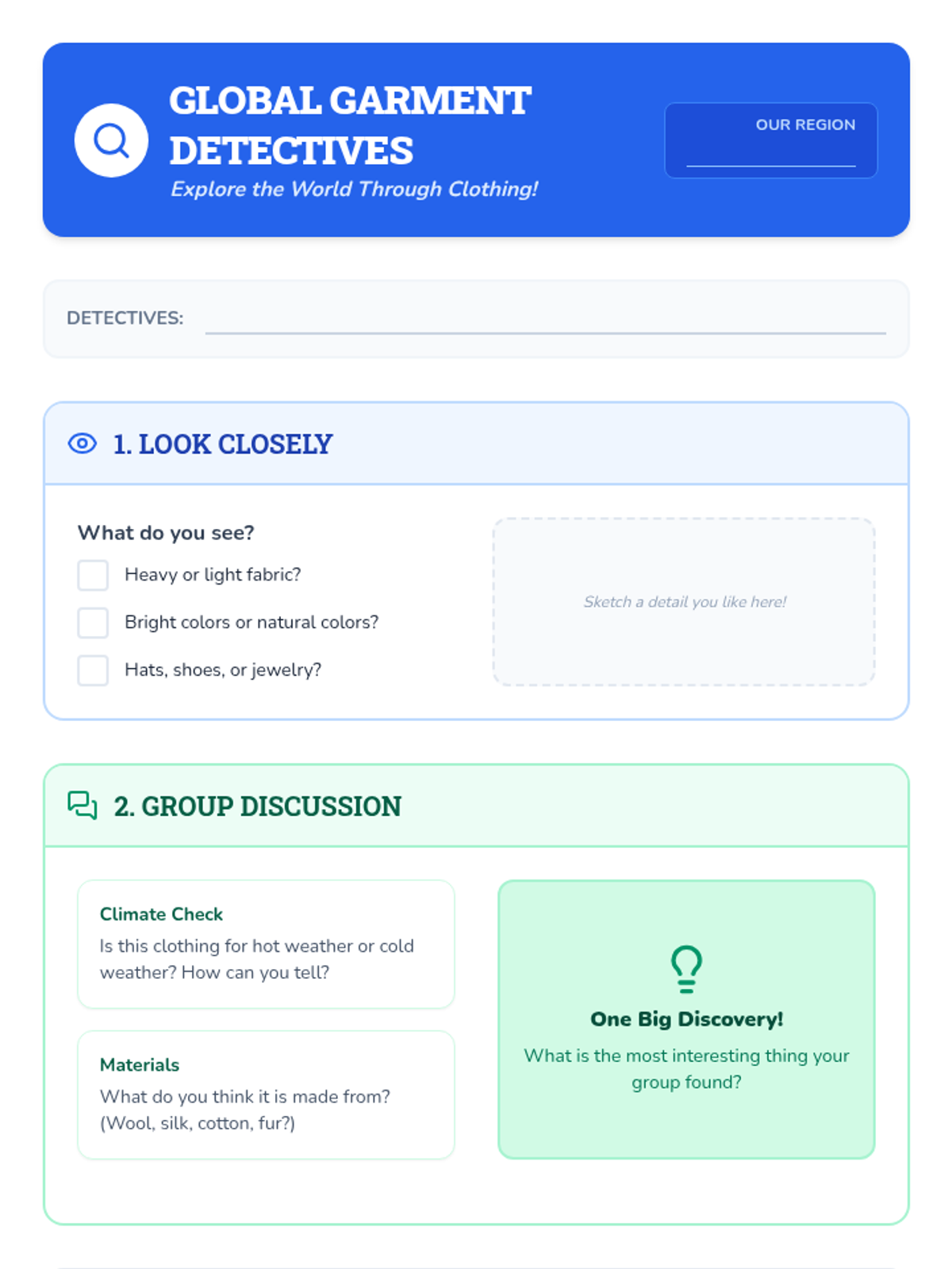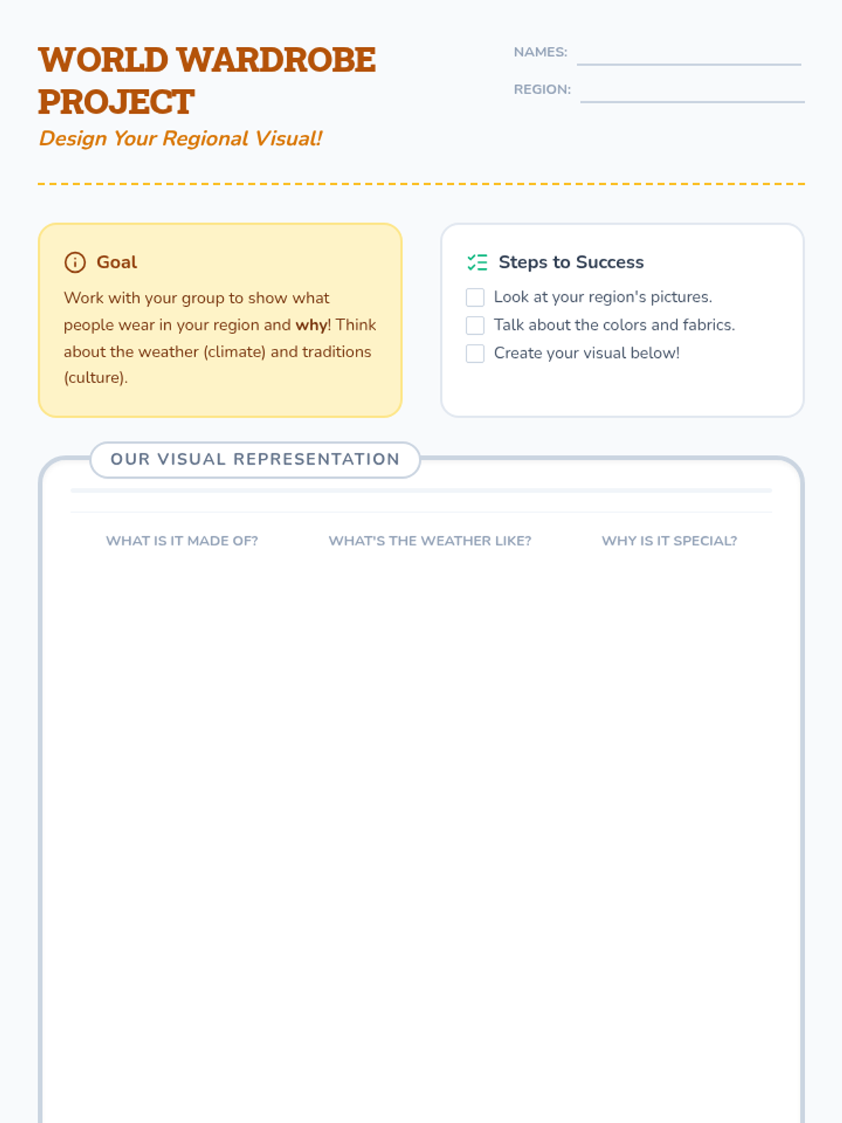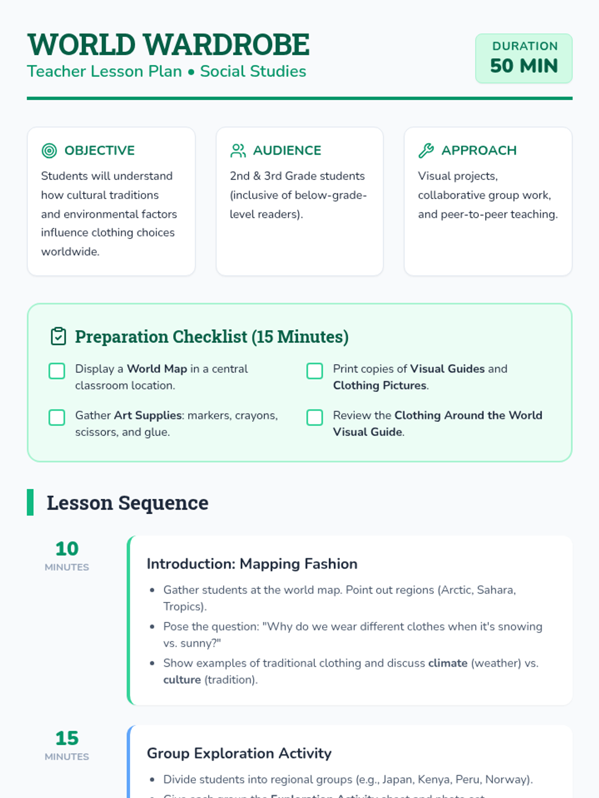 A 50-minute lesson for 2nd and 3rd graders to explore how climate and culture shape clothing traditions around the globe through visual projects and peer teaching.