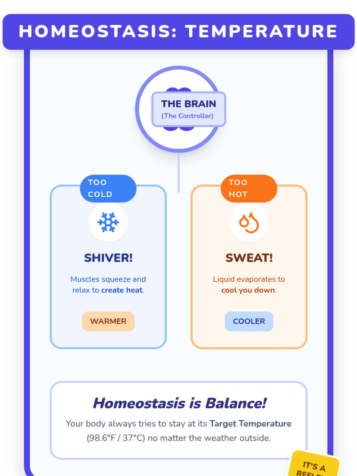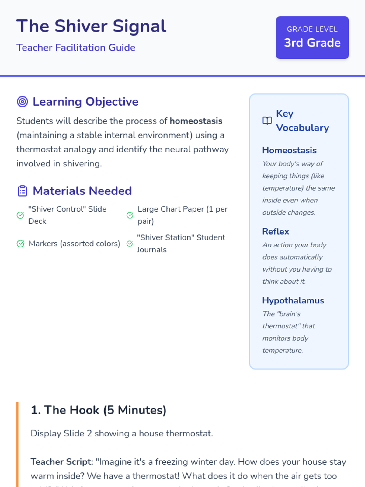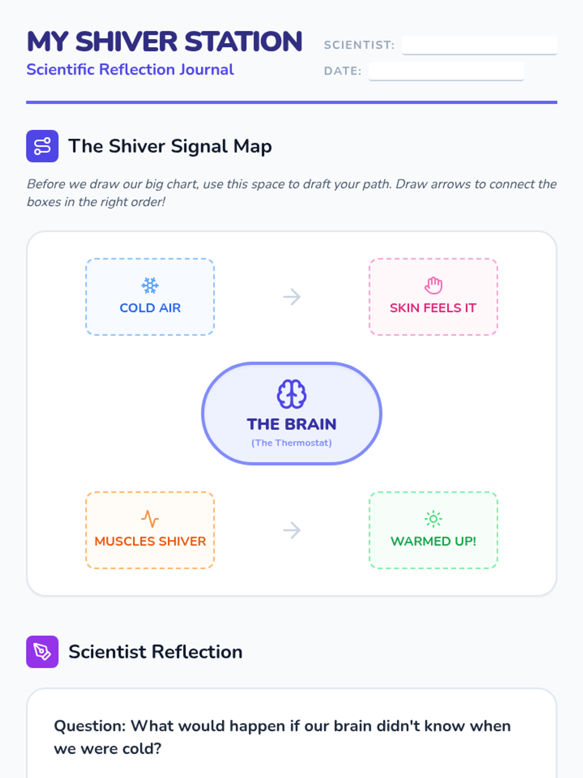 A 3rd-grade science lesson exploring homeostasis and temperature regulation through a thermostat analogy and a video on why we shiver. Students map the neural pathway from feeling cold to the shivering reflex.