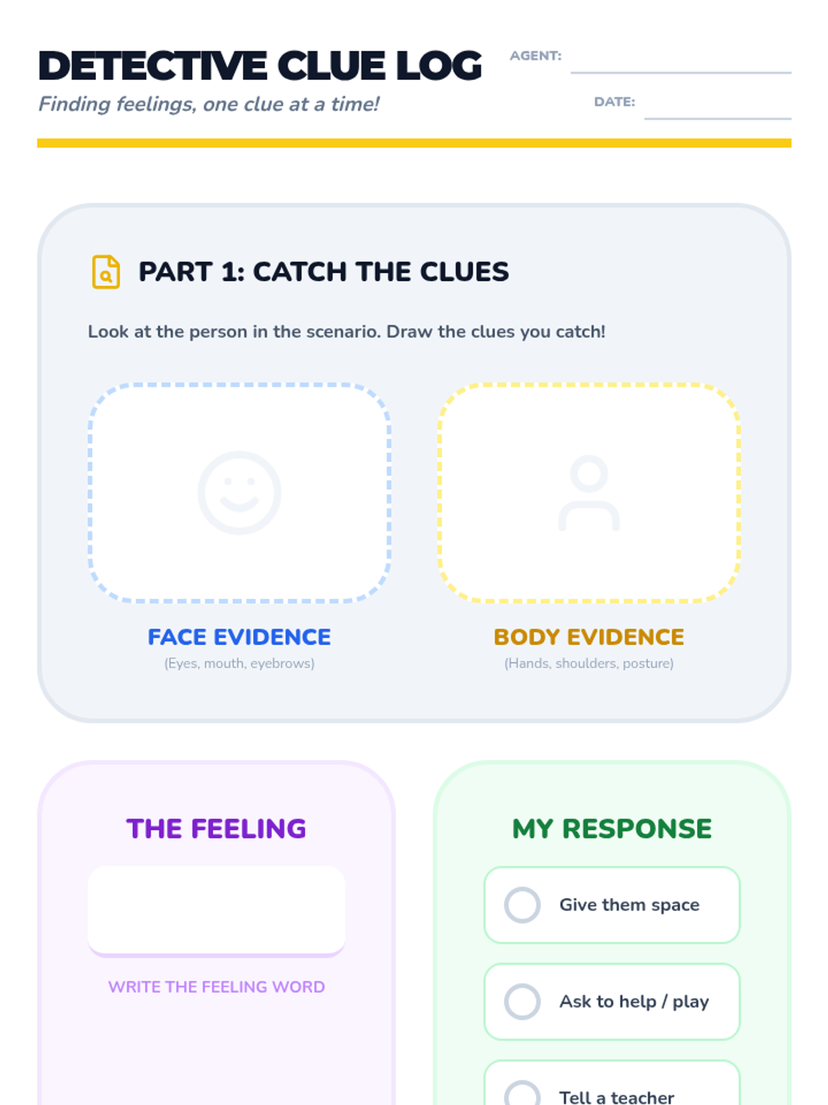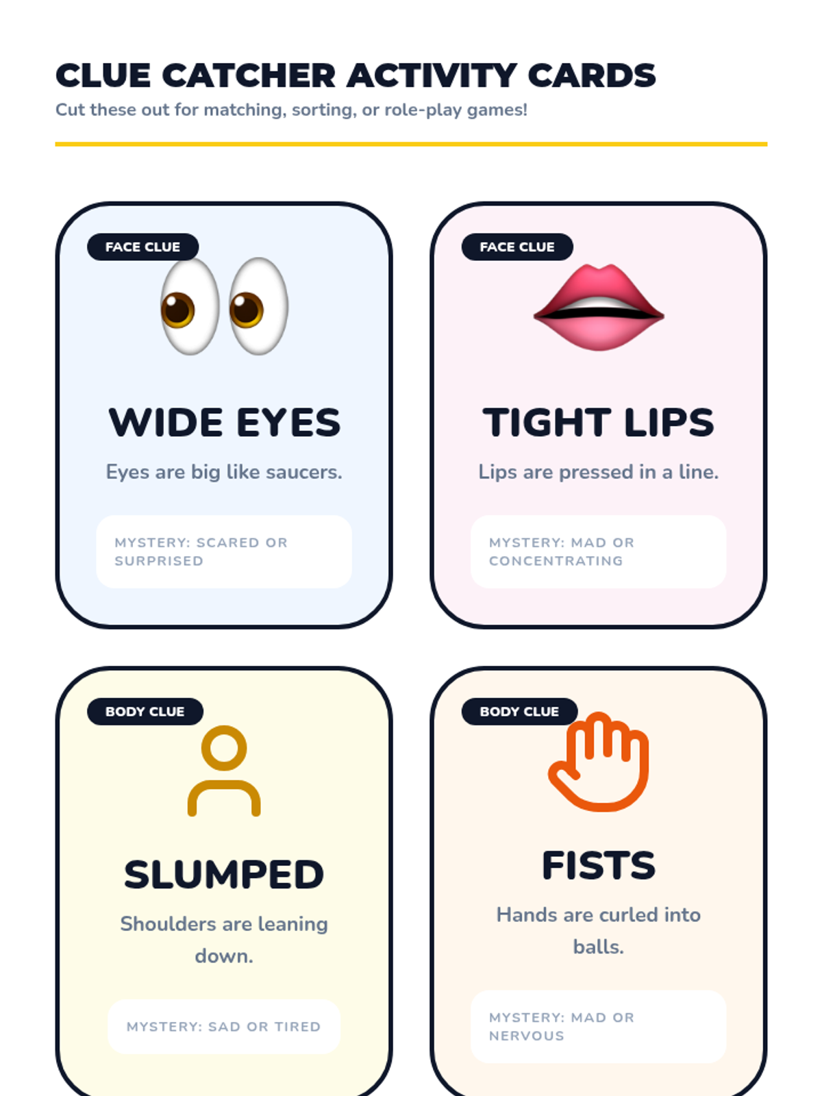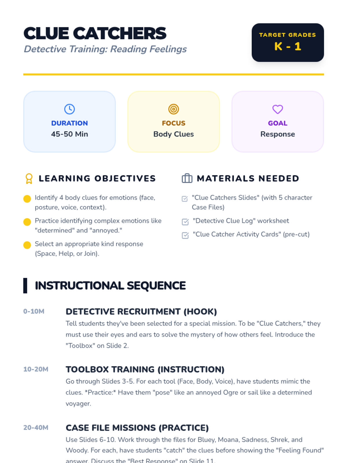 A lesson for K-1 students on identifying emotions using 'body clues' like facial expressions, posture, tone of voice, and situational context. Students practice being 'Clue Catchers' to determine how others feel and choose the kindest next step.