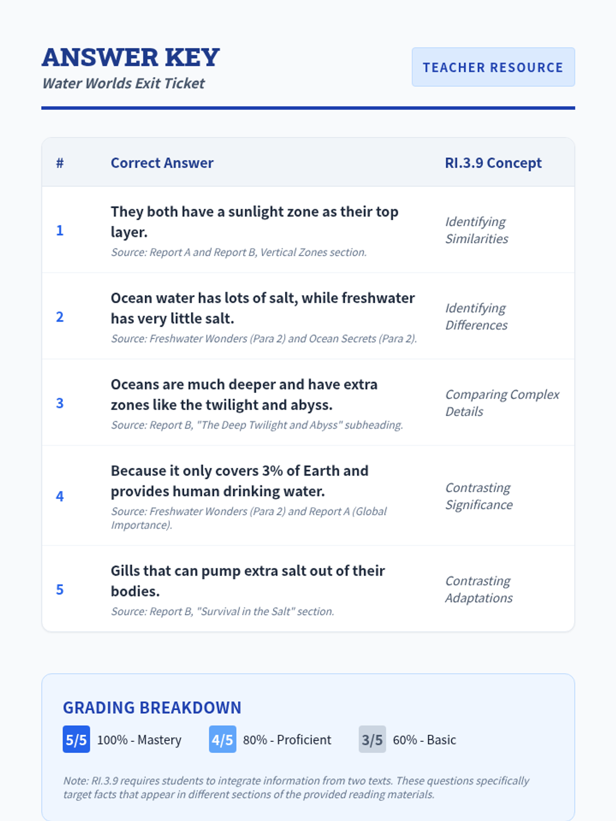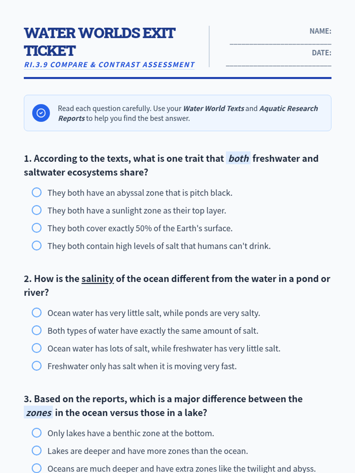 Day 2 of the Water Worlds unit. Students tackle longer informational texts and transition to using a Venn Diagram strategy to categorize similarities and differences in environmental zones, animal adaptations, and global importance.