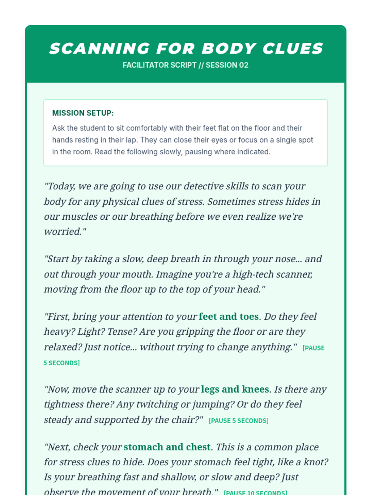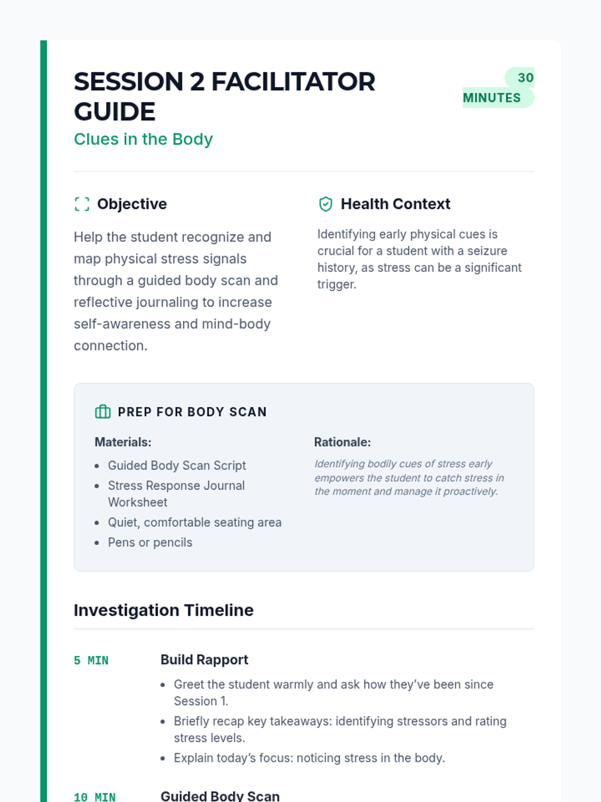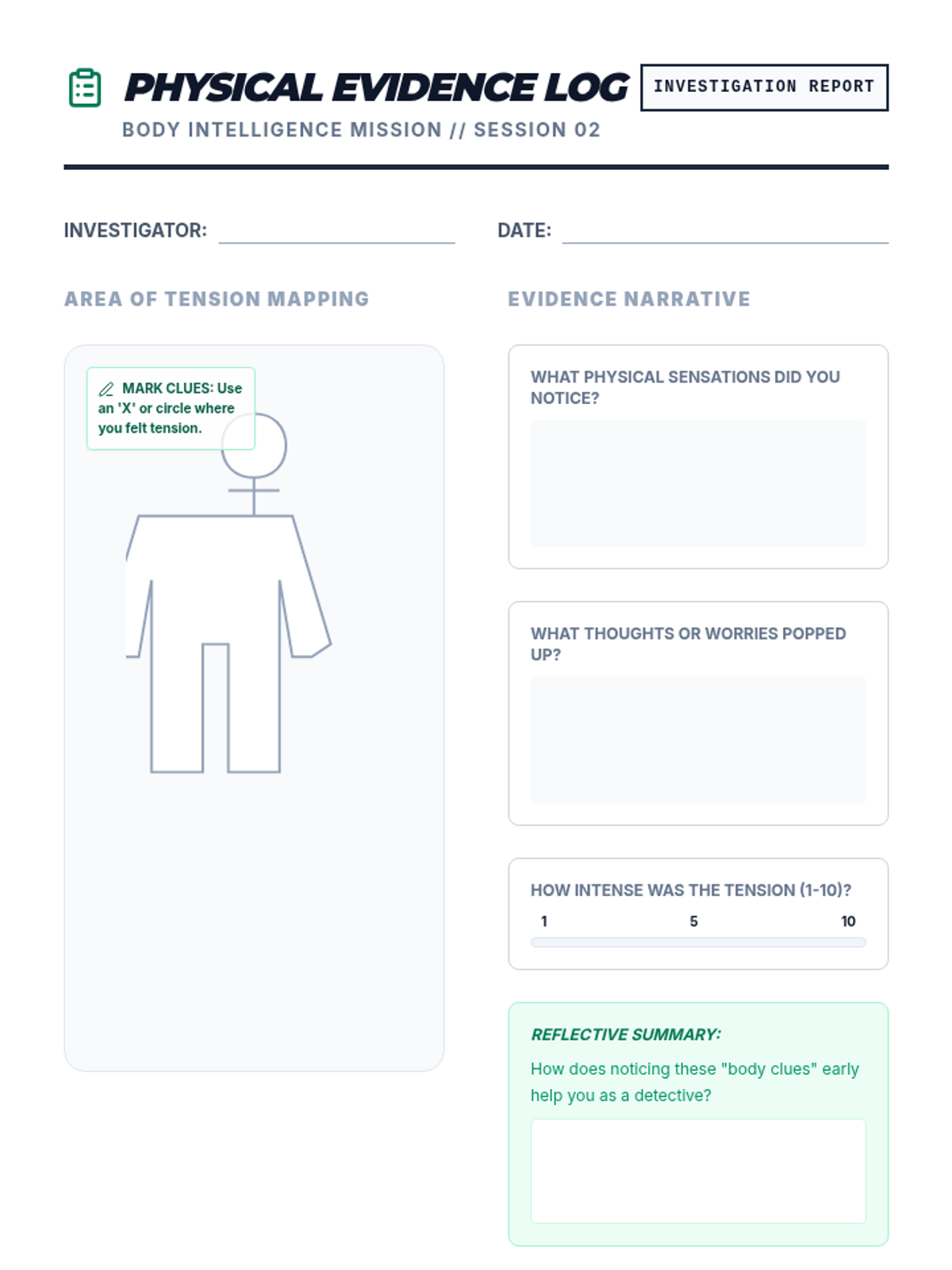 The investigation continues as the student learns to detect physical clues of stress within their own body using a guided scan and reflective journaling to improve mind-body awareness.