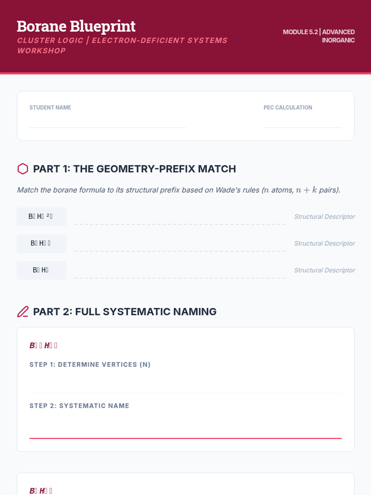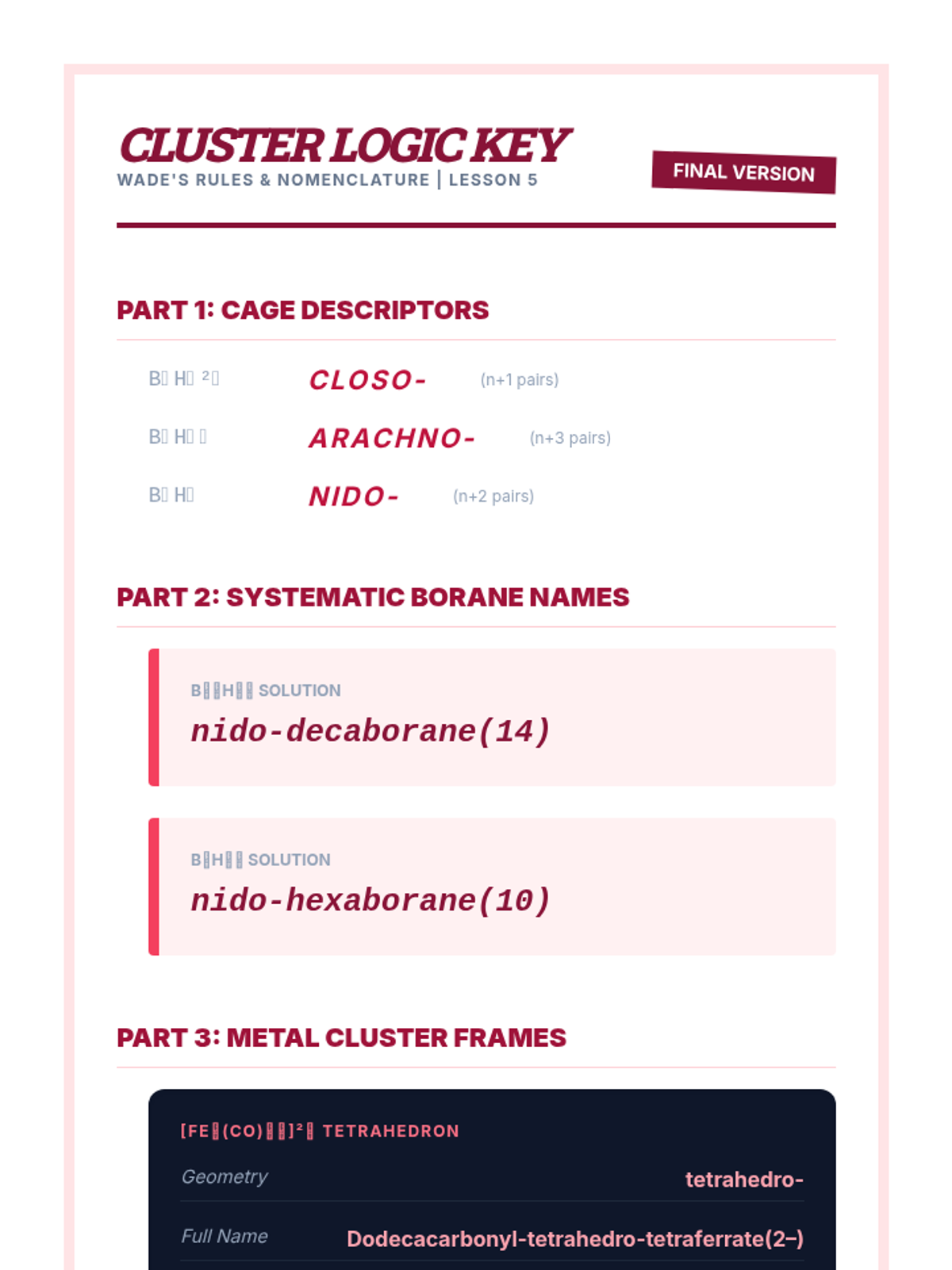 Utilize specialized nomenclature for boranes and metal clusters, connecting Wade's rules to structural descriptors like closo-, nido-, and arachno-.