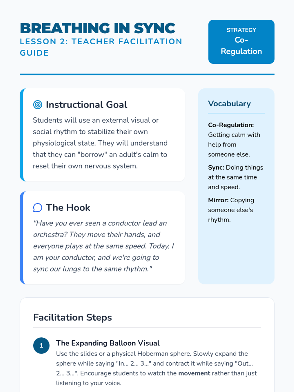 Students practice mirror breathing and syncing their internal rhythms with external guides and trusted adults to stabilize their sensory systems.