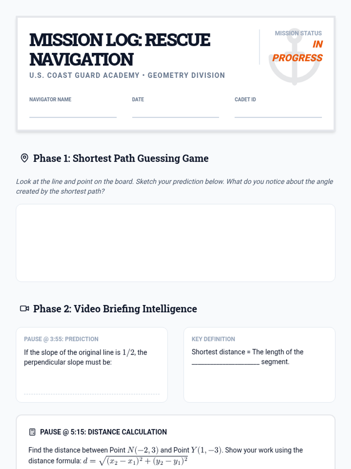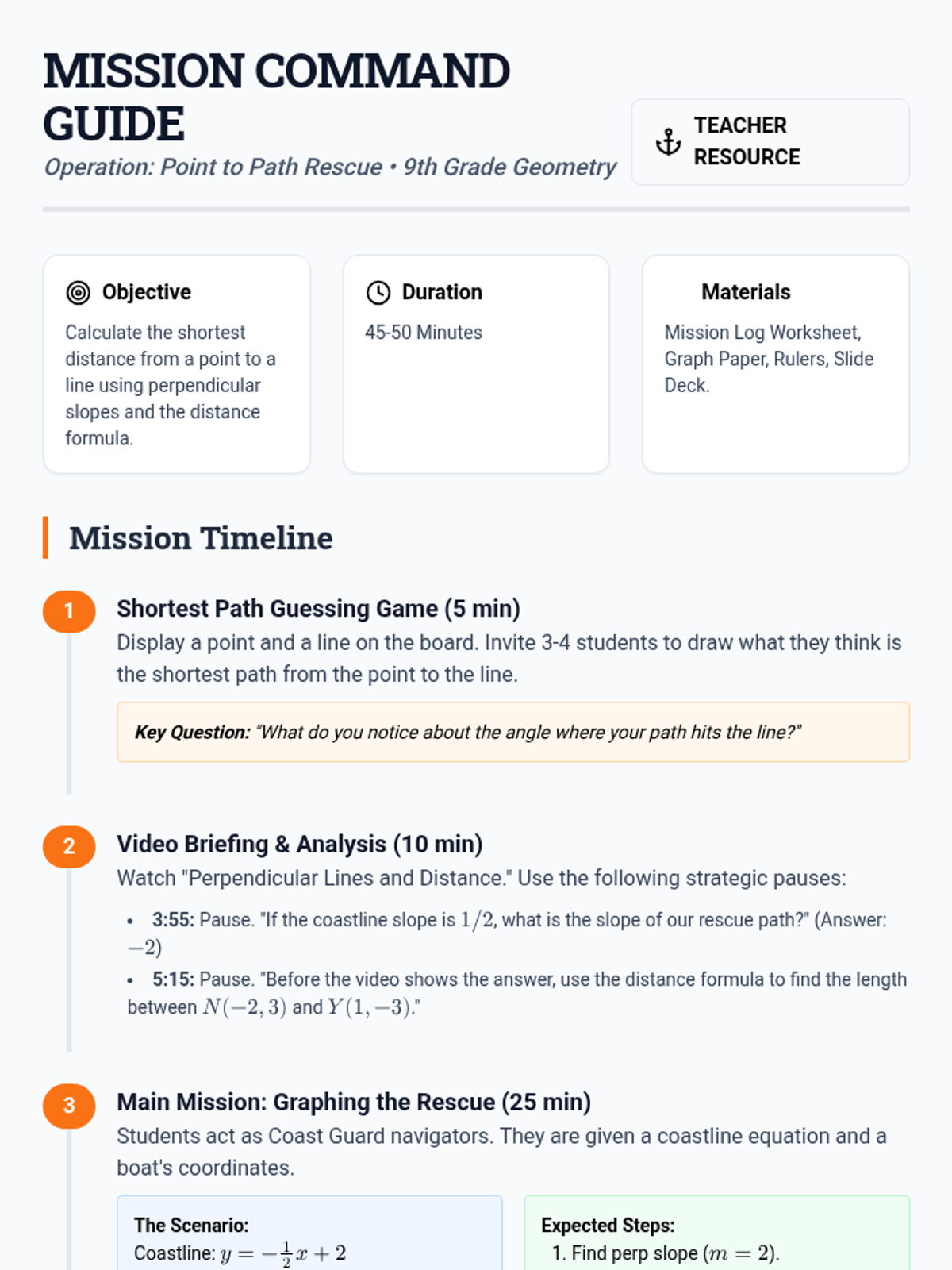 Students will use coordinate geometry to find the shortest distance from a point to a line, simulating a Coast Guard rescue mission. The lesson covers perpendicular slopes, intersection points, and the distance formula.