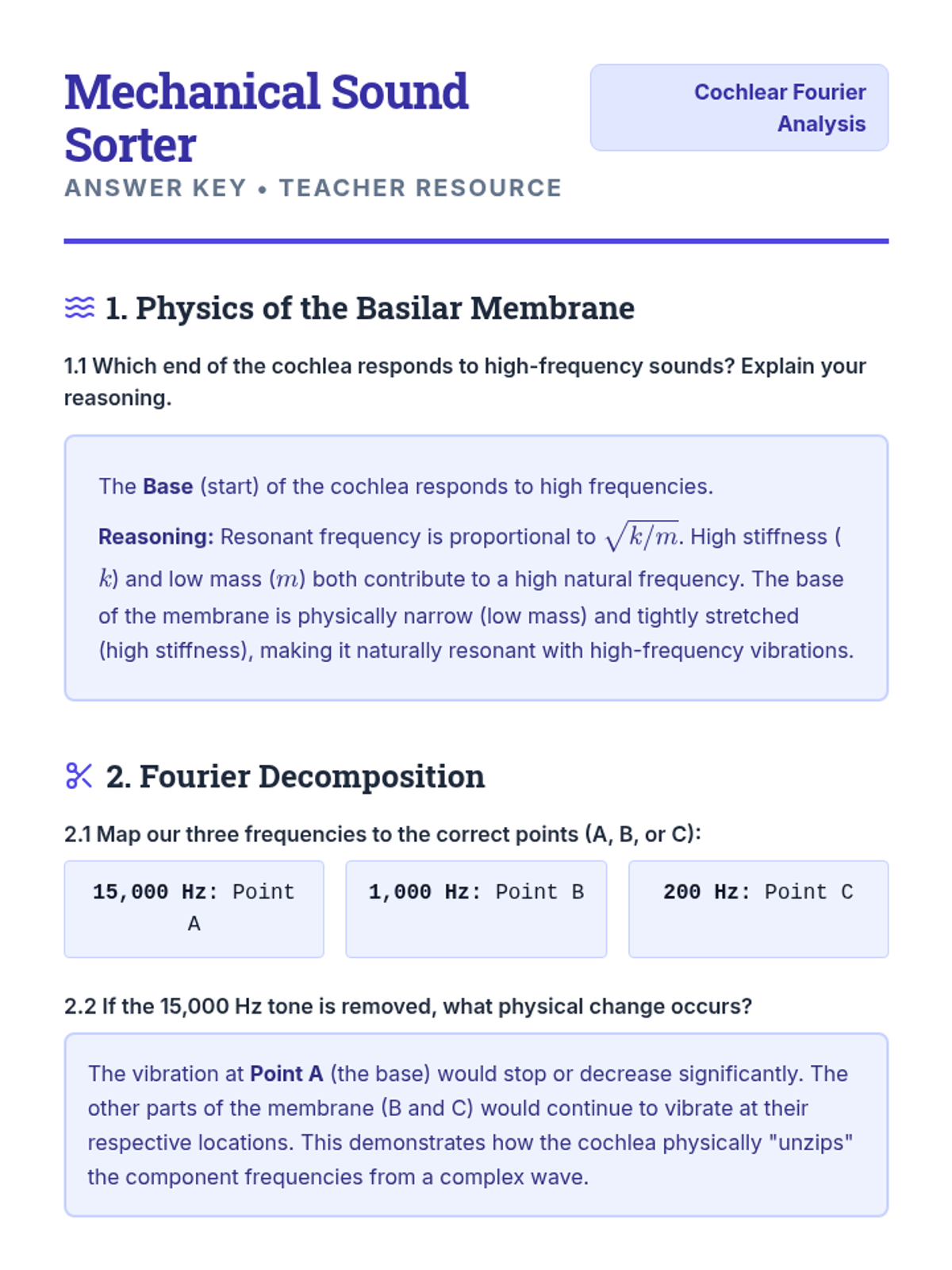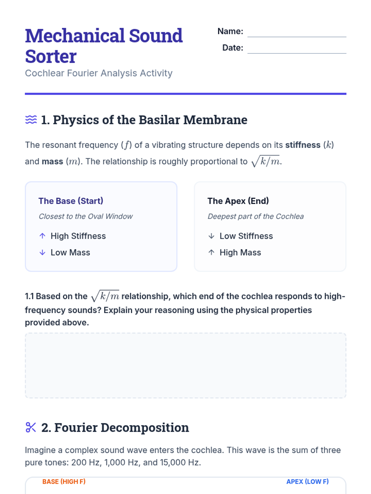 Students study the resonance properties of the basilar membrane. They create models to understand how the cochlea performs a mechanical Fourier analysis to distinguish pitch.