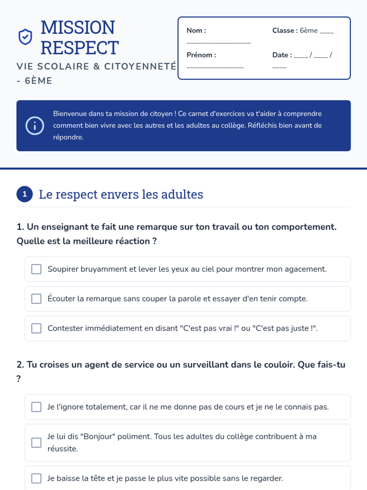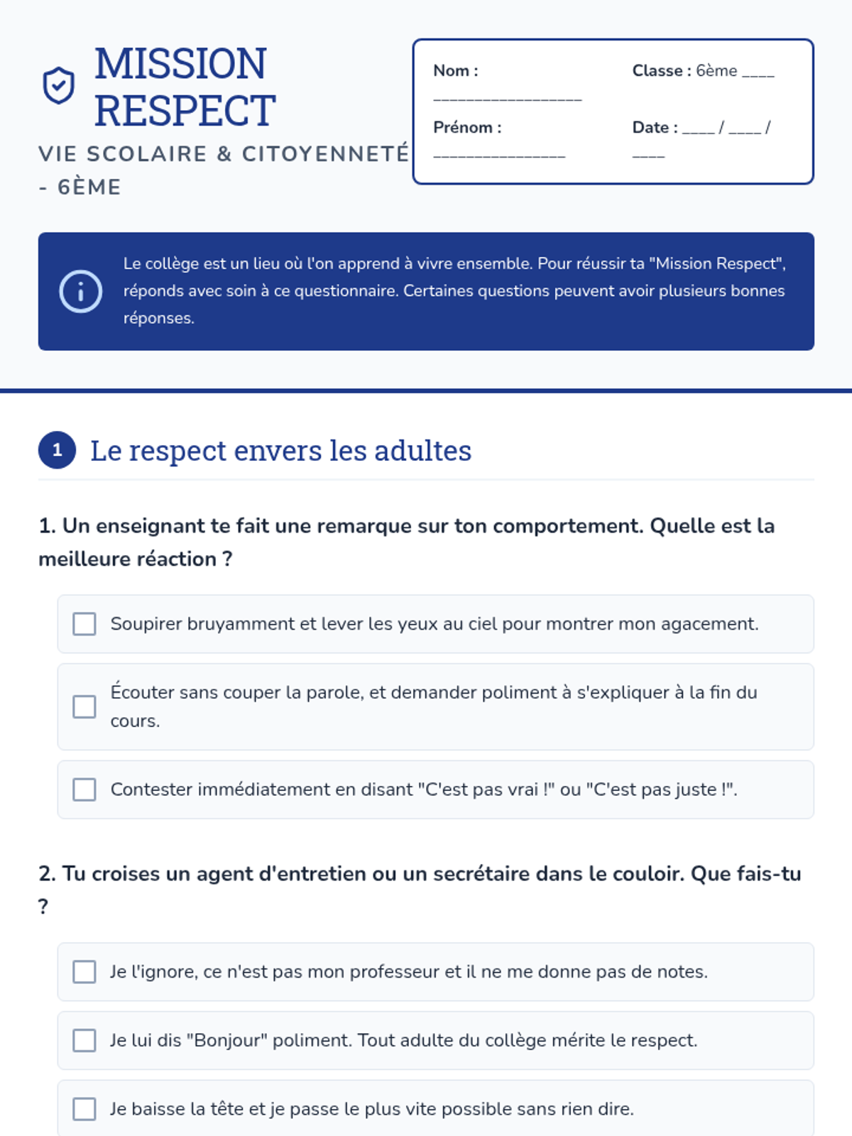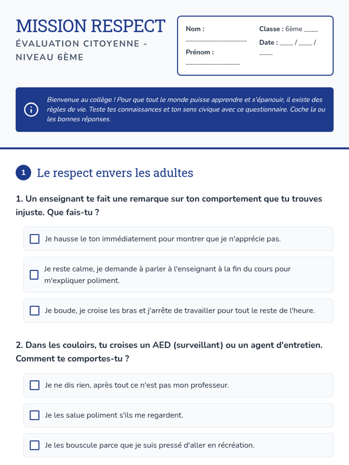 Cette leçon aborde les notions de respect des adultes et des pairs, la compréhension du règlement intérieur et les conséquences des actes au collège.