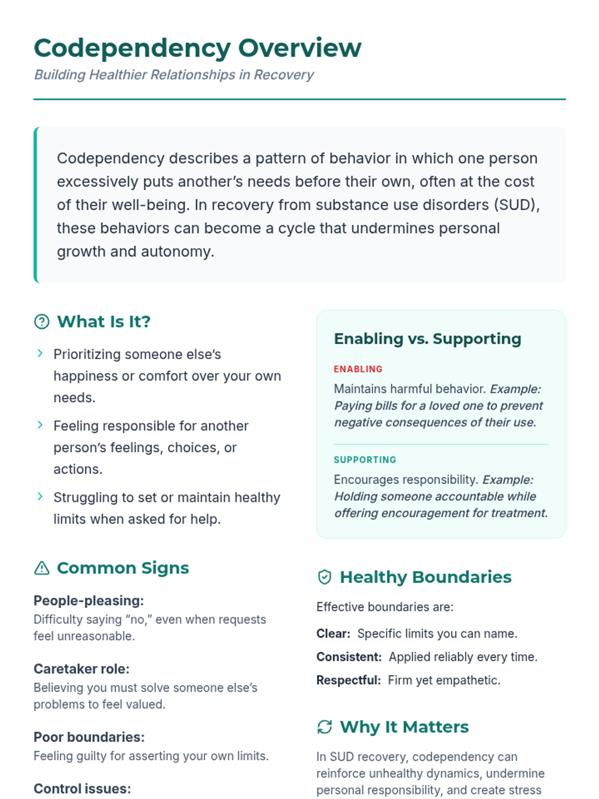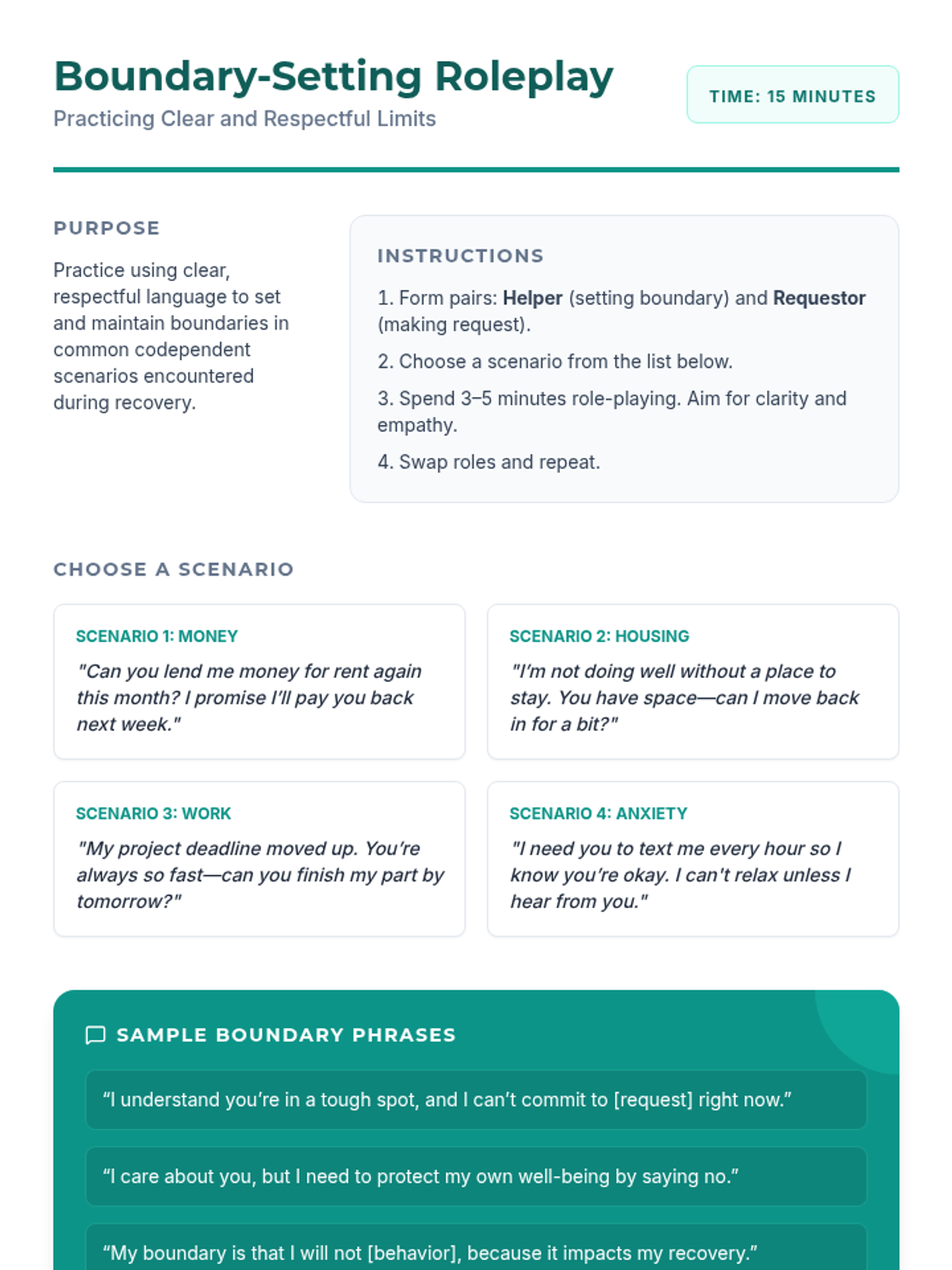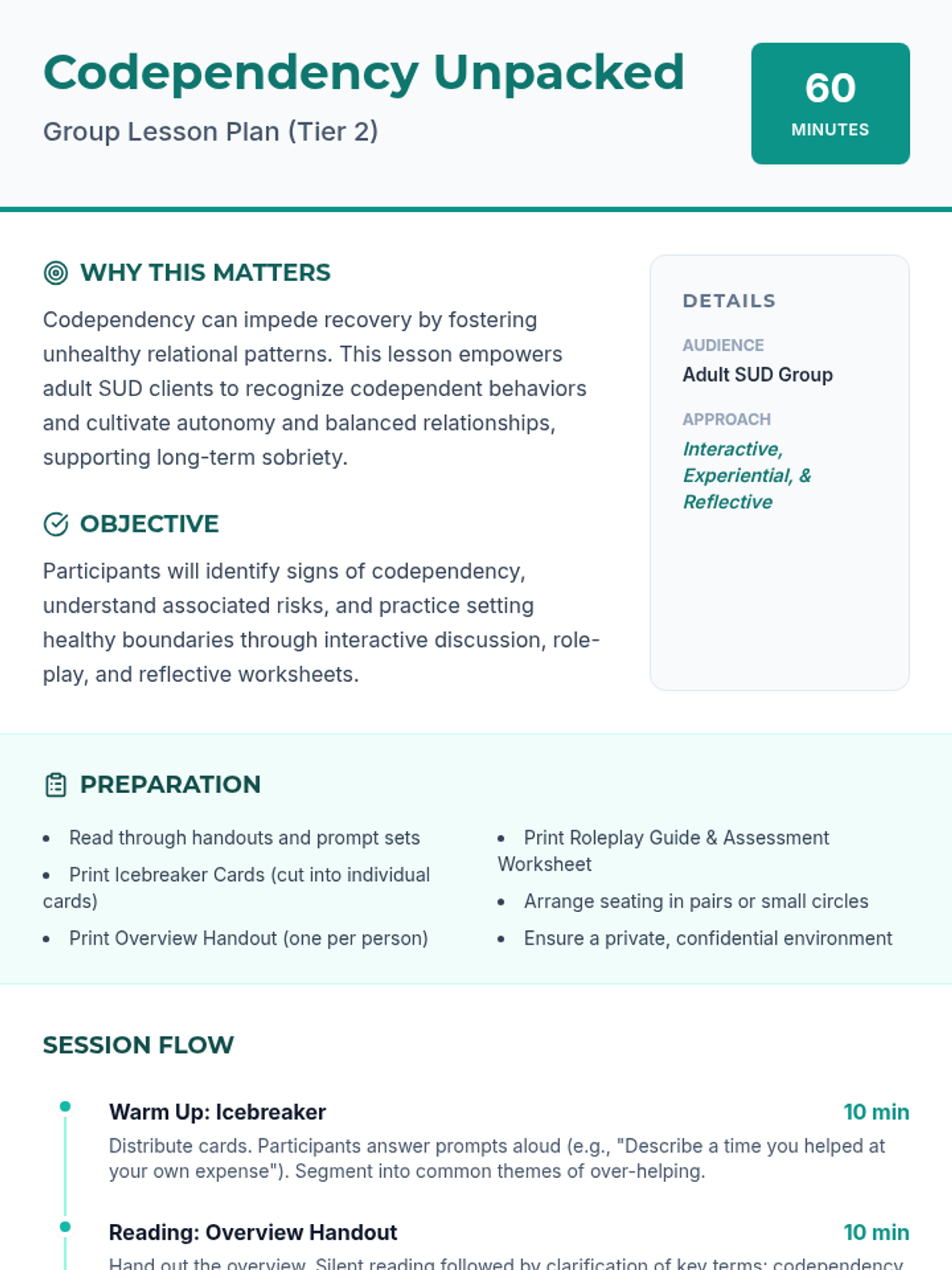 A 60-minute interactive group session for adult SUD clients to explore codependency, recognize unhealthy relational patterns, and practice setting boundaries to support autonomy and recovery.