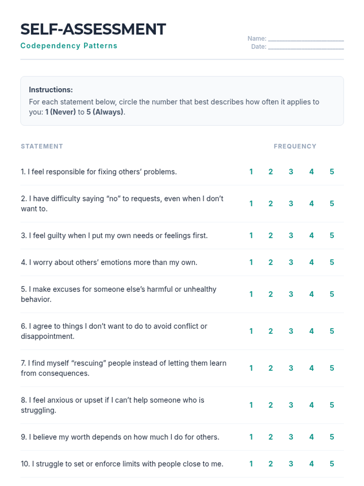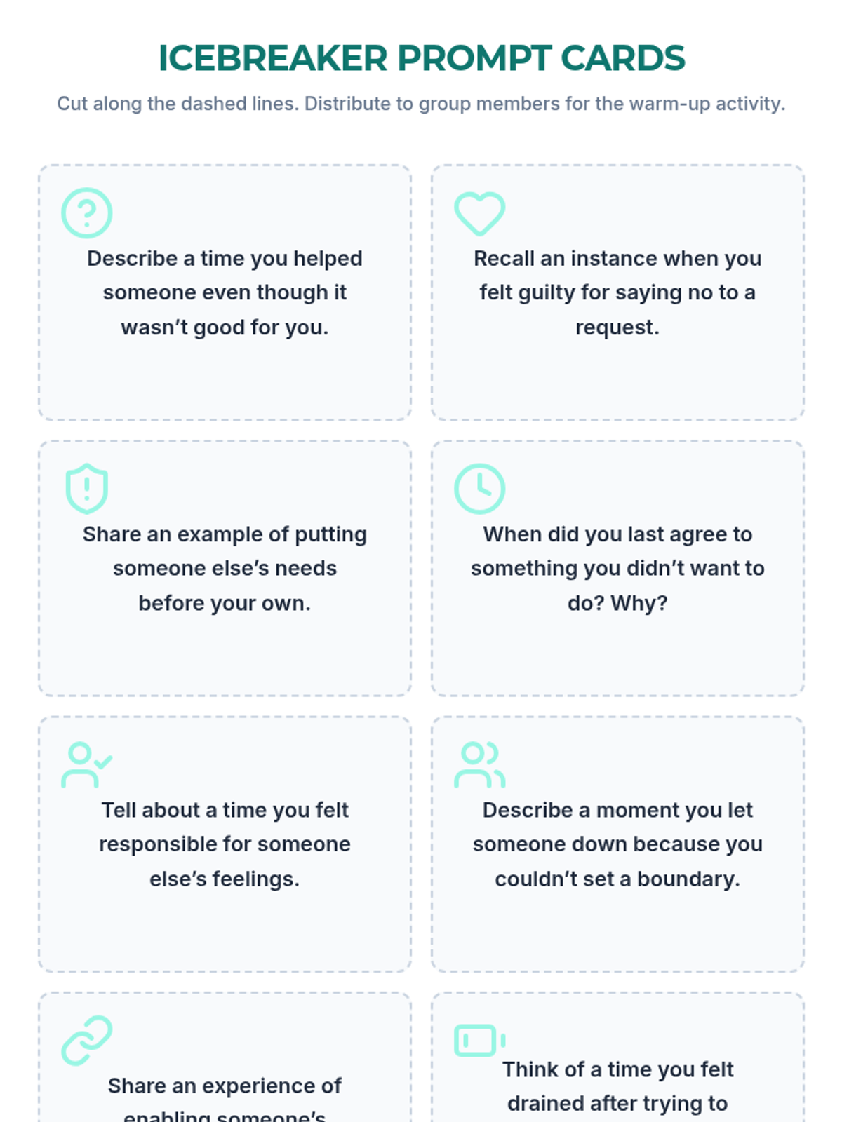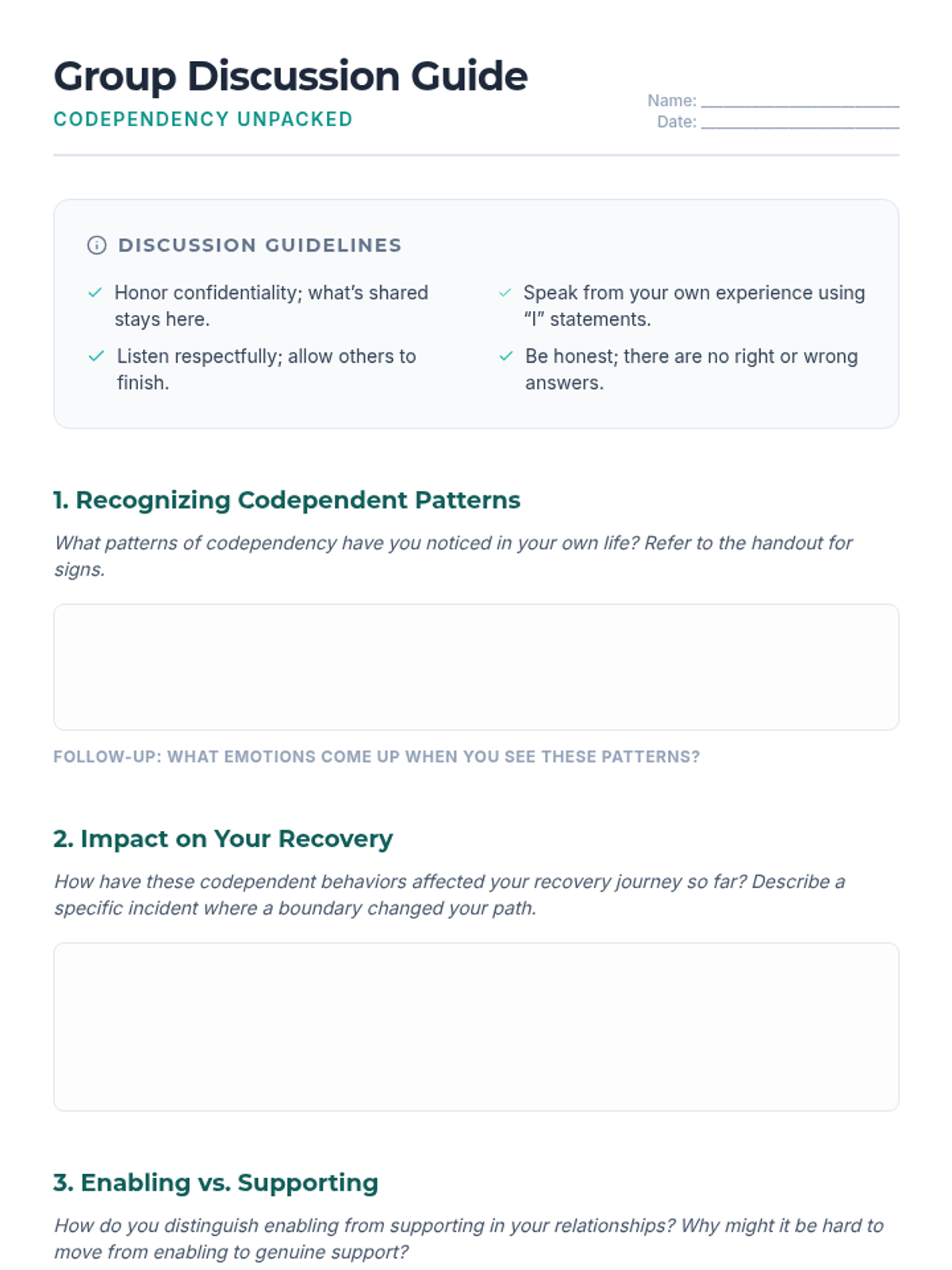 A 60-minute interactive group session for adult SUD clients to explore codependency, recognize unhealthy relational patterns, and practice setting boundaries to support autonomy and recovery.