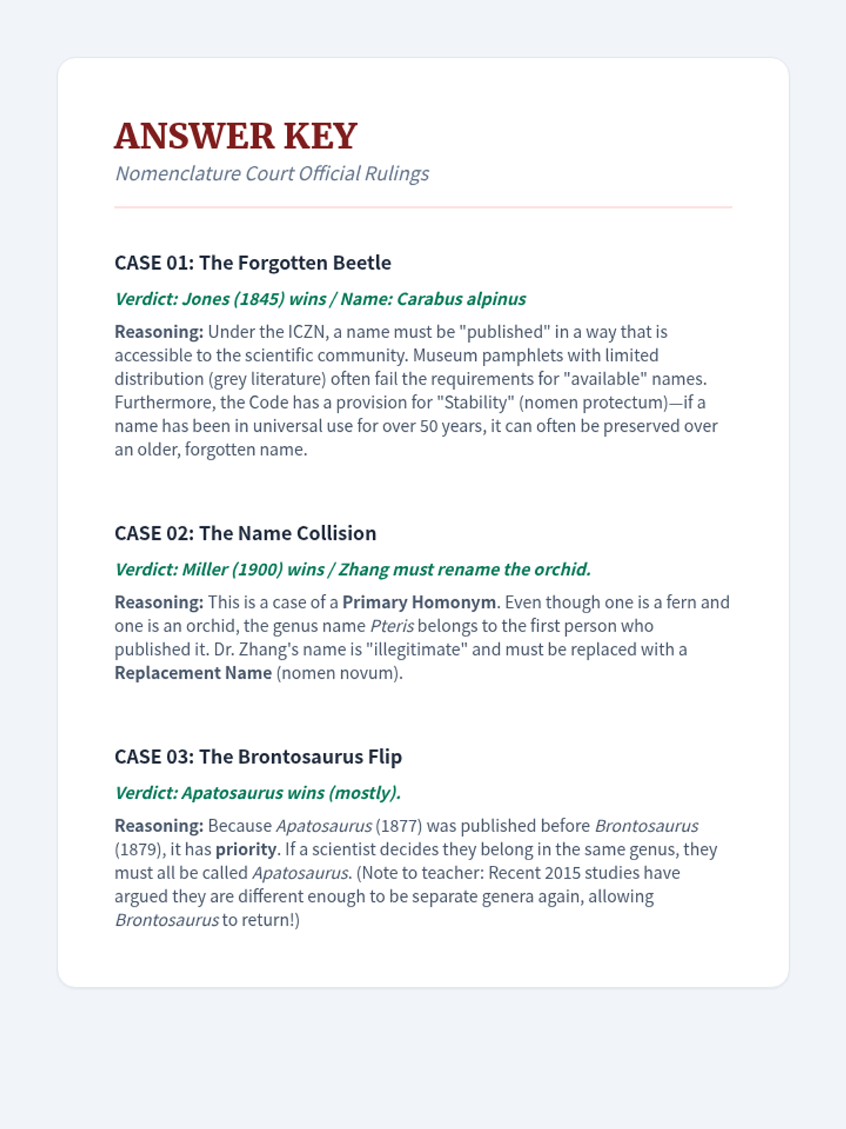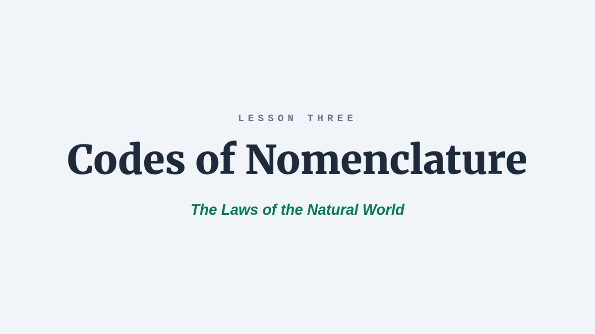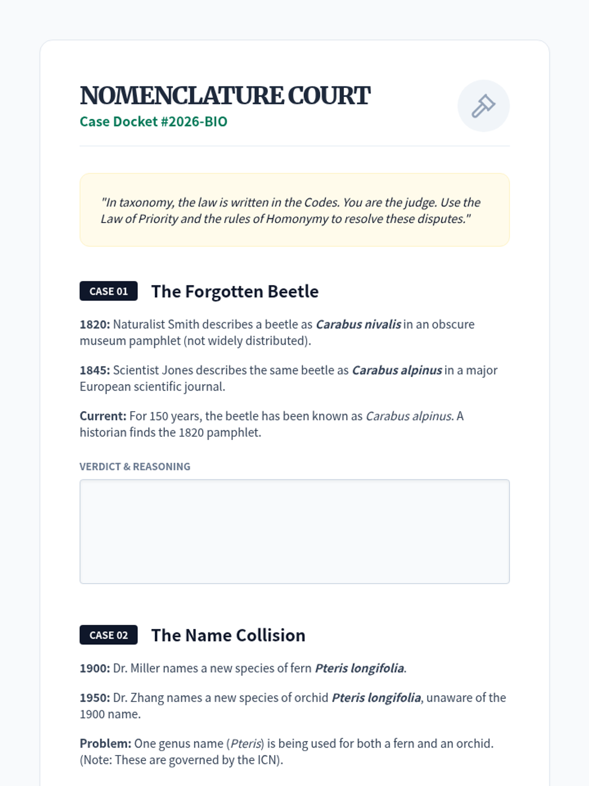 Focuses on the technical rules of scientific naming (ICZN and ICN), addressing priority, synonymy, and homonymy through a nomenclatural dispute workshop.