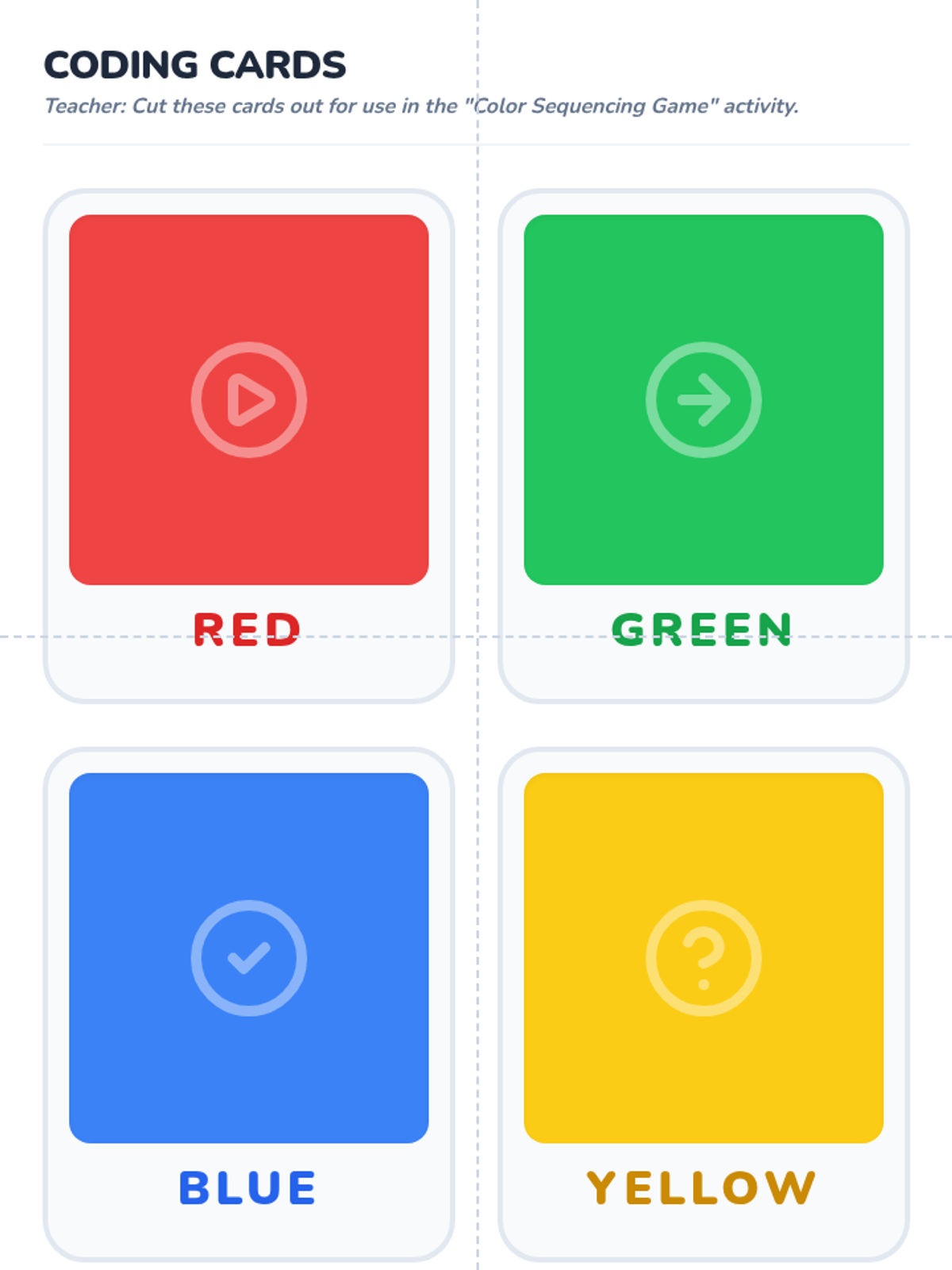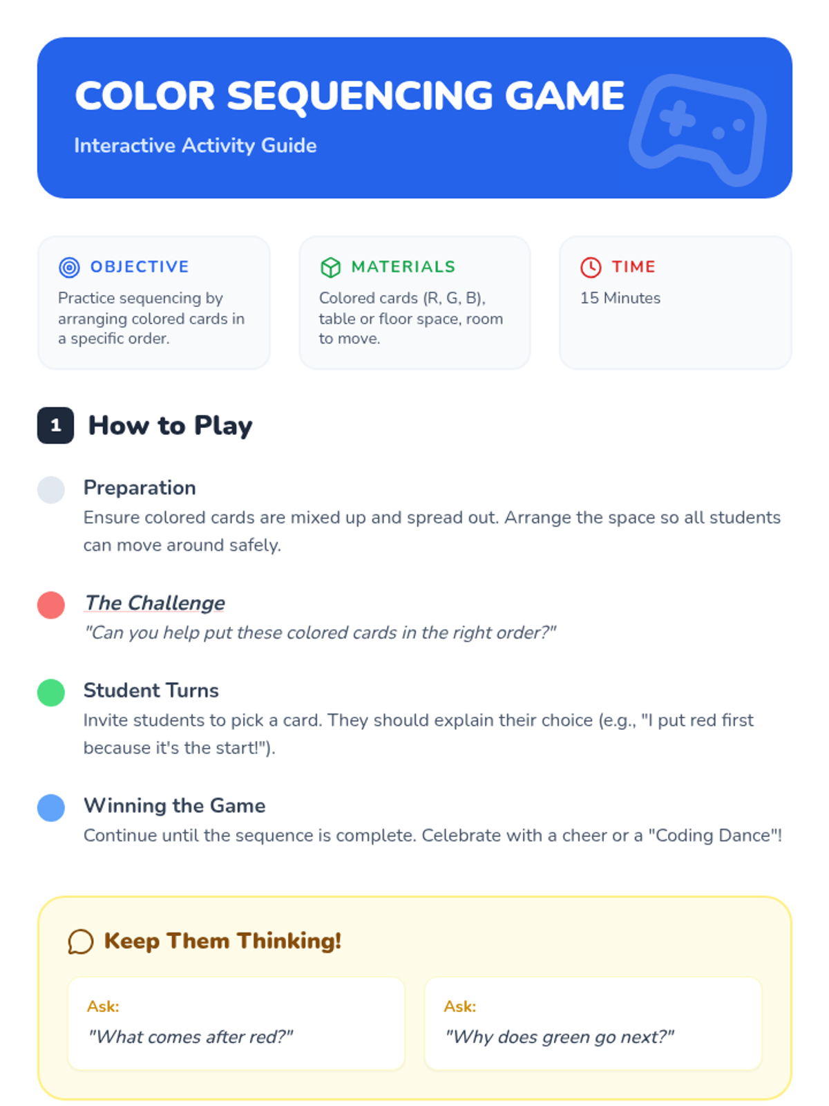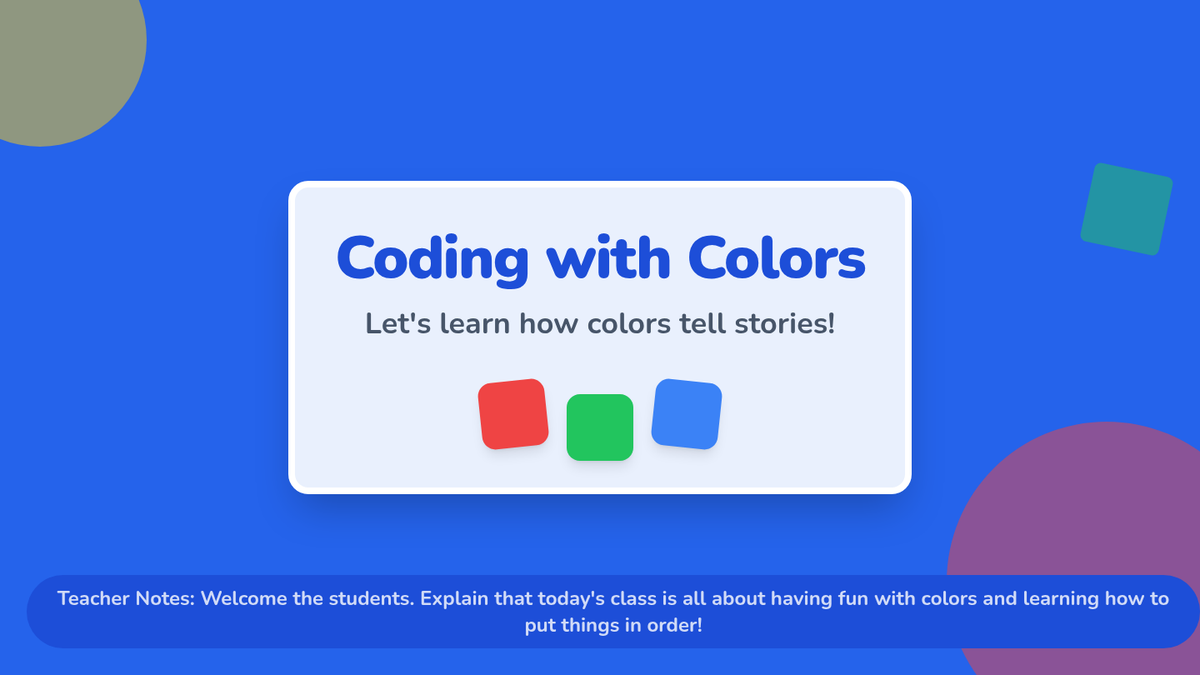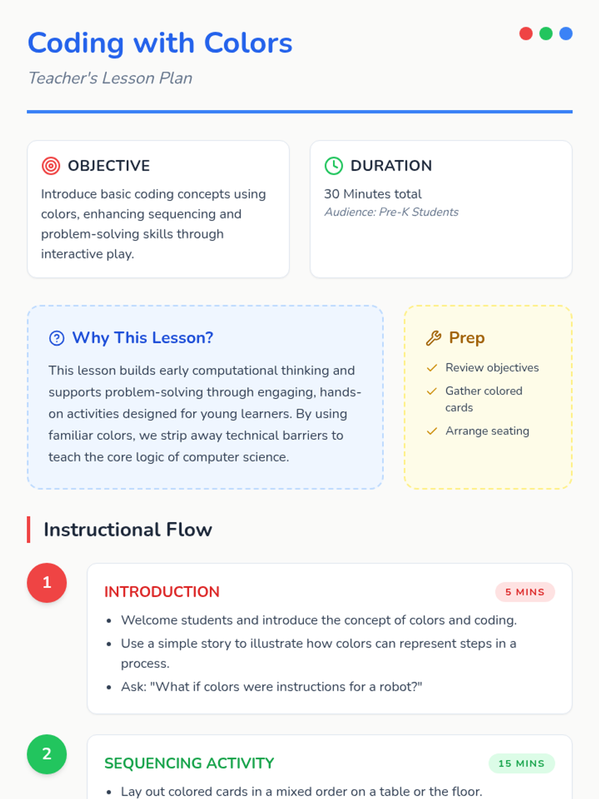 An introductory computer science lesson for Pre-K students using colors to teach the fundamental concept of sequencing and algorithmic thinking.