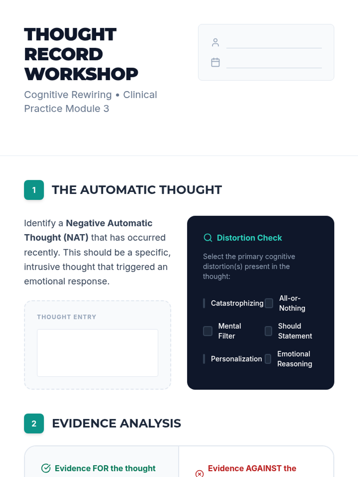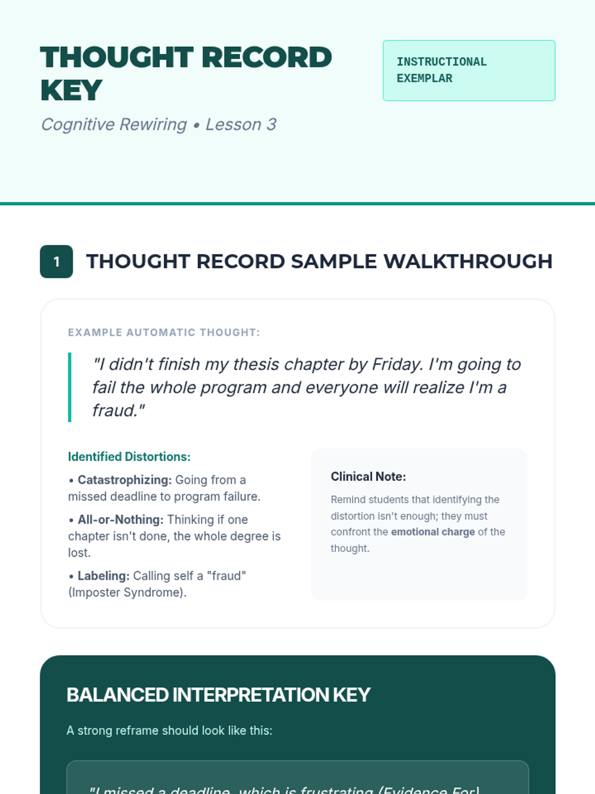 Students explore the theoretical framework of Cognitive Behavioral Therapy (CBT), identifying cognitive distortions and practicing techniques for cognitive restructuring.