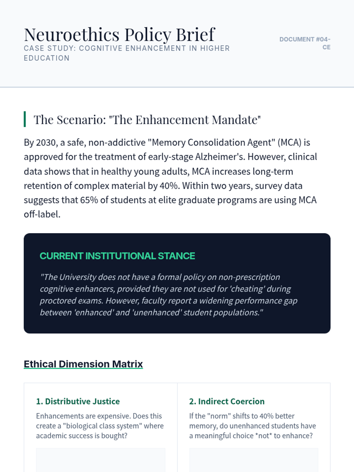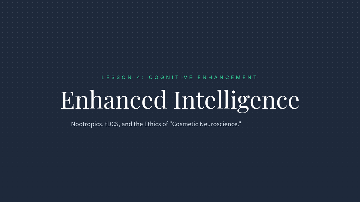 Investigate the pharmacology and ethics of cognitive enhancement, debating distributive justice and the societal impact of nootropics.