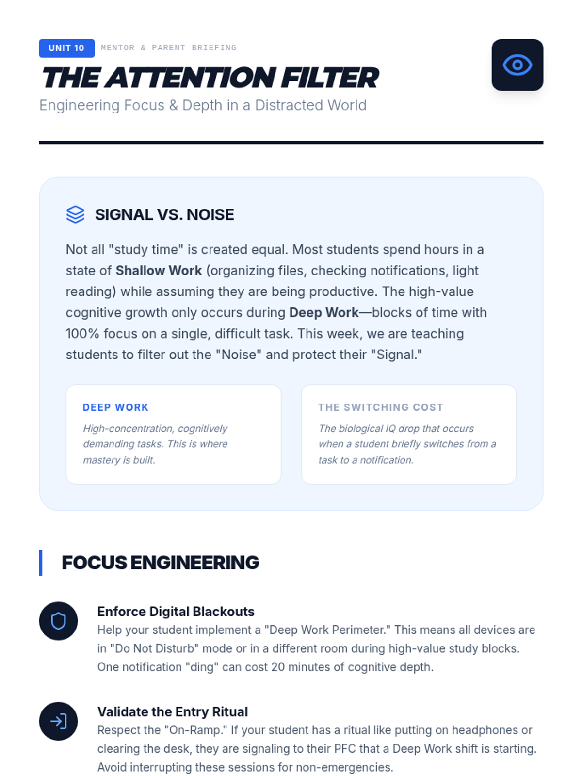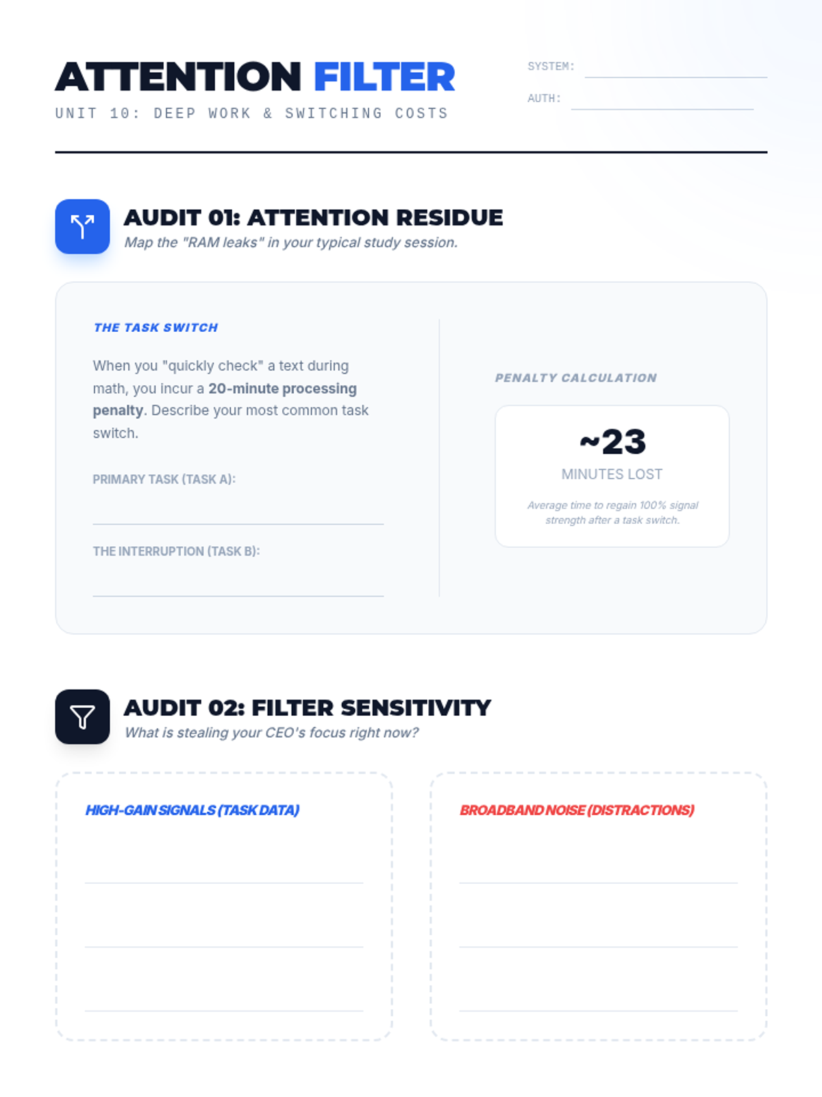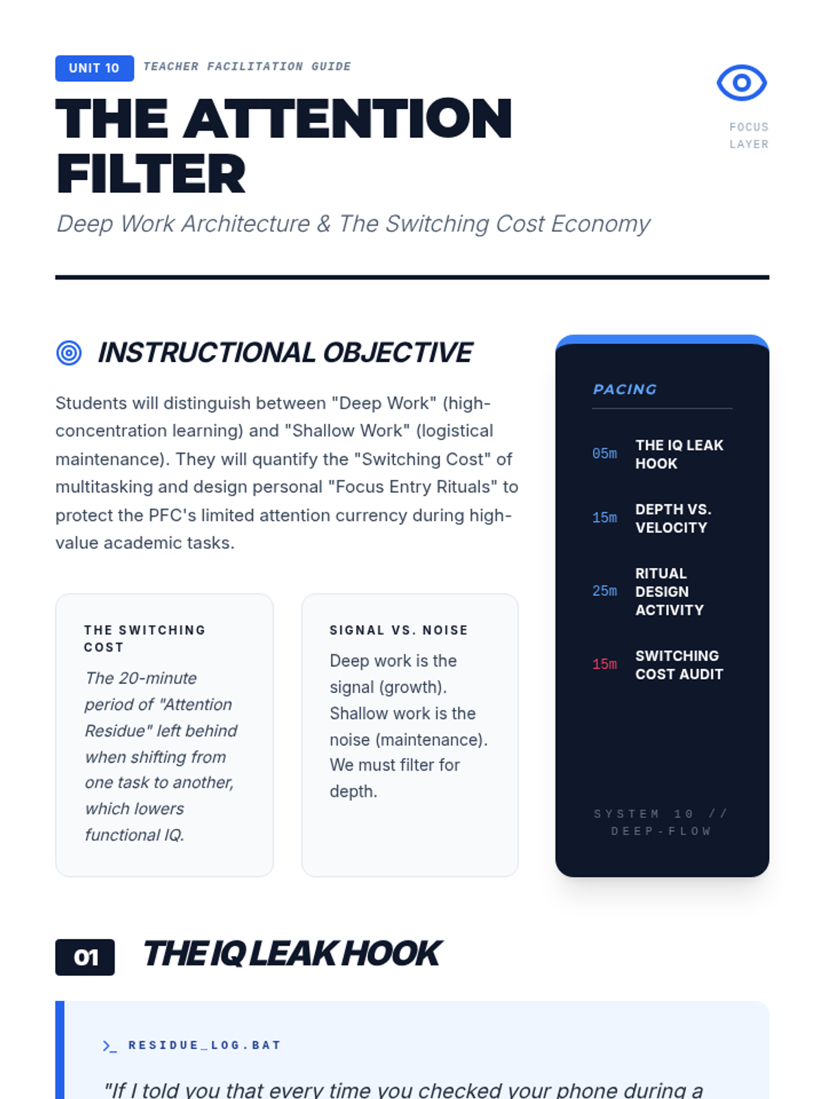 Explores the 'Cognitive Filter'. Teaches the difference between 'Deep Work' and 'Shallow Work' and how to manage the 'Switching Cost' of multi-tasking.