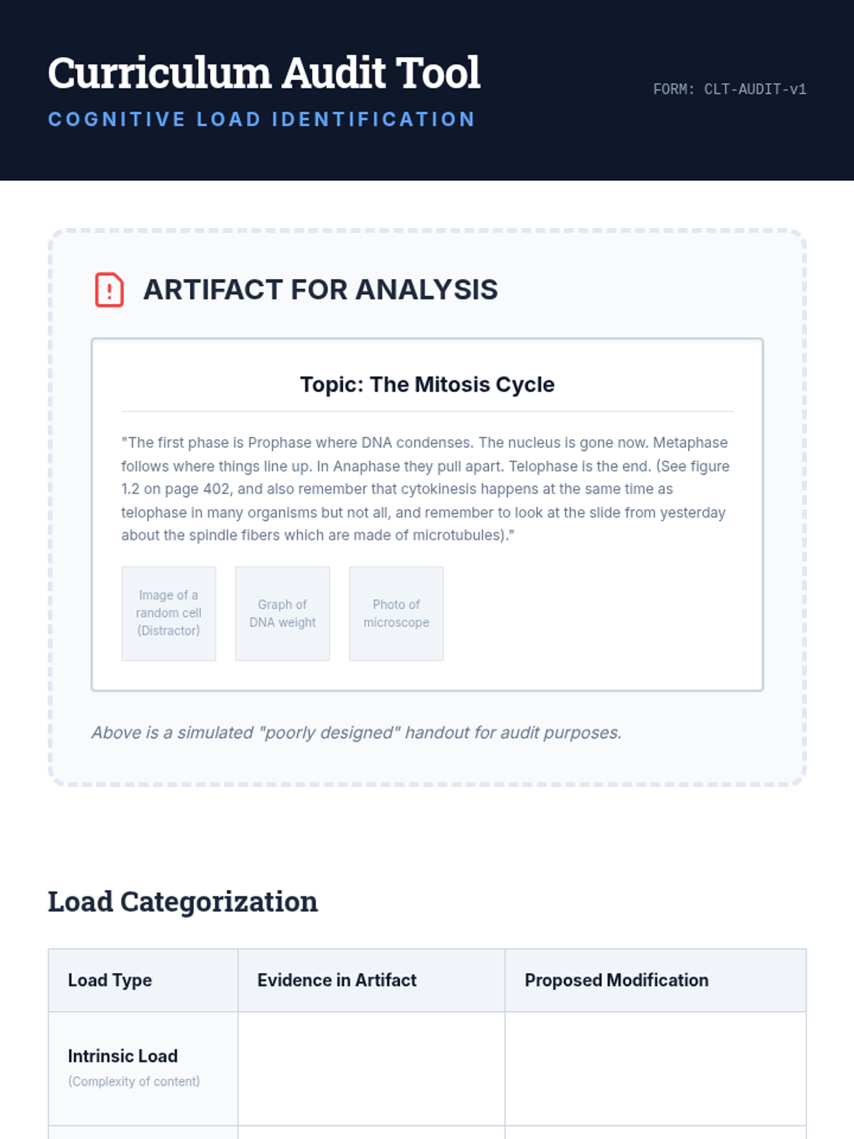 This lesson distinguishes between intrinsic, extraneous, and germane cognitive load, requiring students to evaluate instructional materials for design flaws that hinder retention.