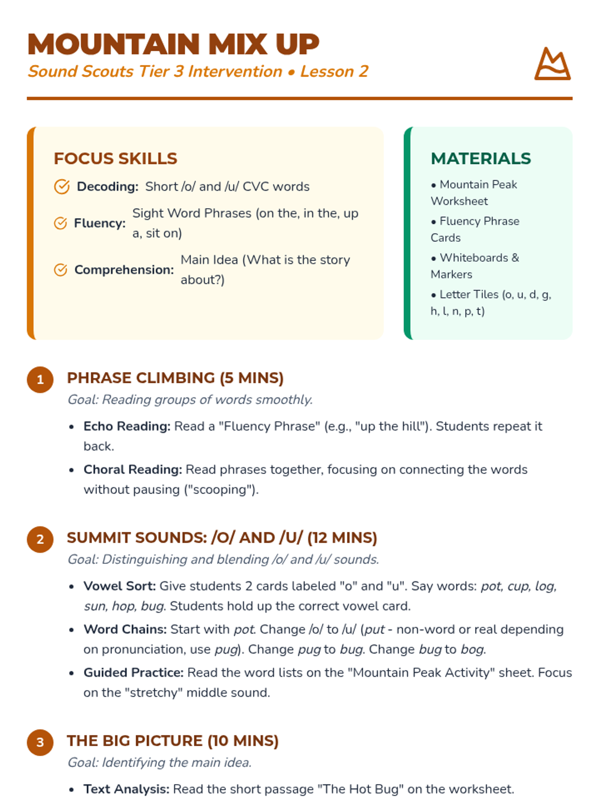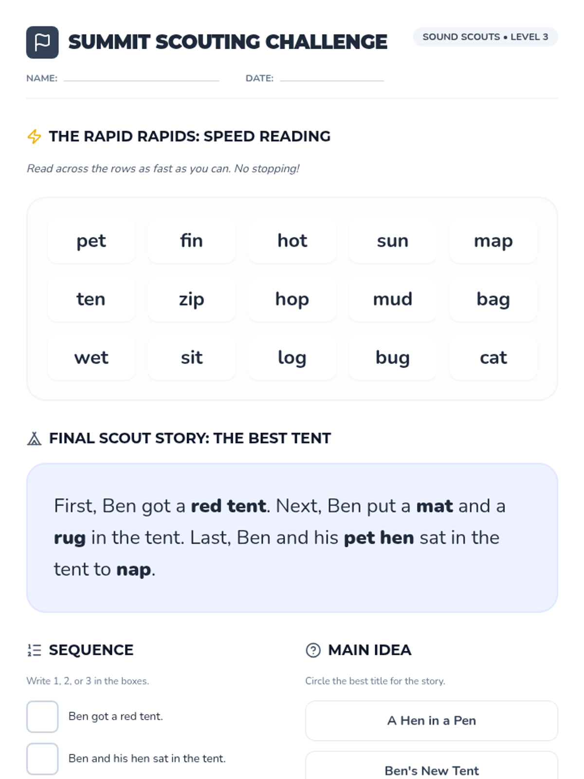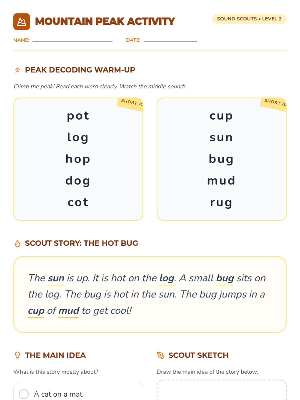 Targets short 'o' and 'u' CVC words, identifying the main idea of short passages, and increasing reading rate with sight word phrases.