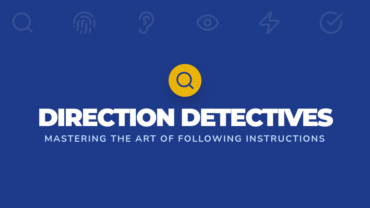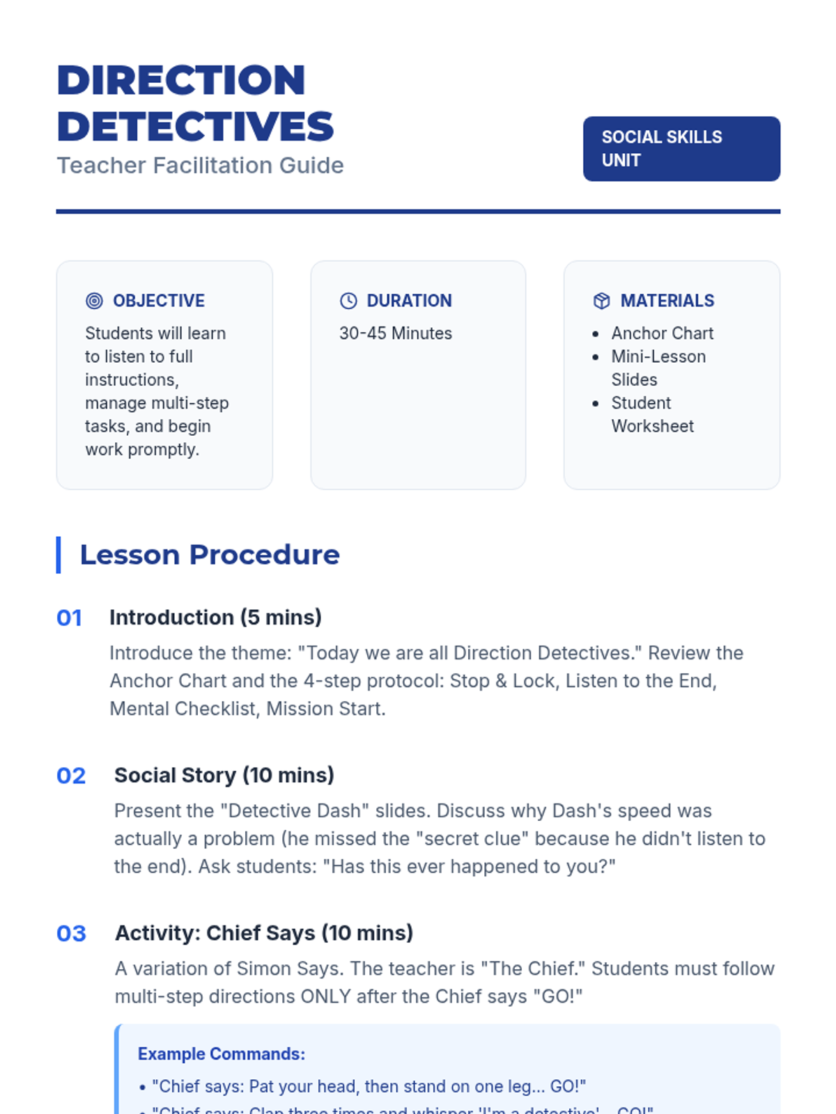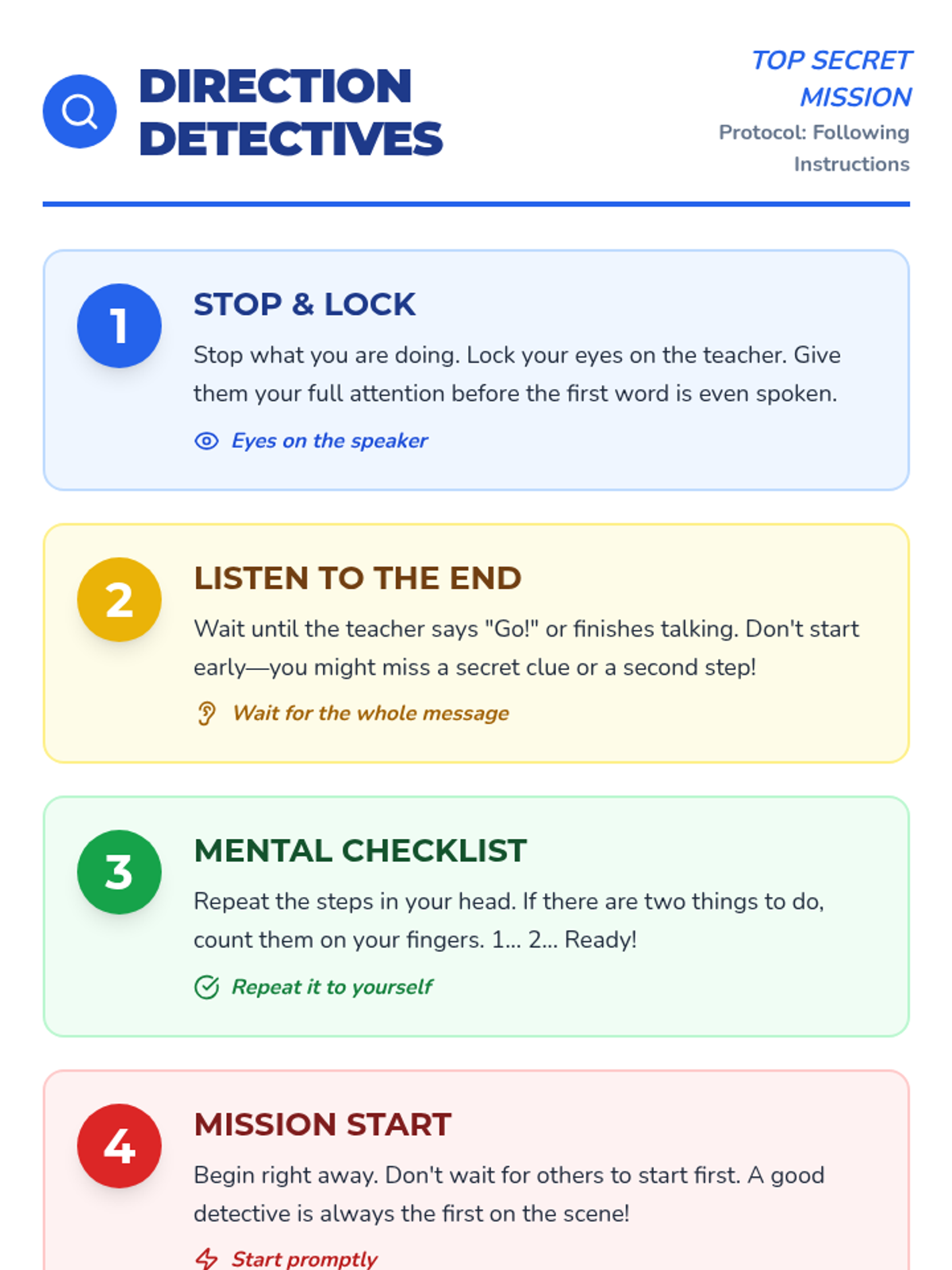 A social skills lesson focused on listening to full instructions, handling multi-step tasks, and beginning work immediately using a detective theme.