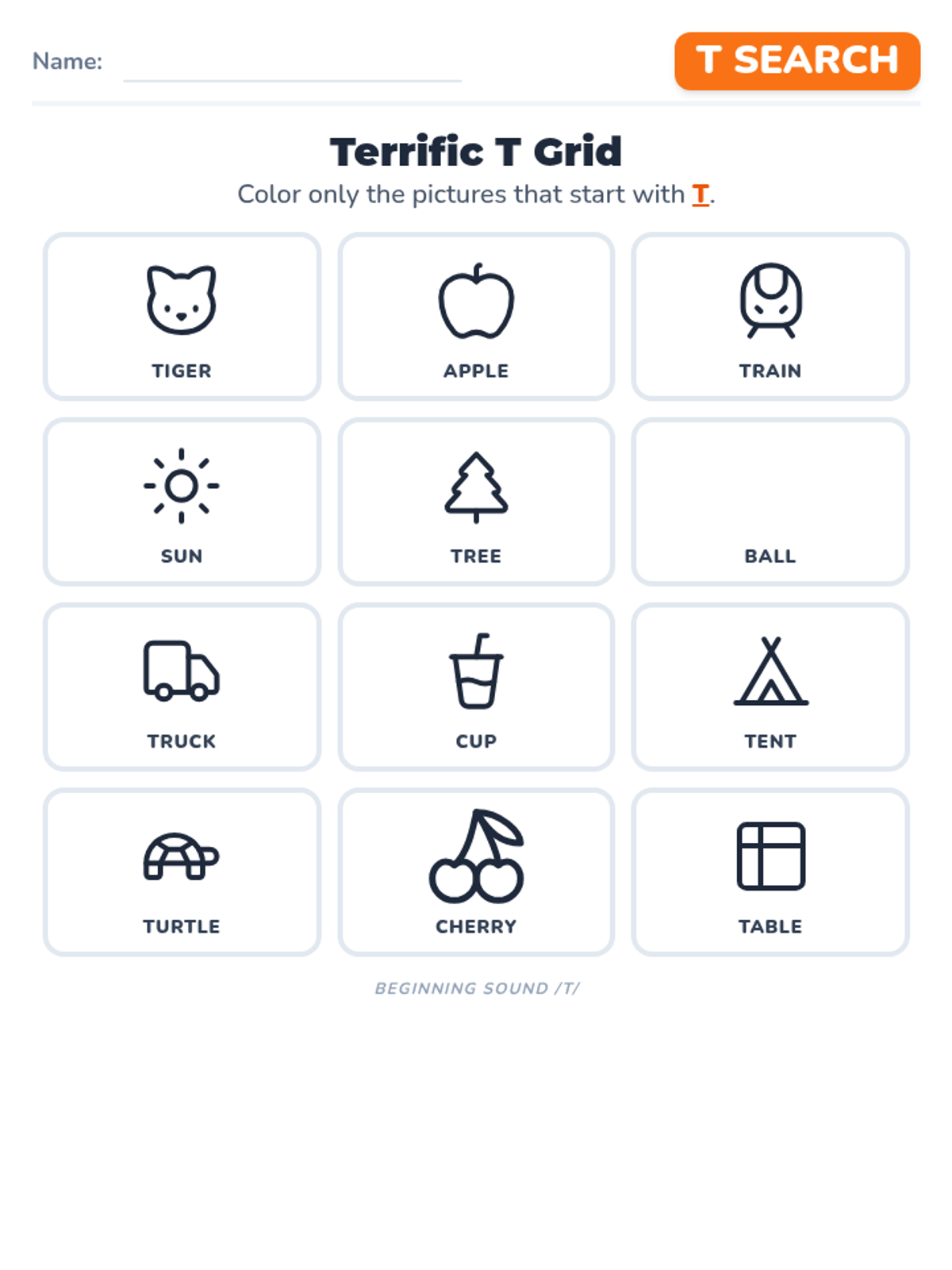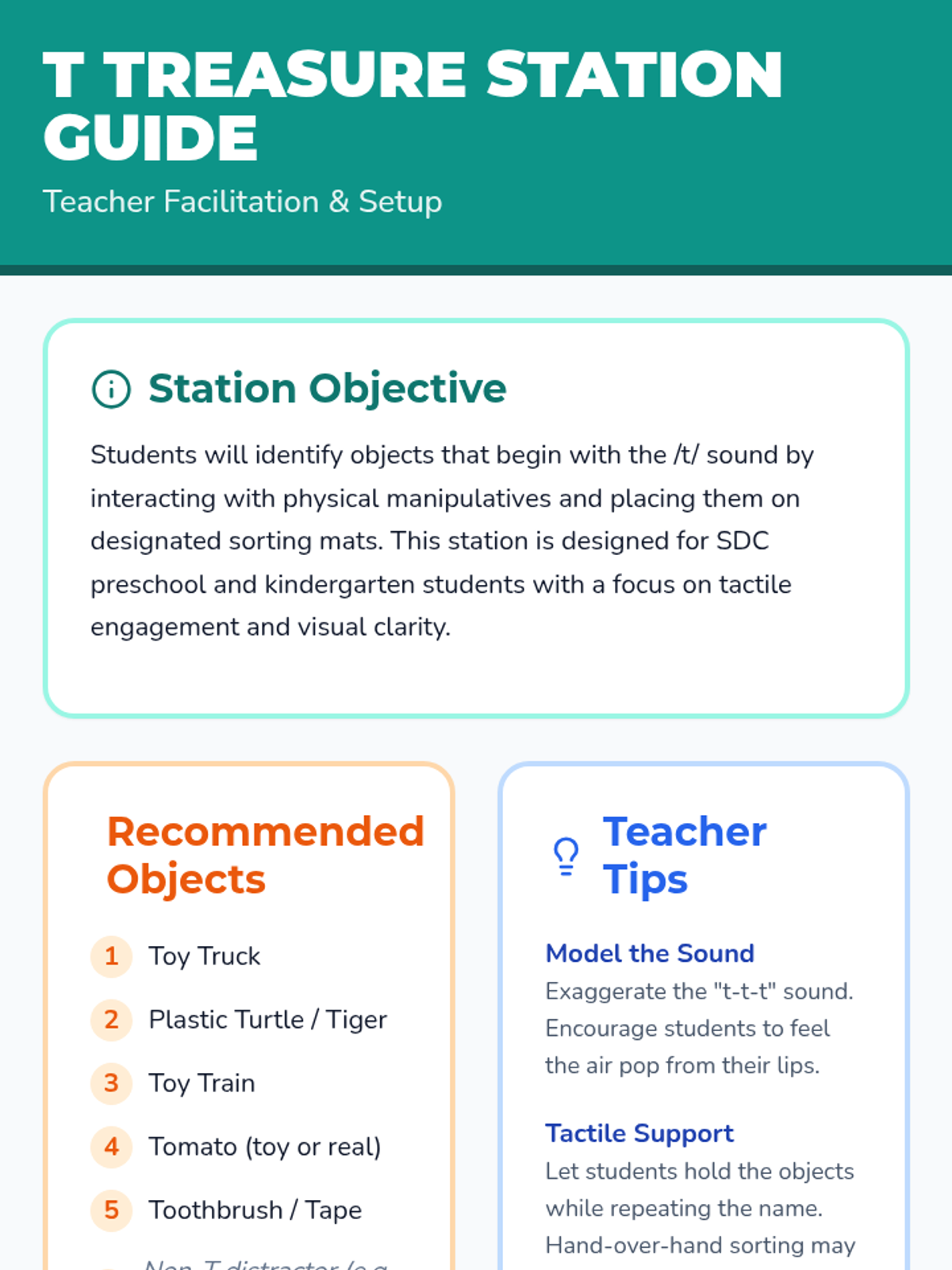 An introductory station-based lesson for preschool and kindergarten SDC students to explore the beginning sound /t/ through tactile manipulatives and simplified worksheets.