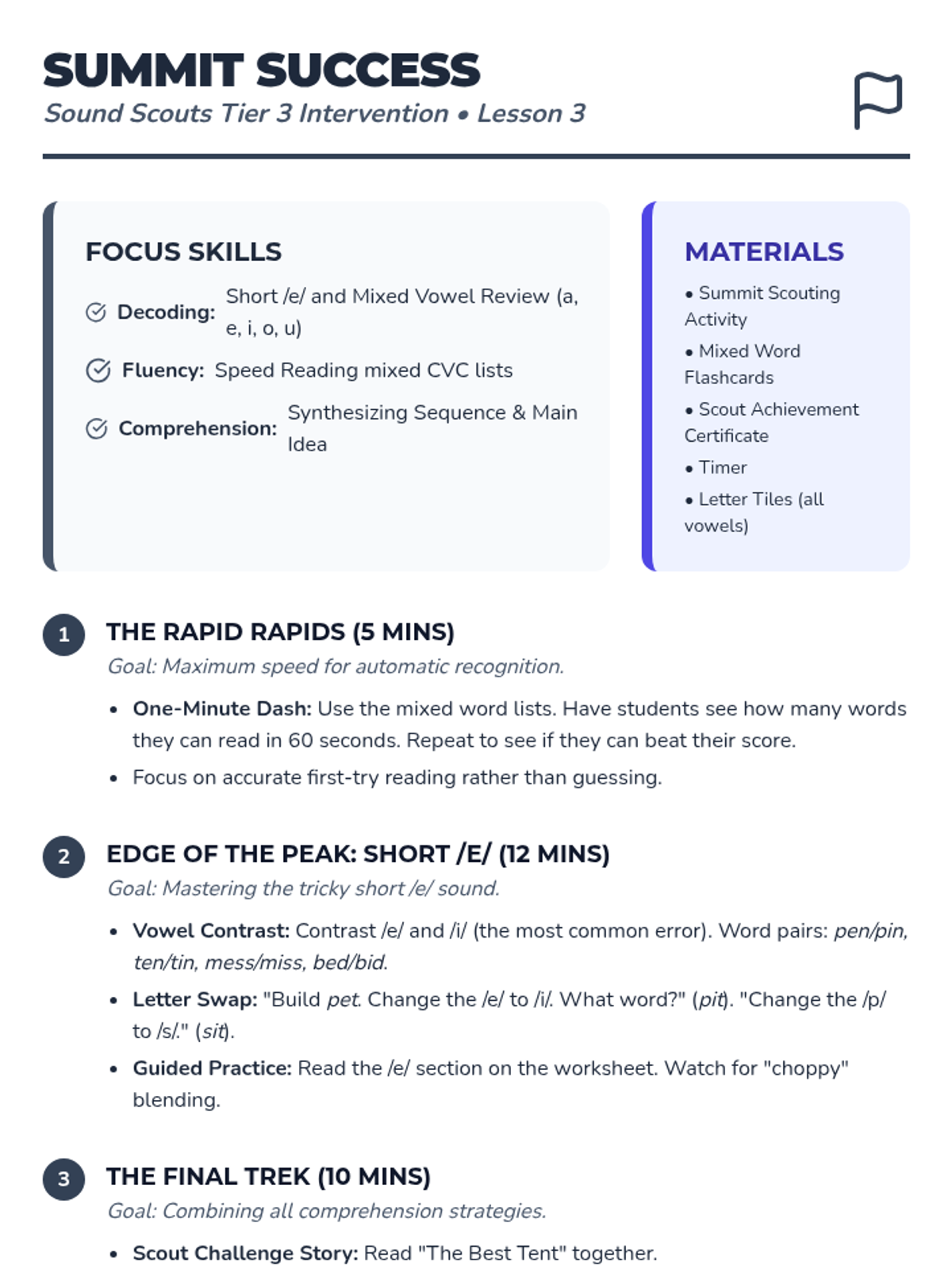 Covers short 'e' and mixed vowel review, synthesizing comprehension skills, and celebrating fluency progress with a final reading challenge.