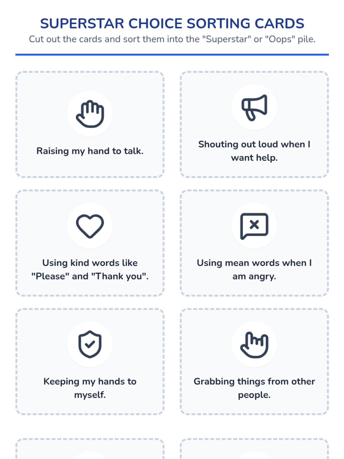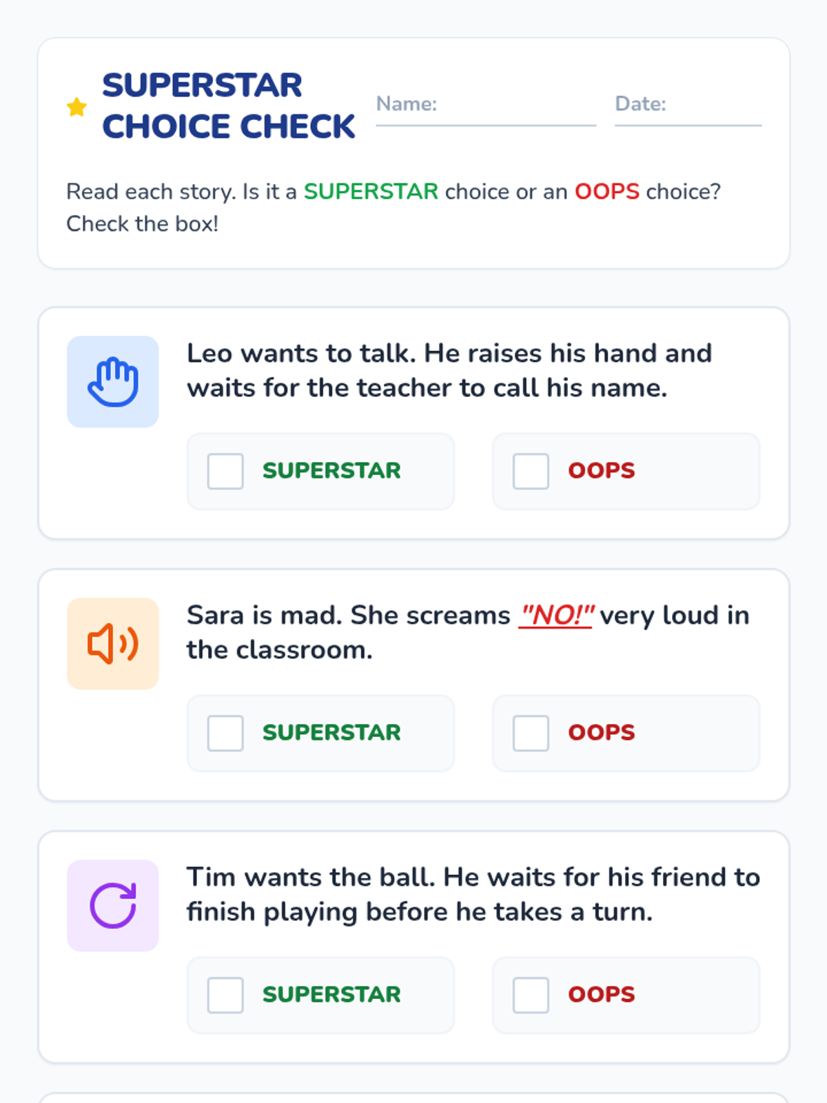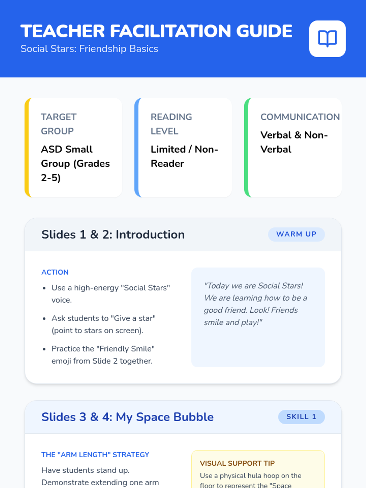 A foundational lesson for students with intellectual disabilities to identify and practice appropriate classroom behaviors like personal space, kind language, and turn-taking through a social story and interactive sorting.