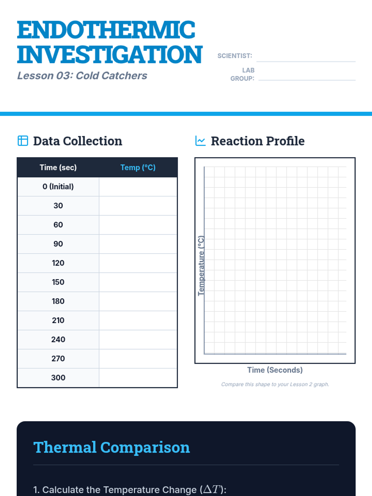 Students investigate the baking soda and vinegar reaction to measure temperature drops and compare endothermic data patterns with previous findings.