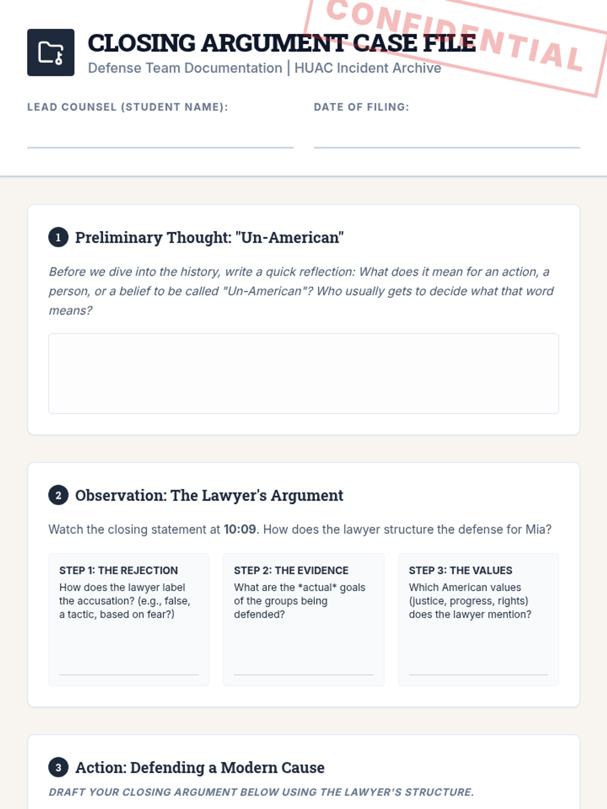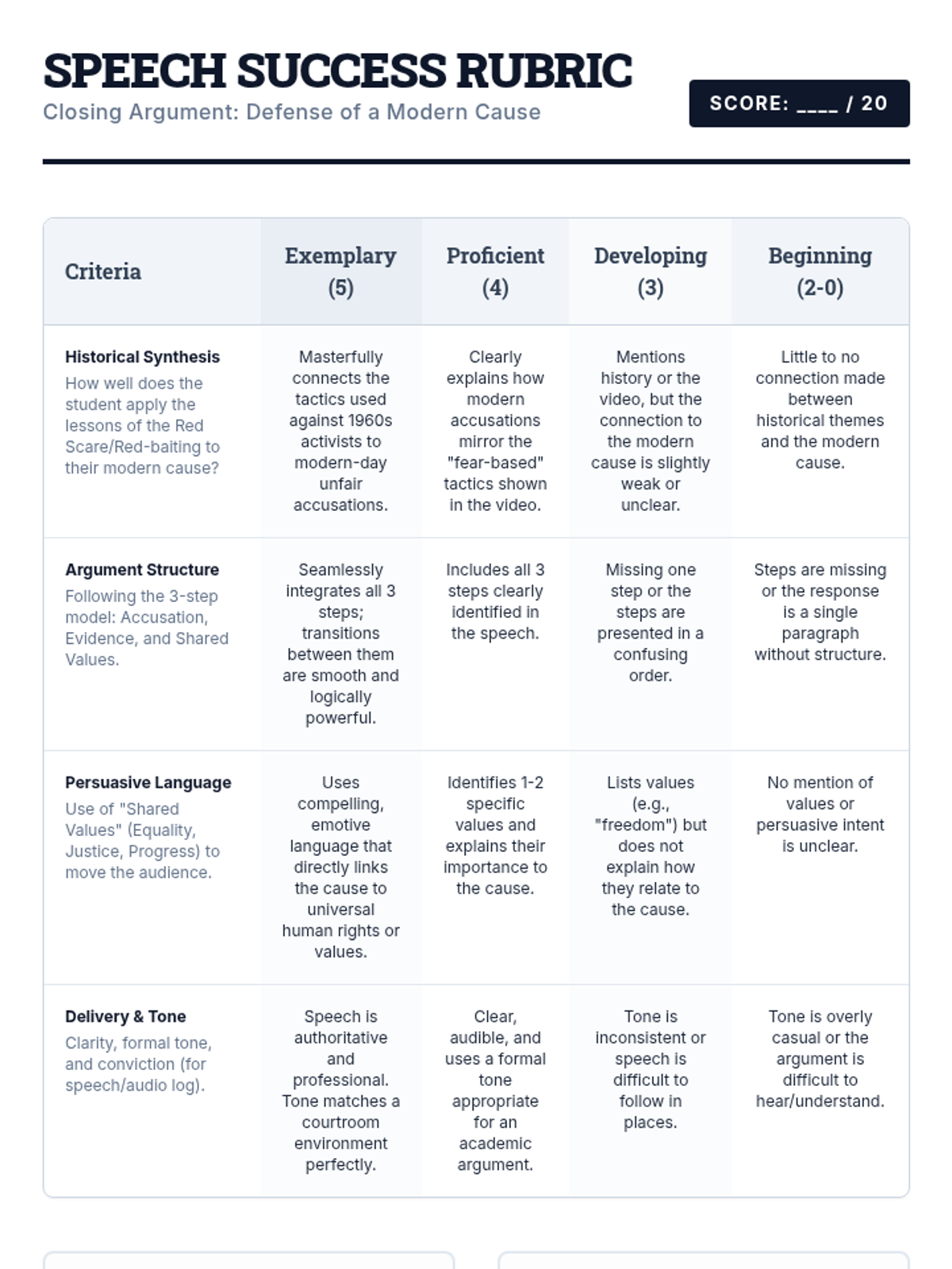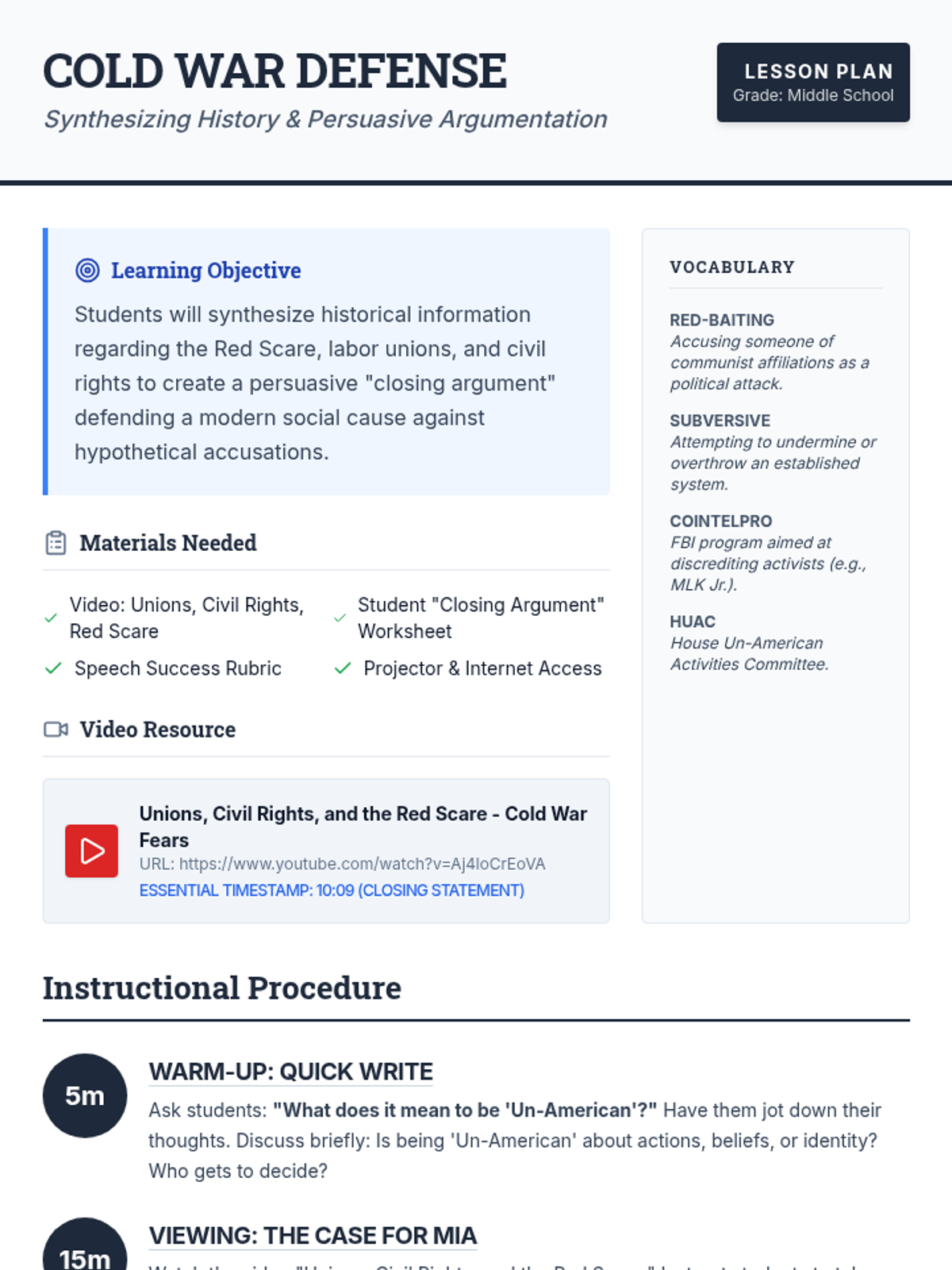 A middle school history and civics lesson where students analyze the impact of the Red Scare on social movements and synthesize this information to draft a persuasive closing argument for a modern cause.