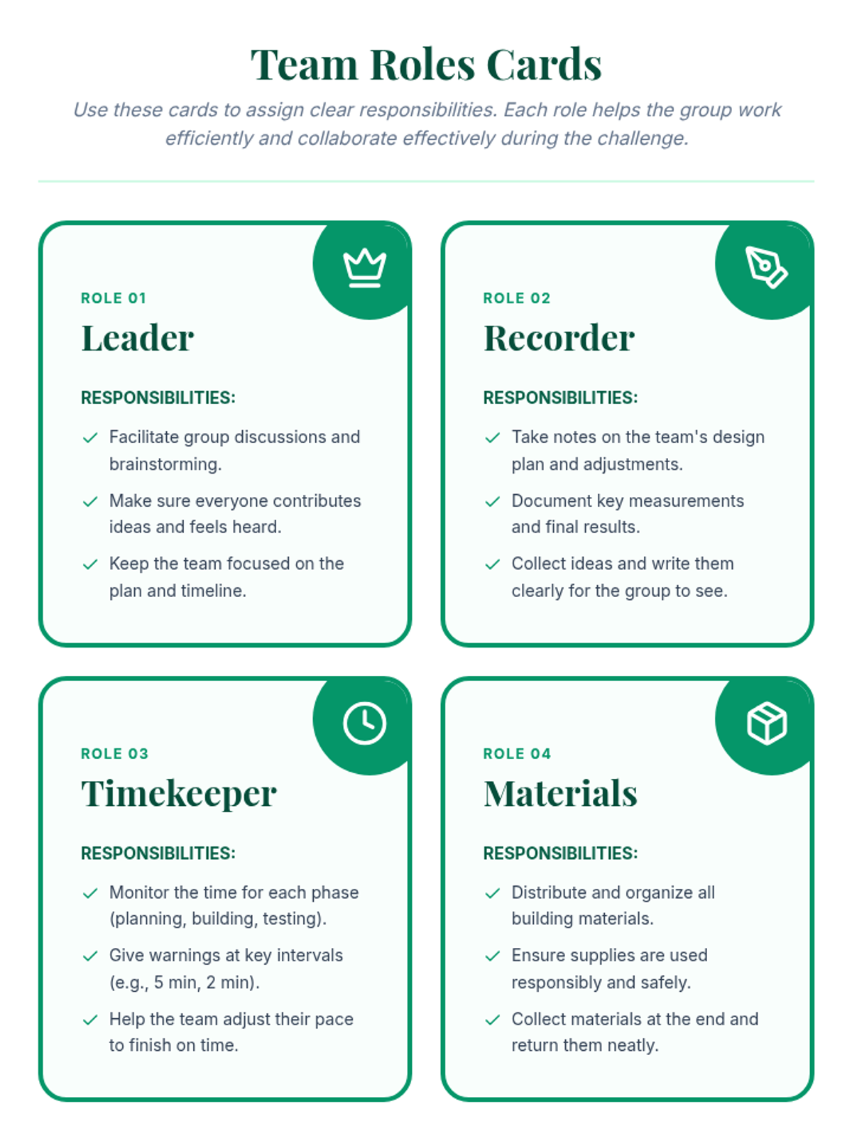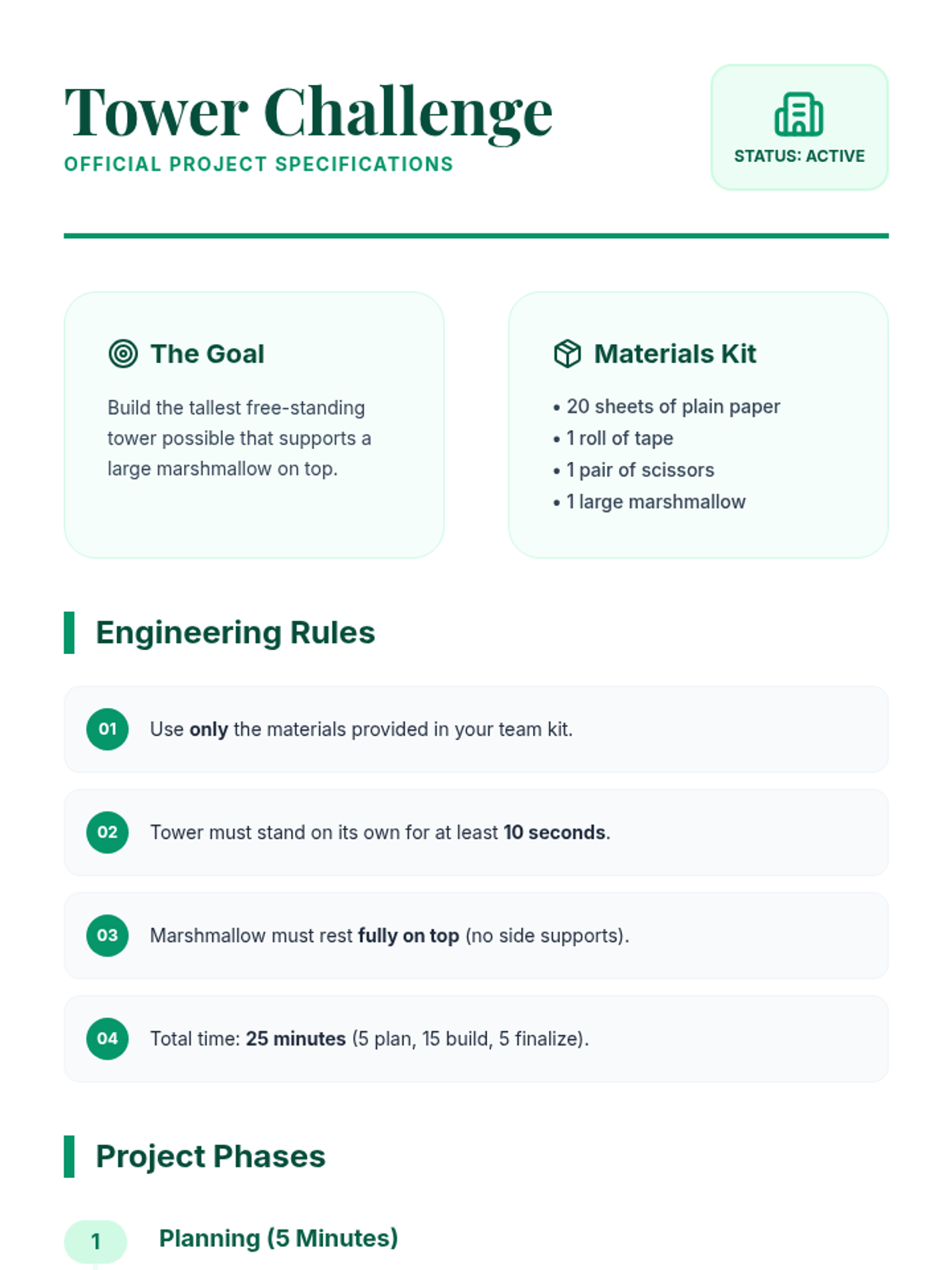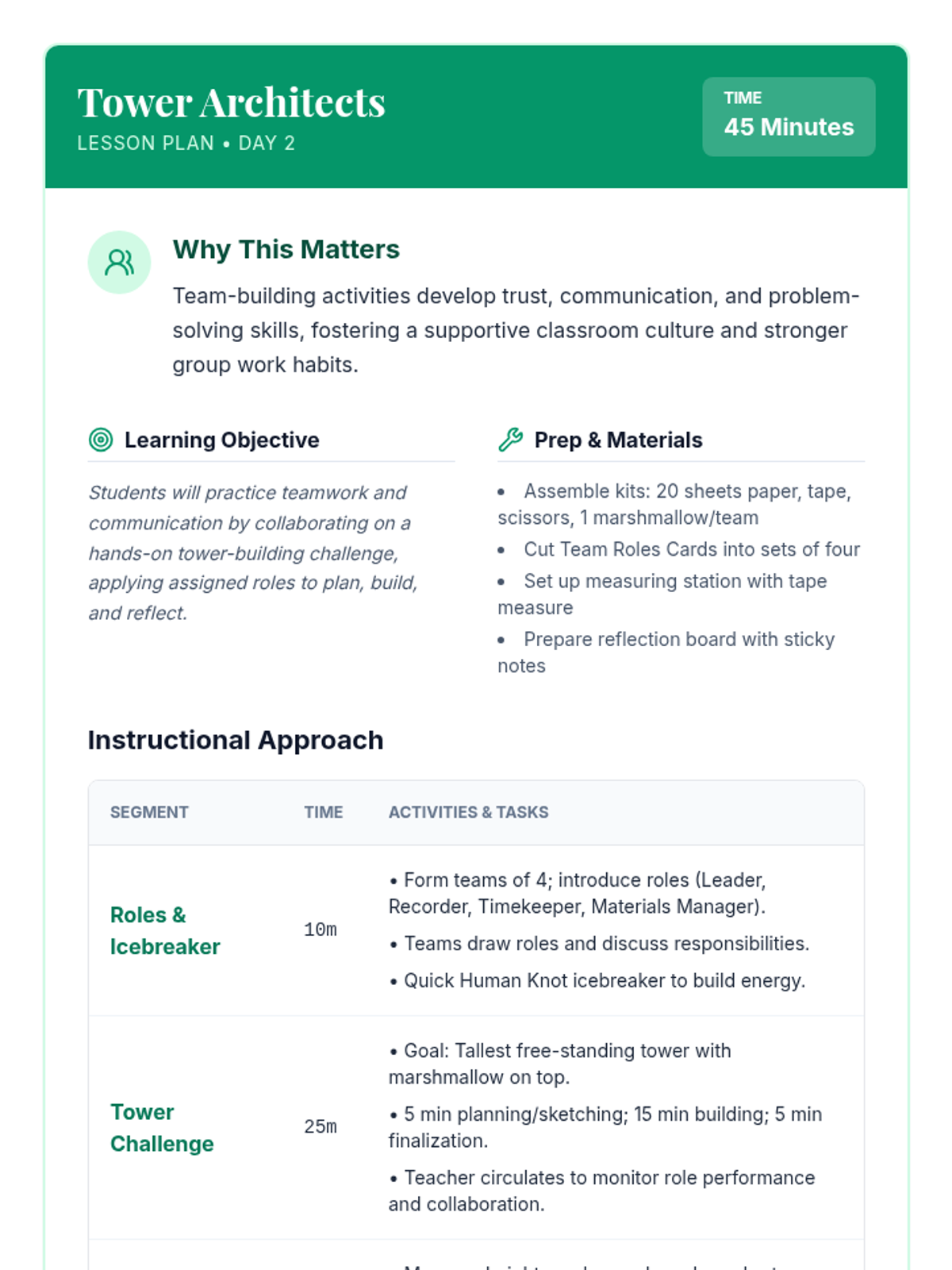 Teams collaborate to build the tallest paper tower, practicing communication and assigned group roles.