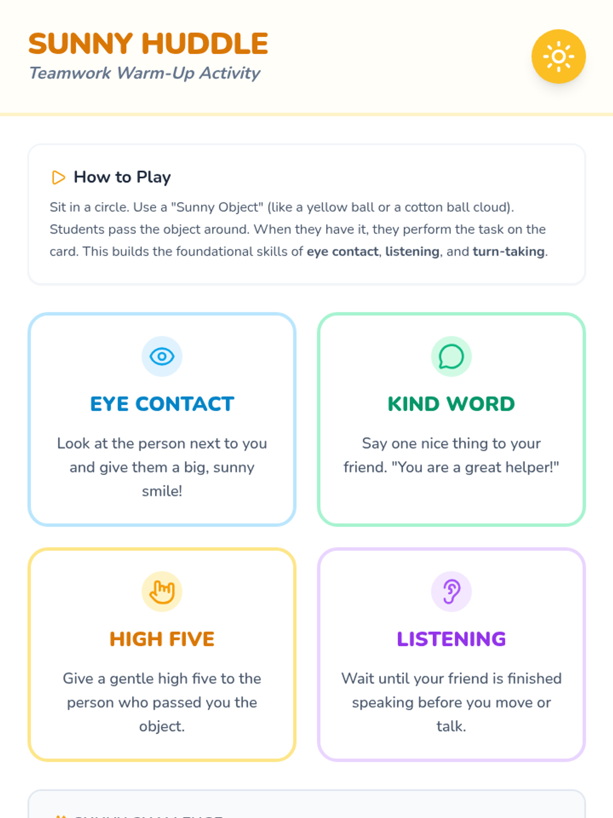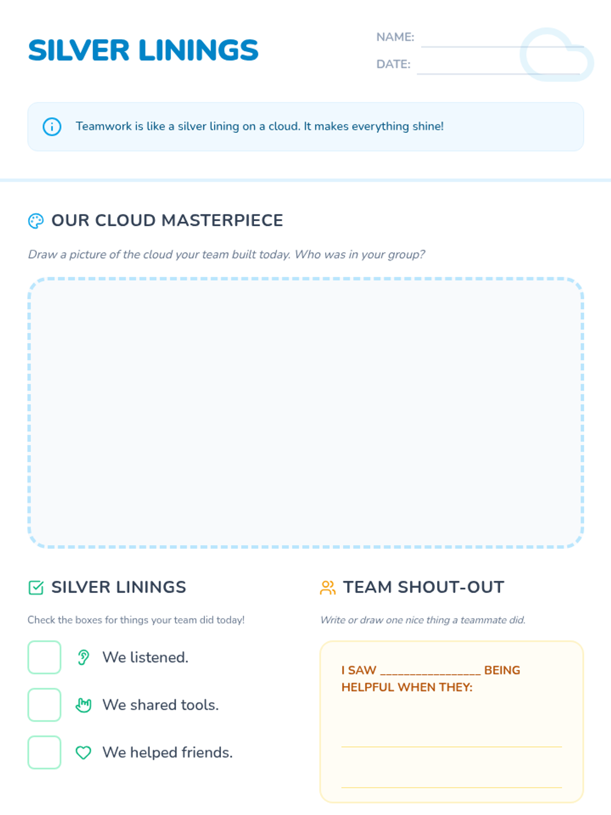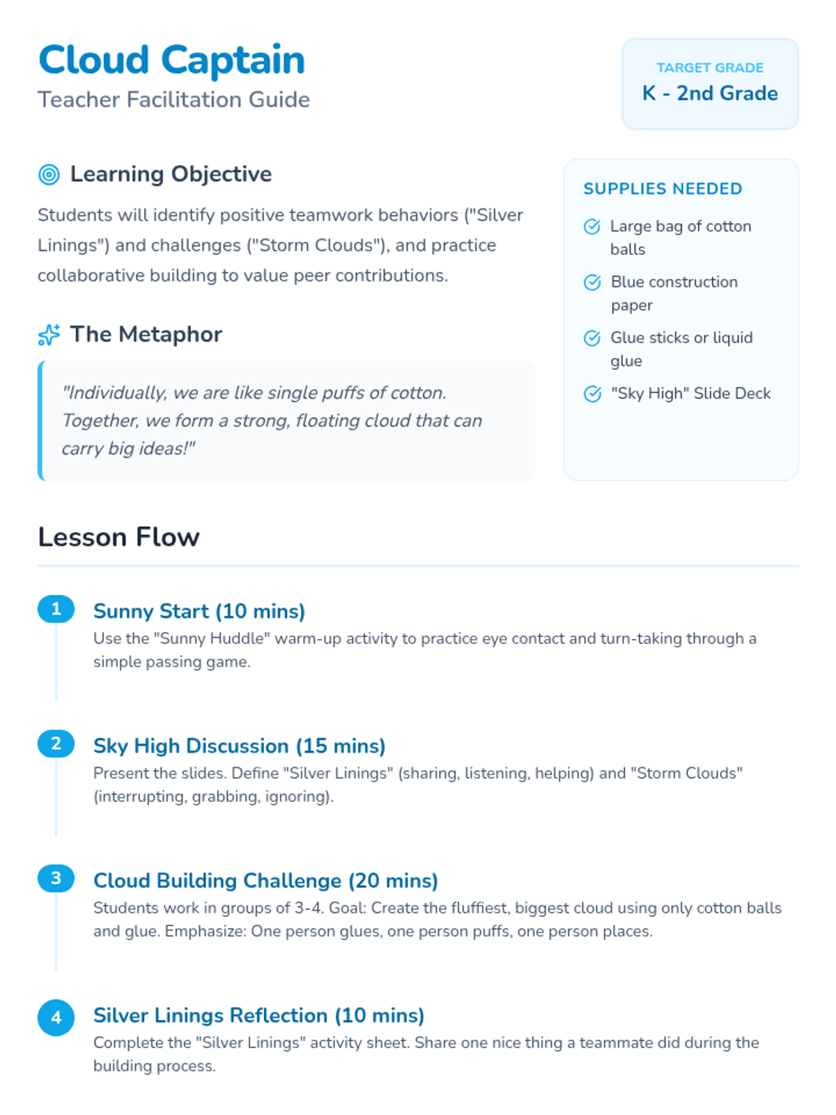 A K-2 lesson on teamwork and collaboration using cloud metaphors to distinguish between positive group behaviors and conflicts. Students engage in cooperative building and reflective sharing to build foundational social-emotional skills.