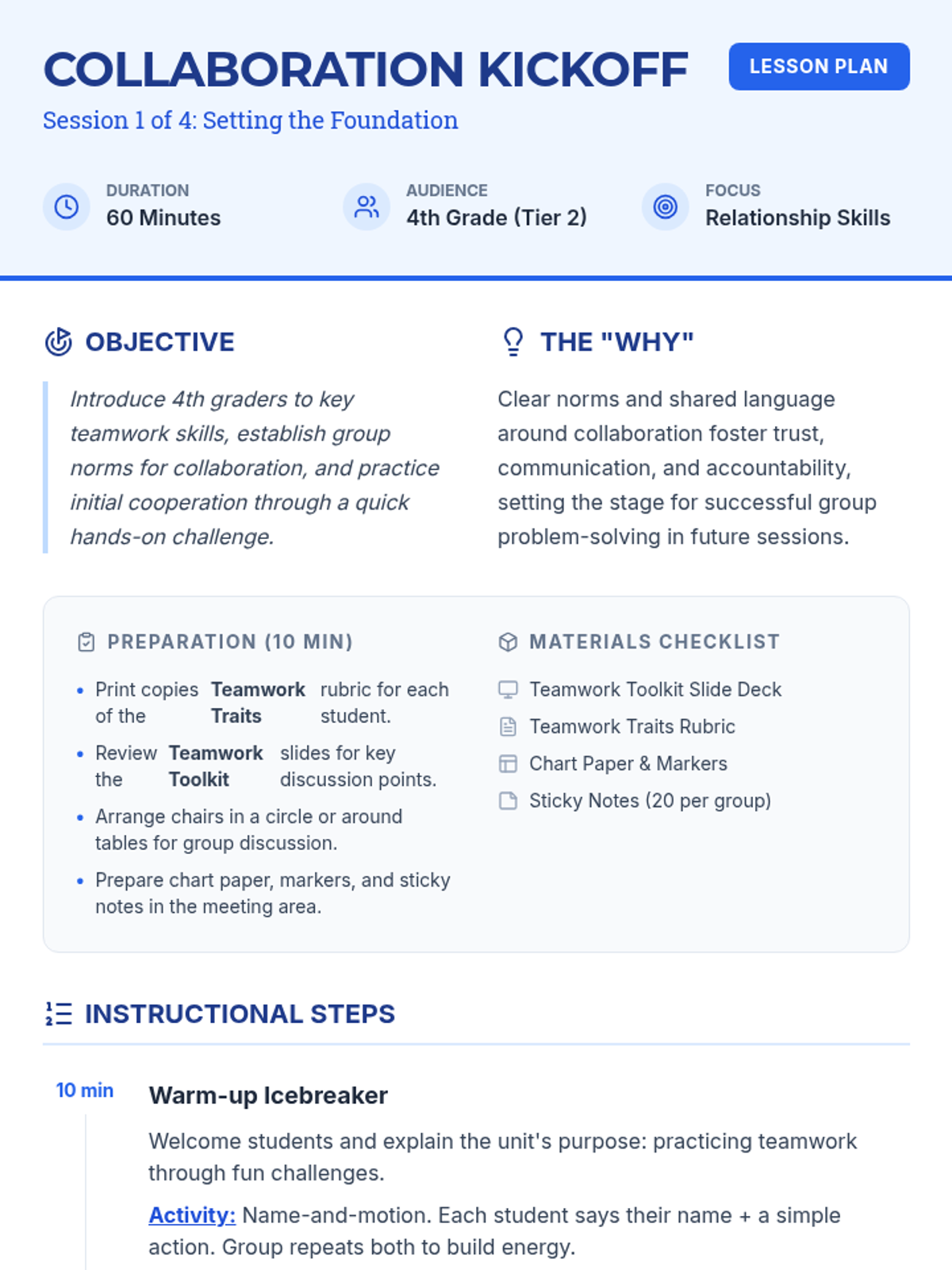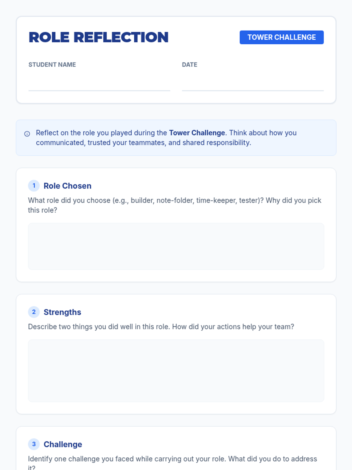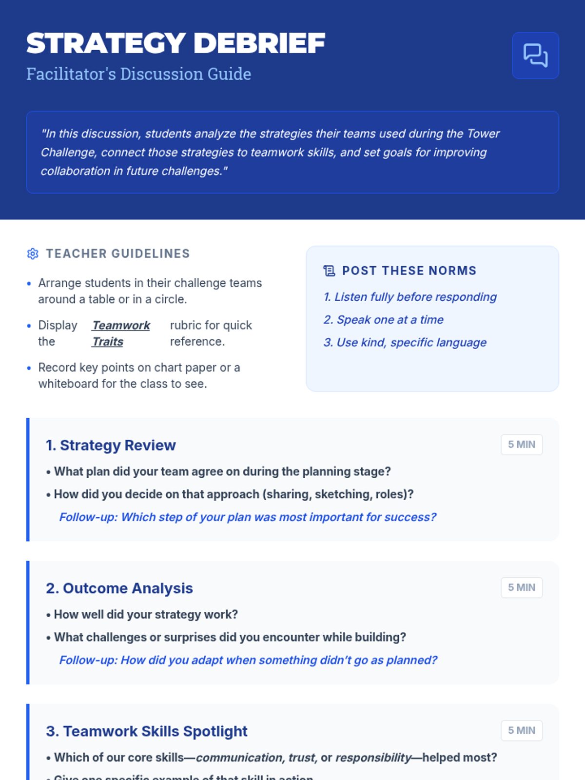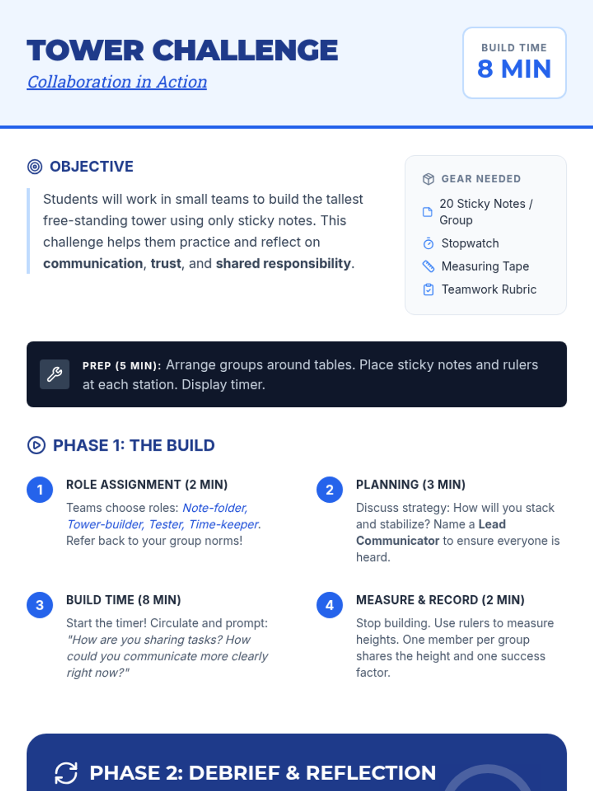 The introductory session where students establish group norms, learn core teamwork vocabulary, and engage in their first collaborative building challenge.