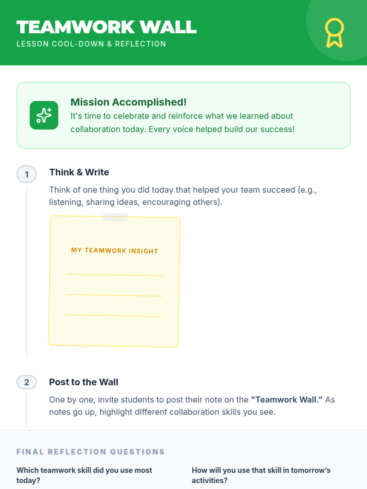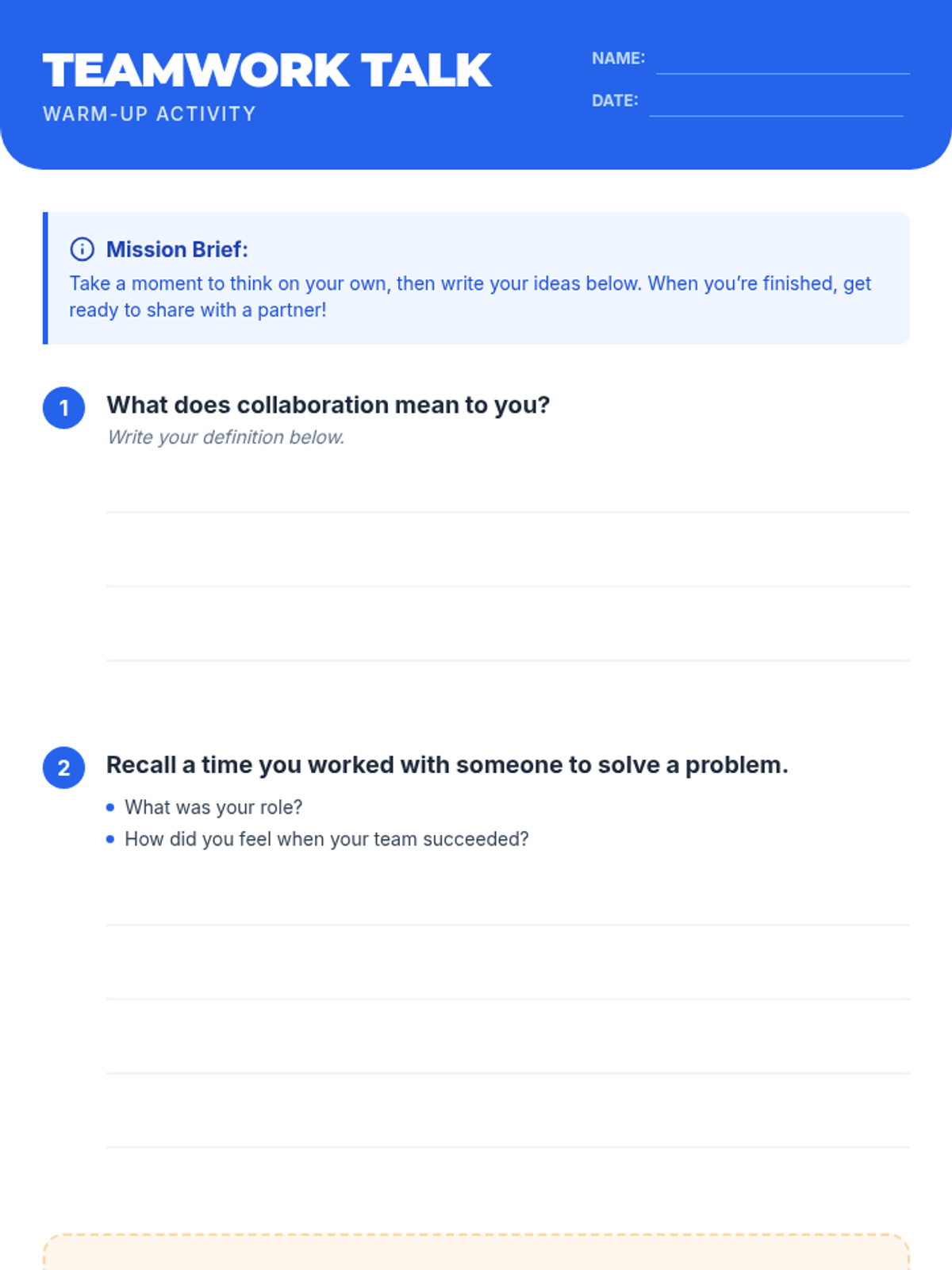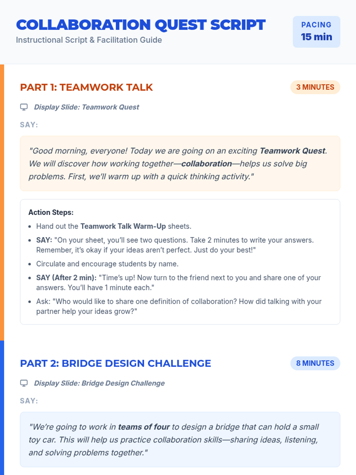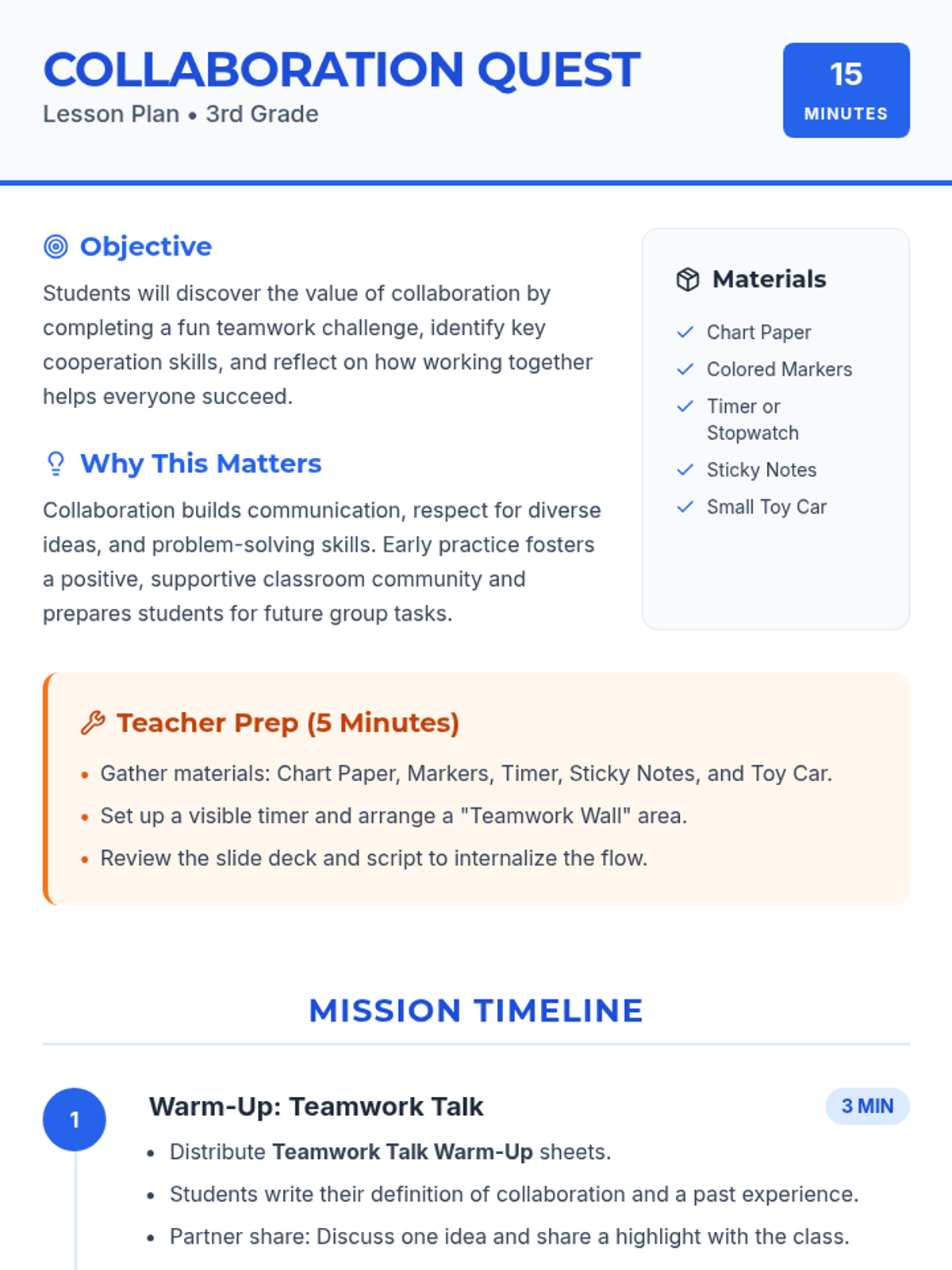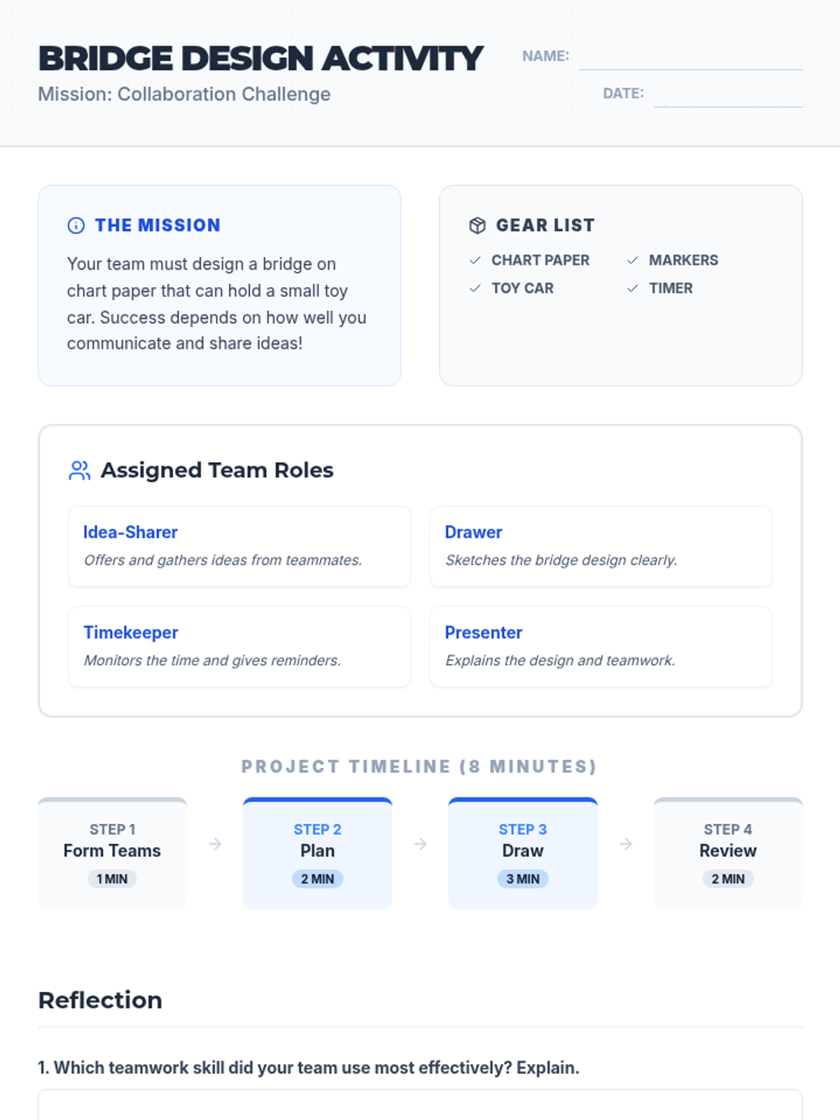 A 15-minute 3rd-grade lesson where students explore collaboration through a bridge-building design challenge, practicing communication and teamwork.