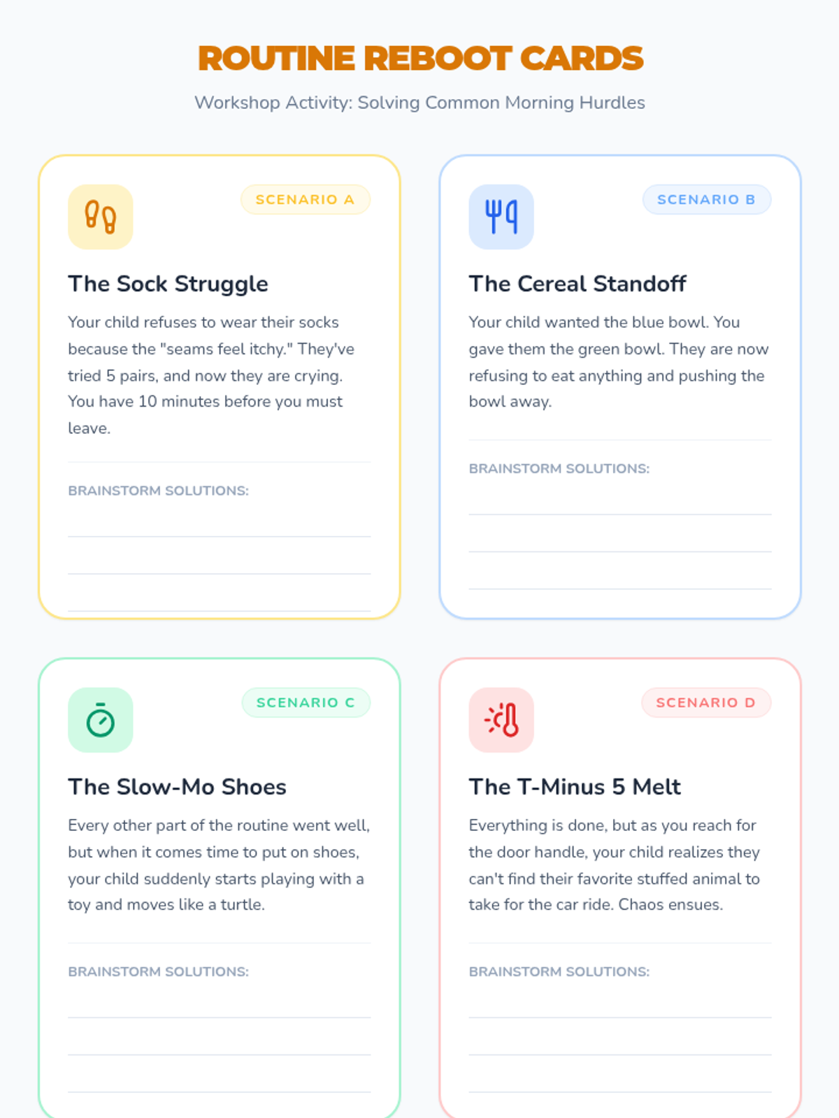 A workshop for parents to learn actionable strategies for creating visual schedules, gentle wake-up techniques, and managing common morning challenges.