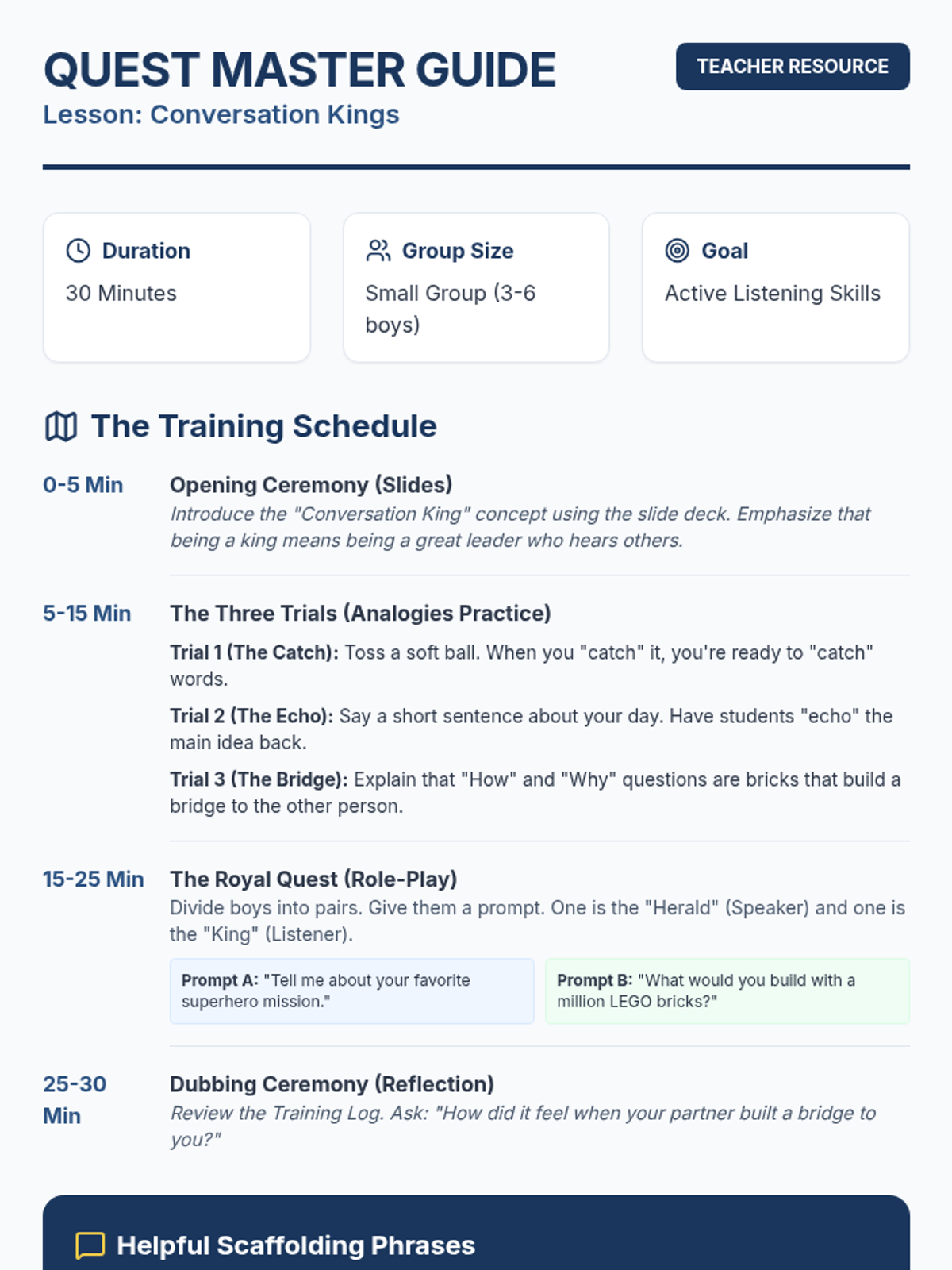 A social skills lesson for young boys (ages 3-6) using a knight-themed quest to teach active listening, paraphrasing, and asking follow-up questions through interactive analogies and role-play.