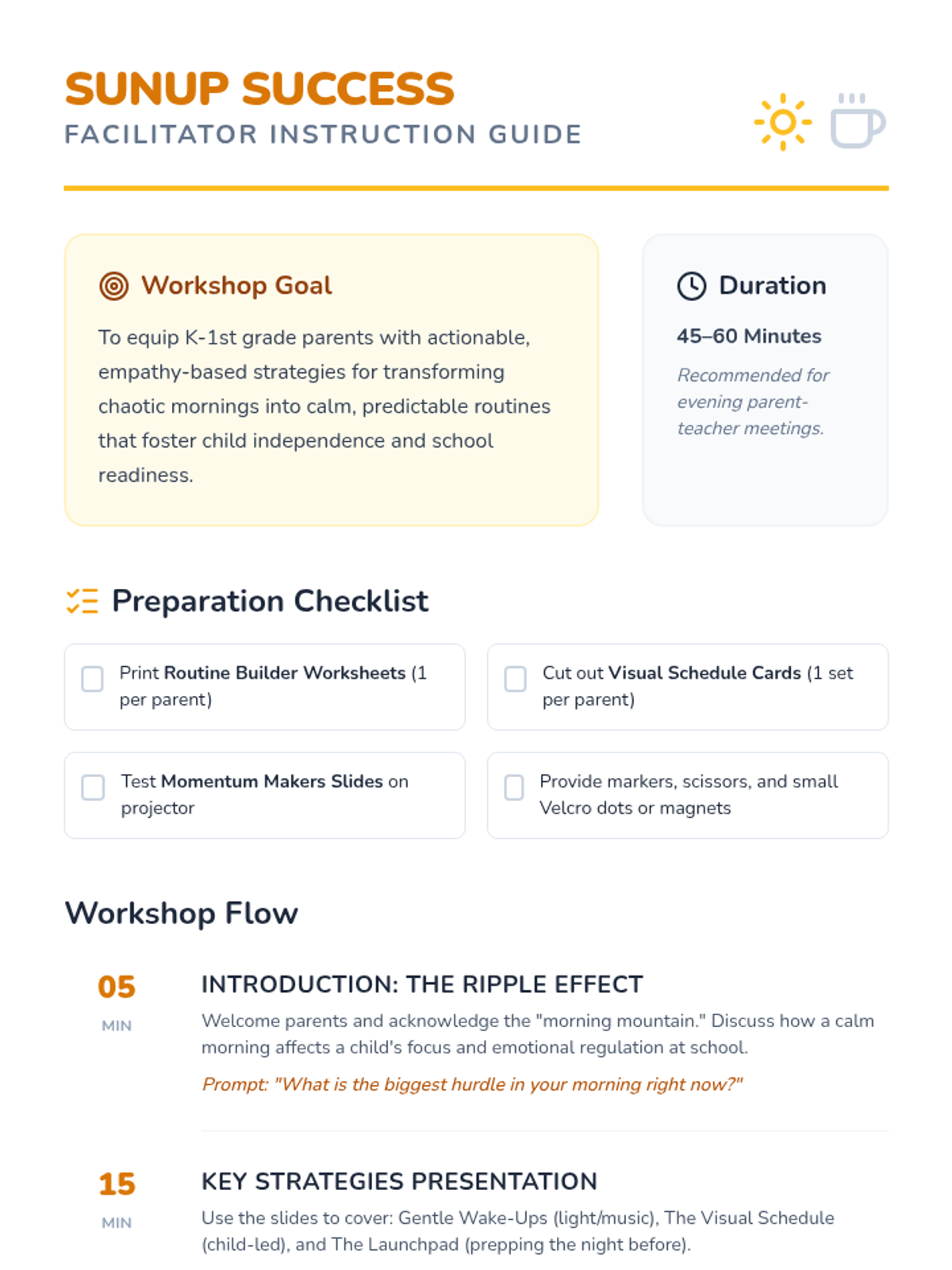 A comprehensive workshop for K-1st grade parents to design stress-free morning routines that foster independence and positive school starts.