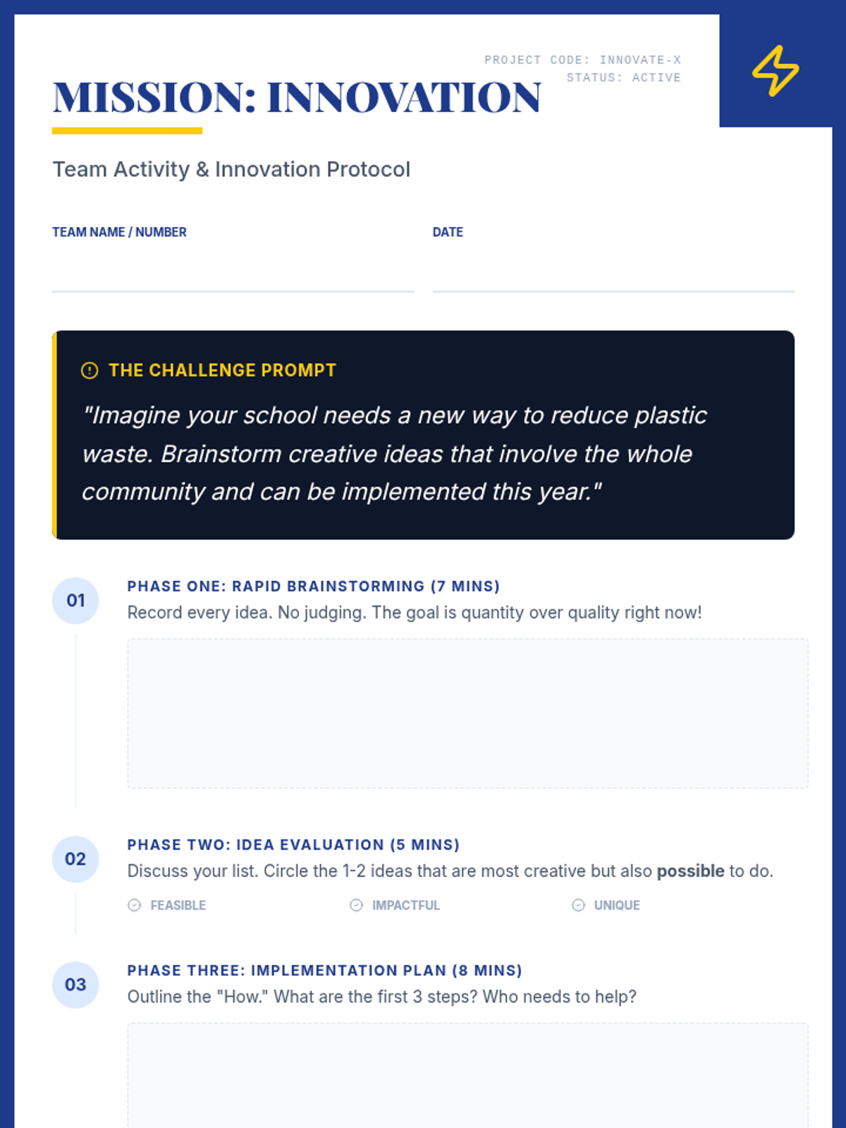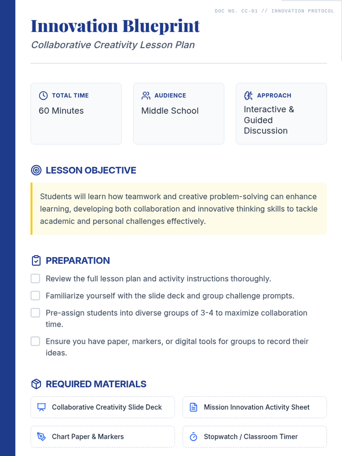 A middle school lesson designed to foster teamwork and creative problem-solving through interactive exercises and structured innovation techniques. Students will learn the benefits of collaboration while working through a real-world creative challenge.